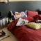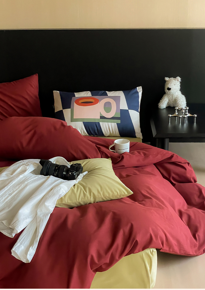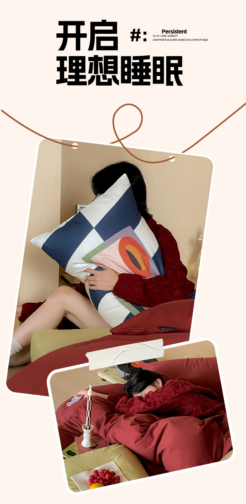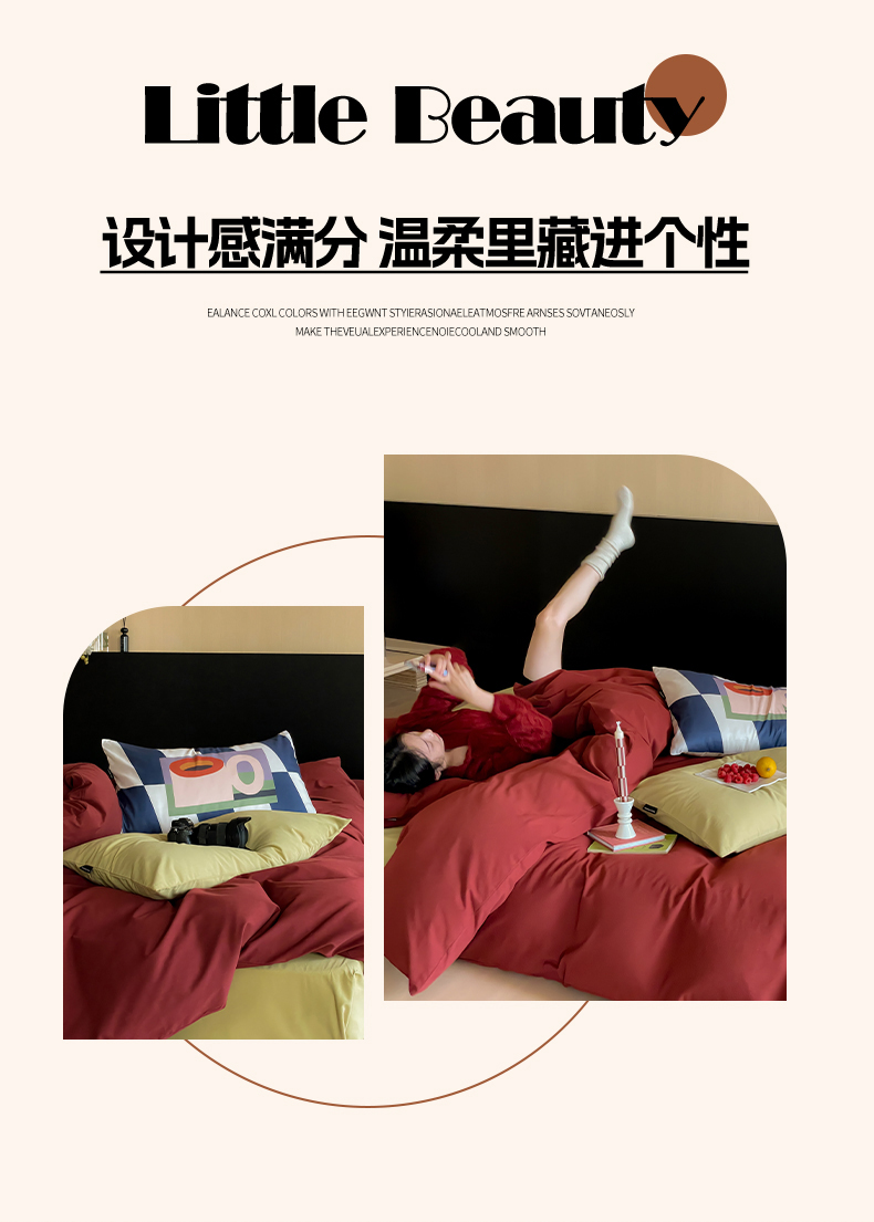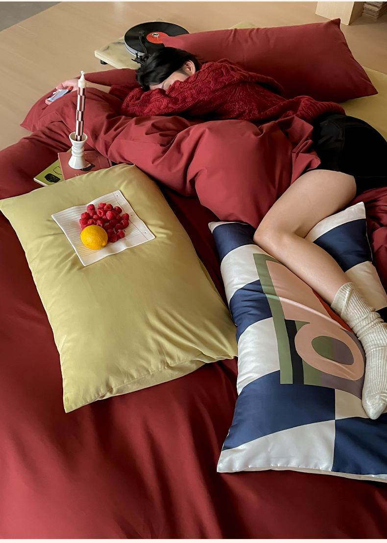 圆岛家纺 2024秋冬新款纯色孟菲斯博主风时尚全棉磨毛五件套 洛可红拼尼罗绿