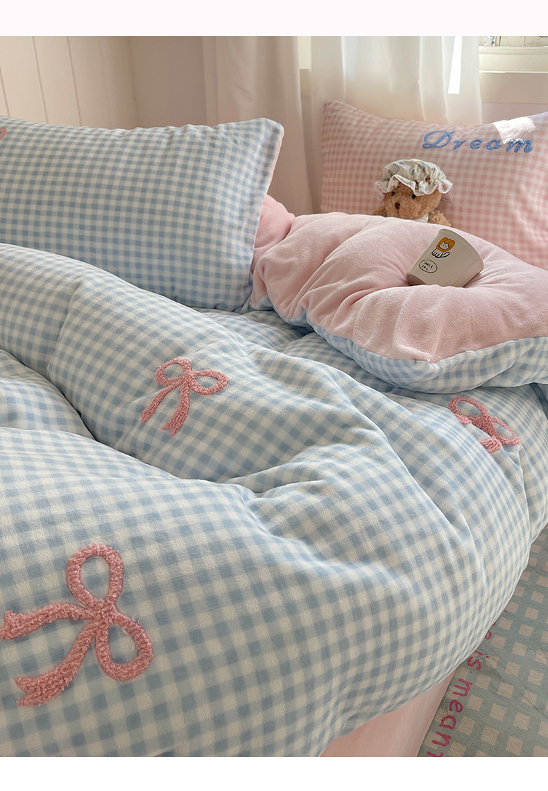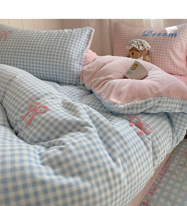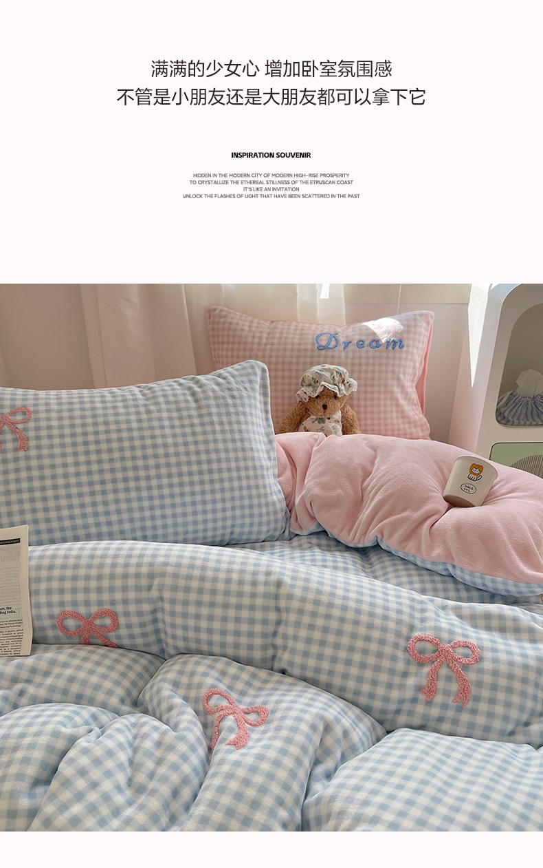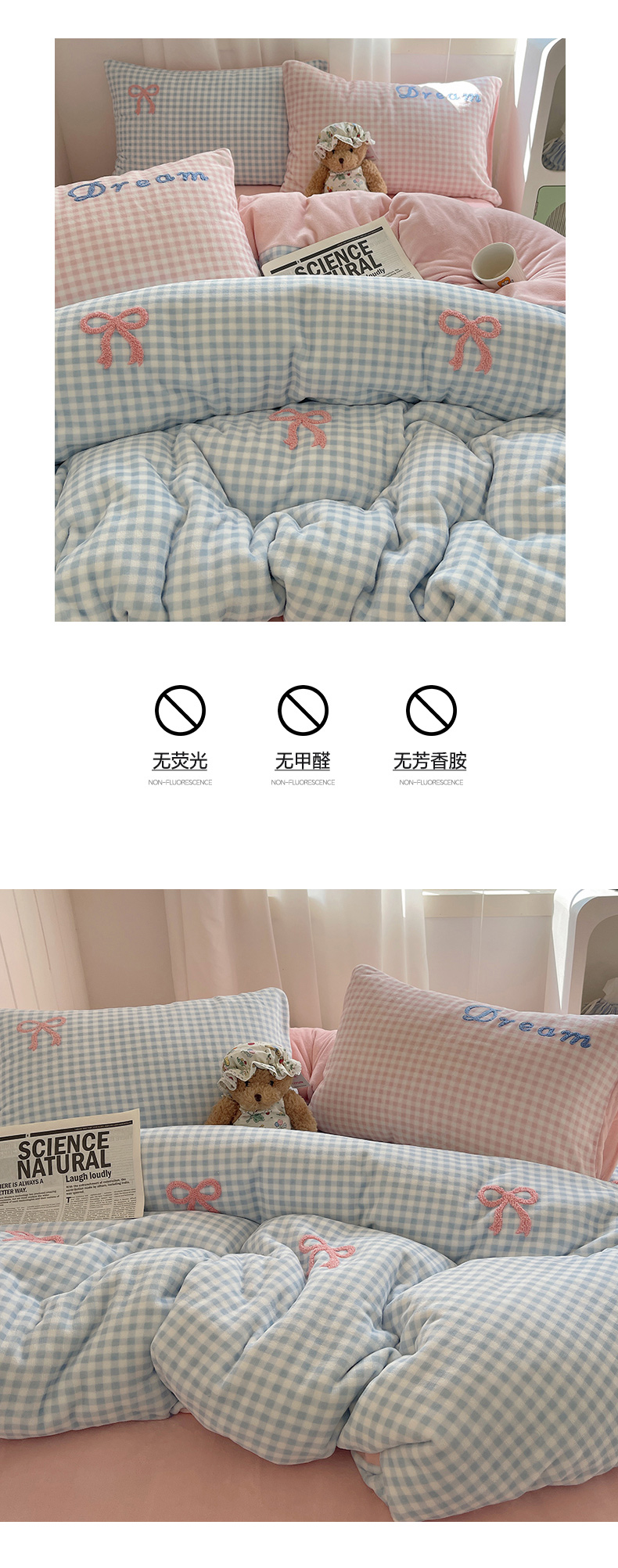 商品名称:顾里家纺 2024新款格子蝴蝶结毛巾绣牛奶绒四件套 蓝格蝴蝶结