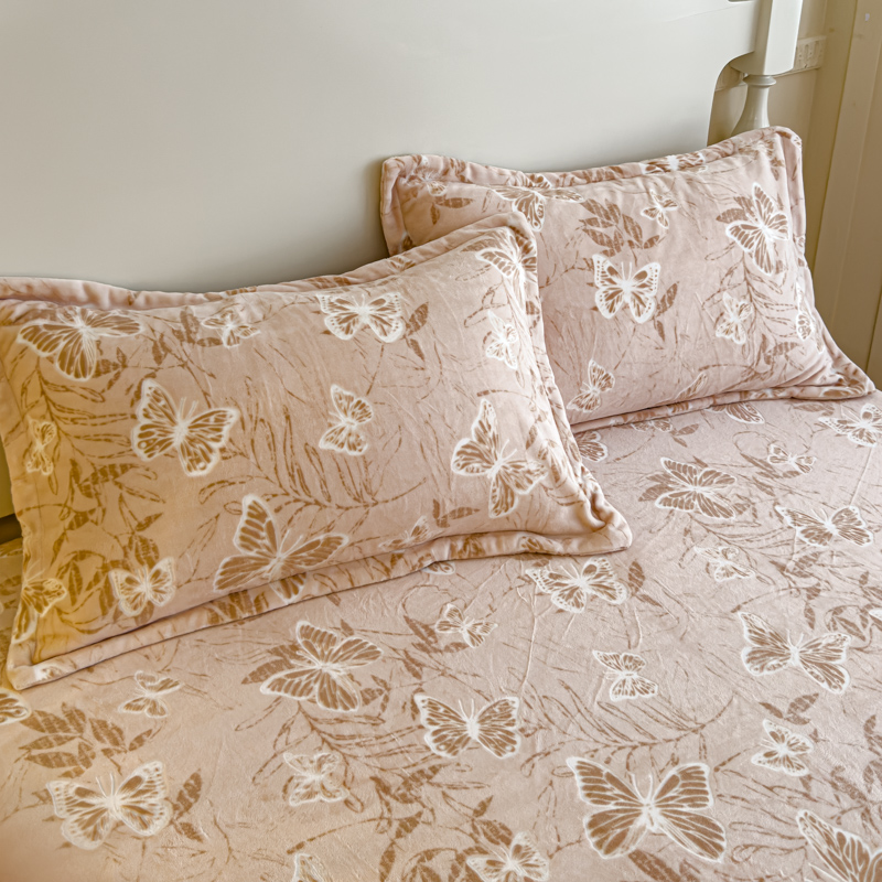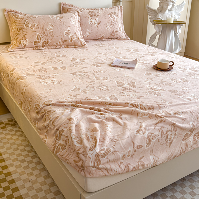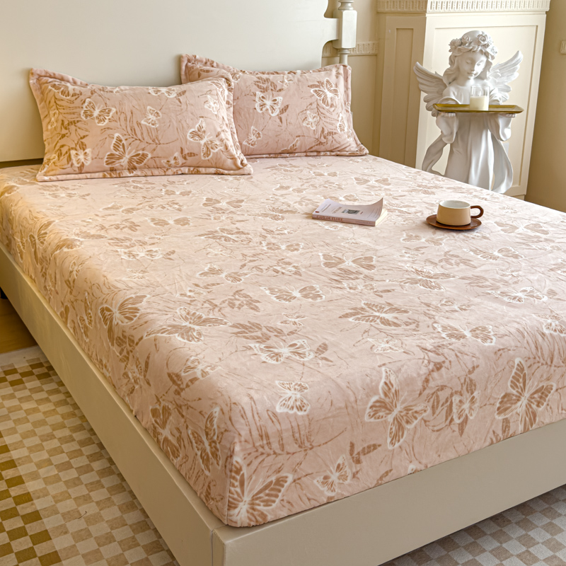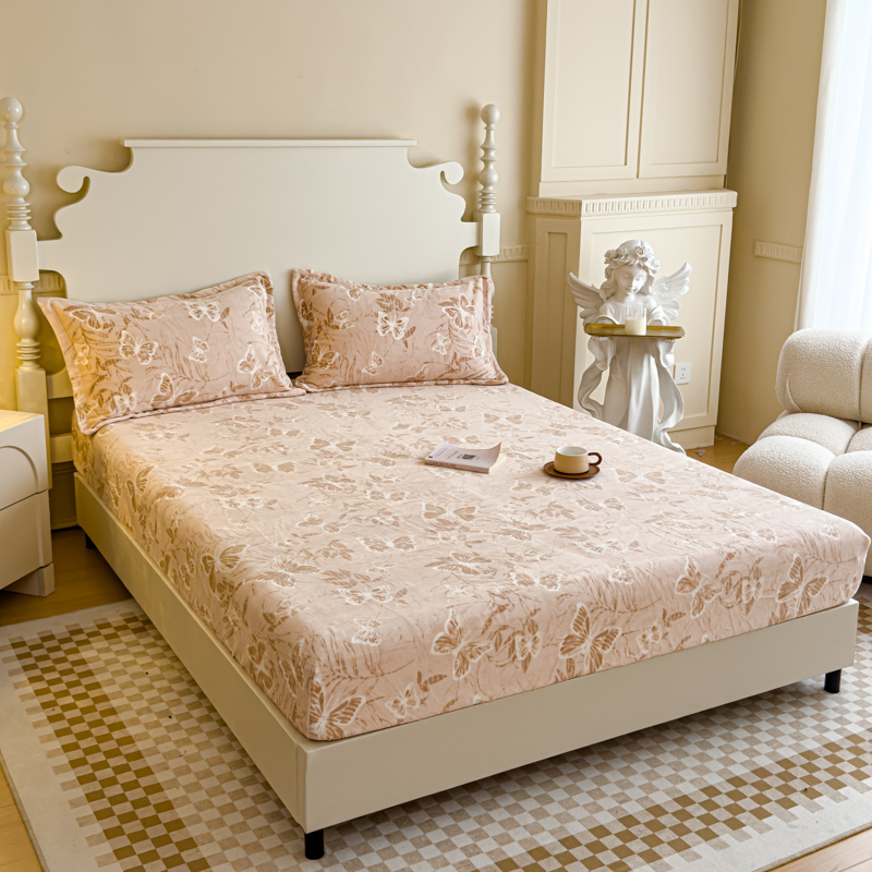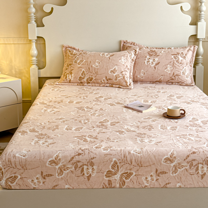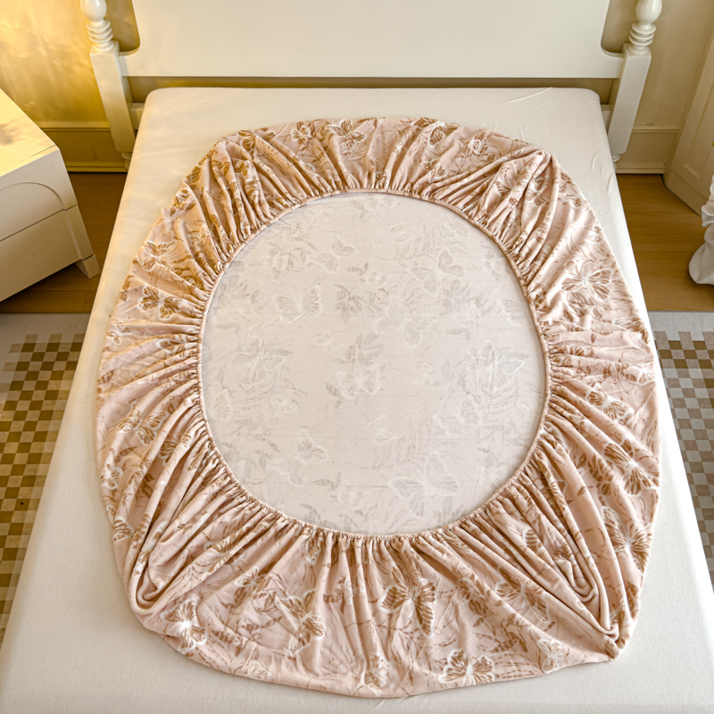 • 91家纺网 家纺一手货源 找家纺 金丝鸟家纺 2024新款加厚240g立体雕花牛奶绒床笠 蝴蝶飞 咖
