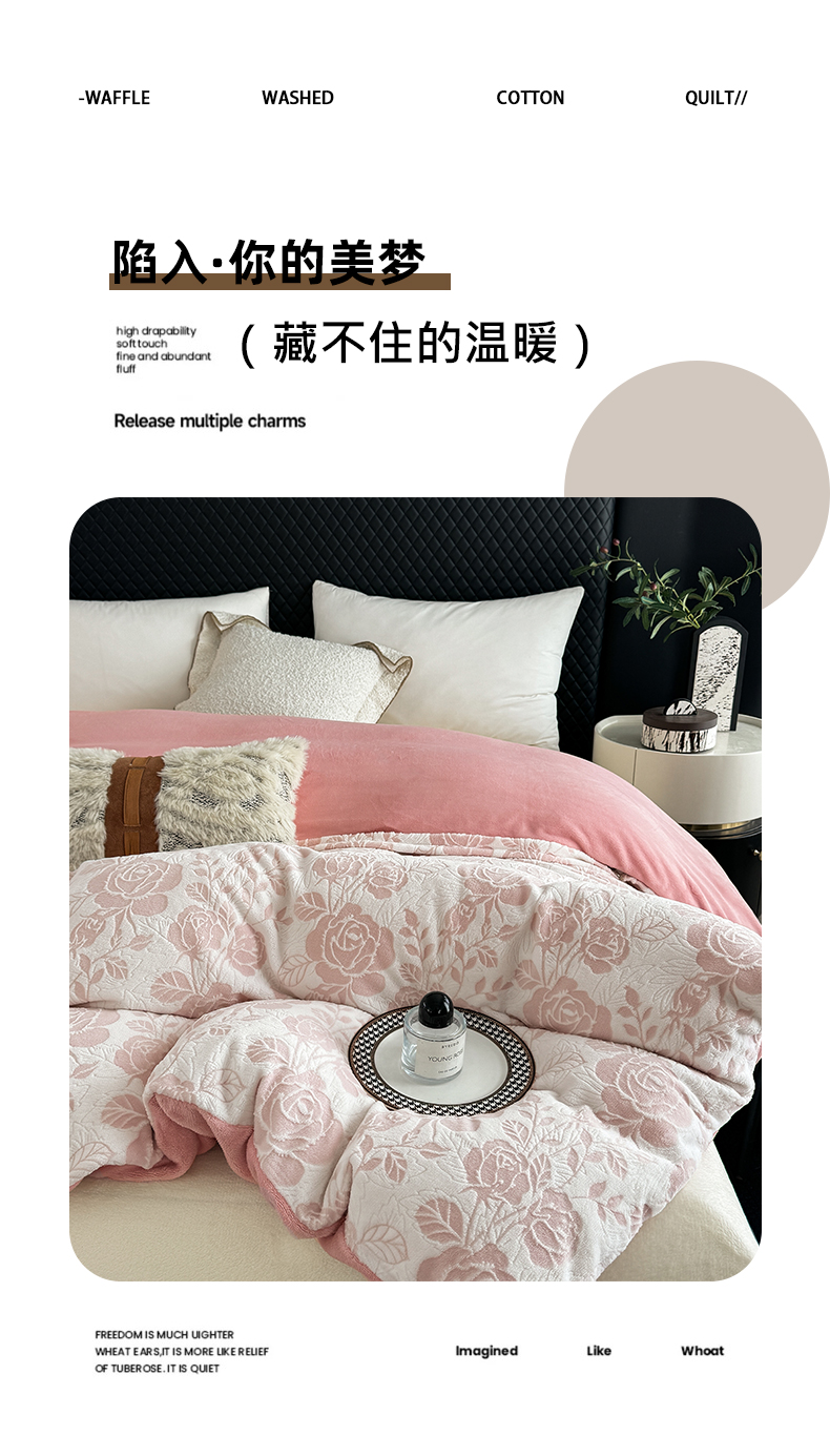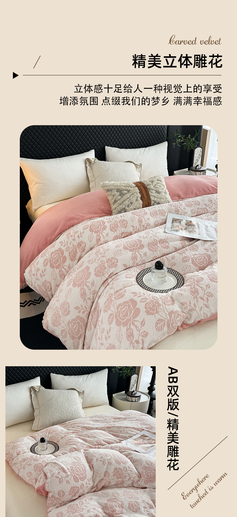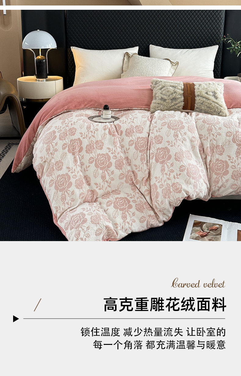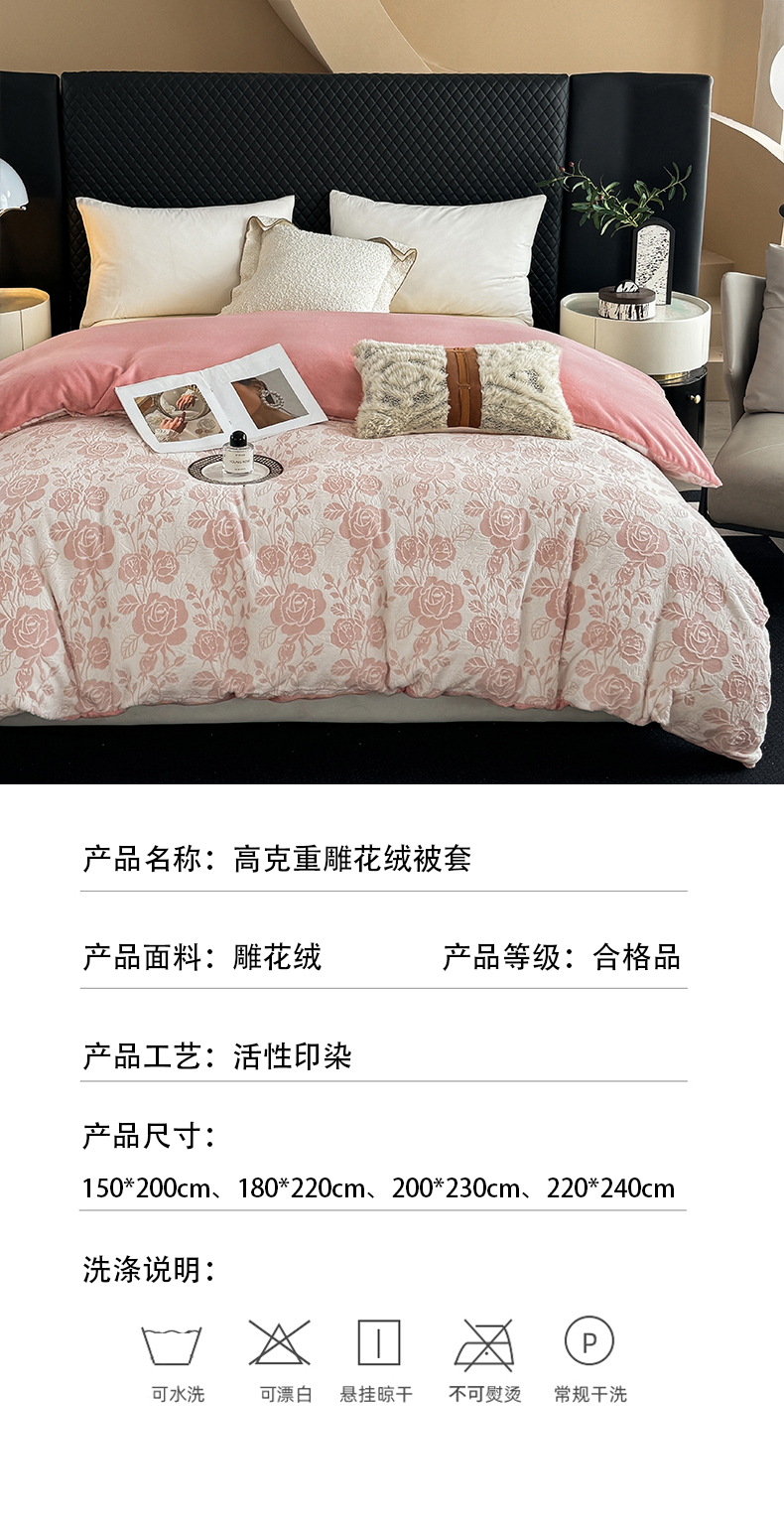 • 91家纺网 家纺一手货源 找家纺 金盛纺 2024新款高克重雕花绒单被套 玫瑰花舞