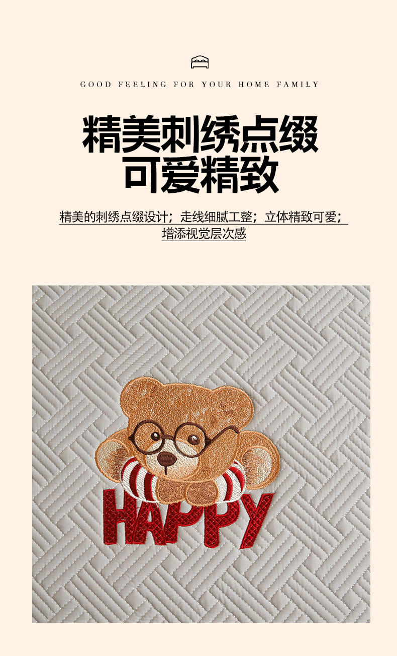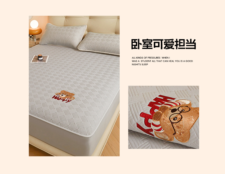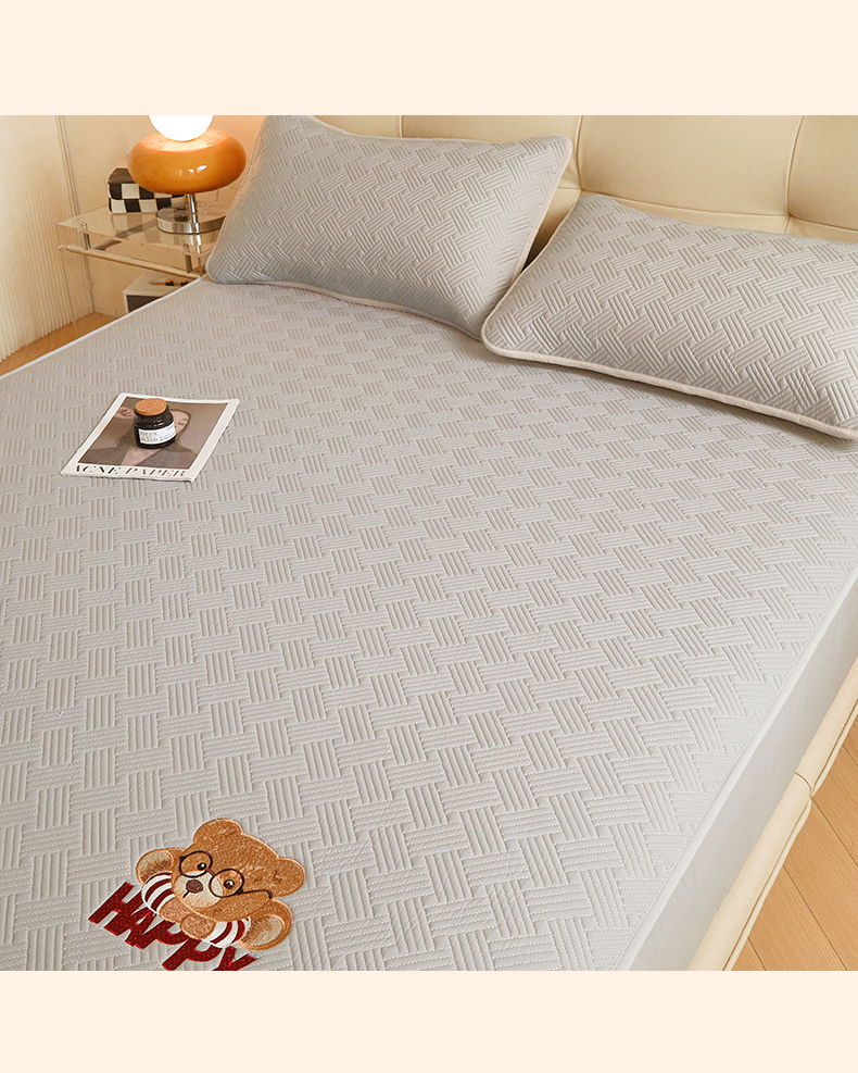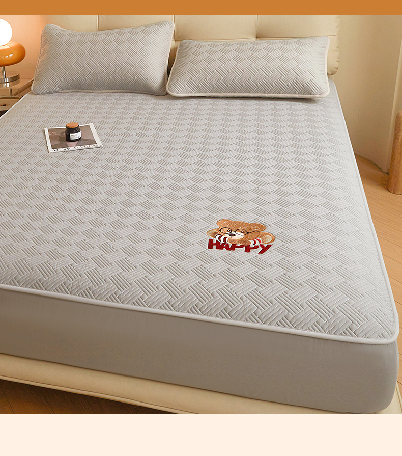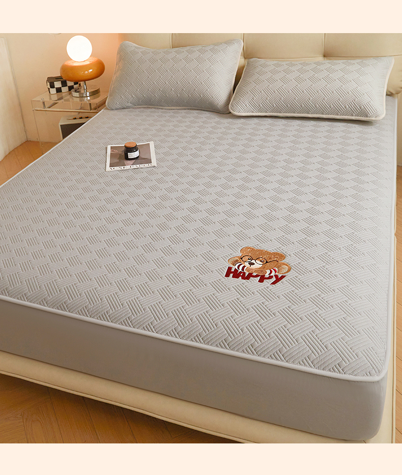 暖季家纺 2025新款40支长绒棉刺绣款全棉夹棉床笠支持定制 博士小熊-山灰