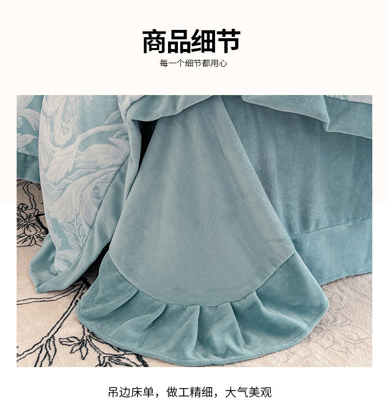 商品名称:慕晨 2024新款高克重全消光A类雕花牛奶绒法式风大宽边拼角吊边床单四件套-风格二 图岚朵-柔雾蓝