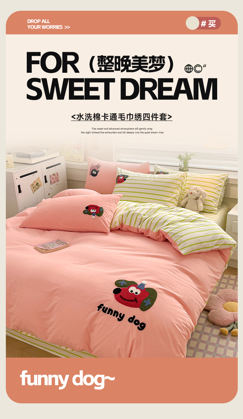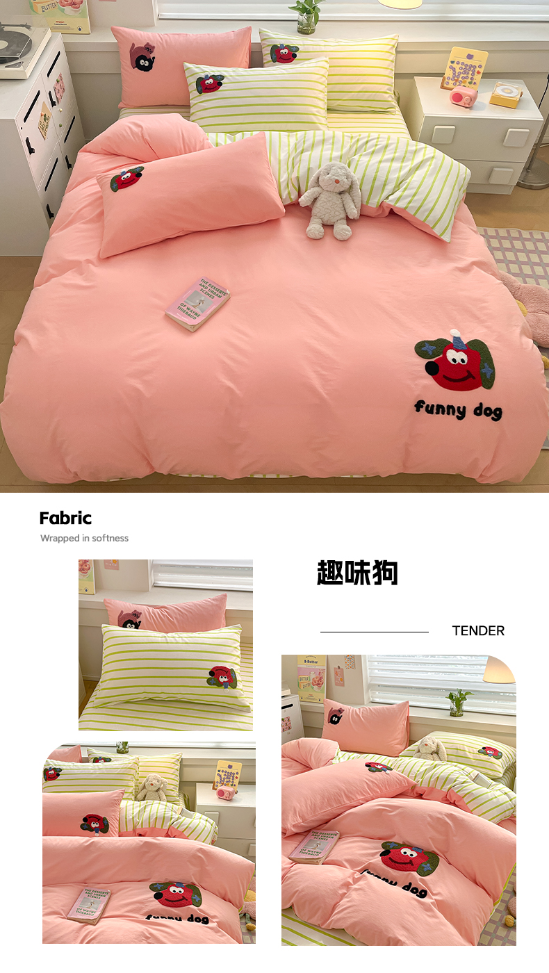 商品名称:雅居纺家纺 2025新款全棉水洗棉绣花四件套 趣味狗