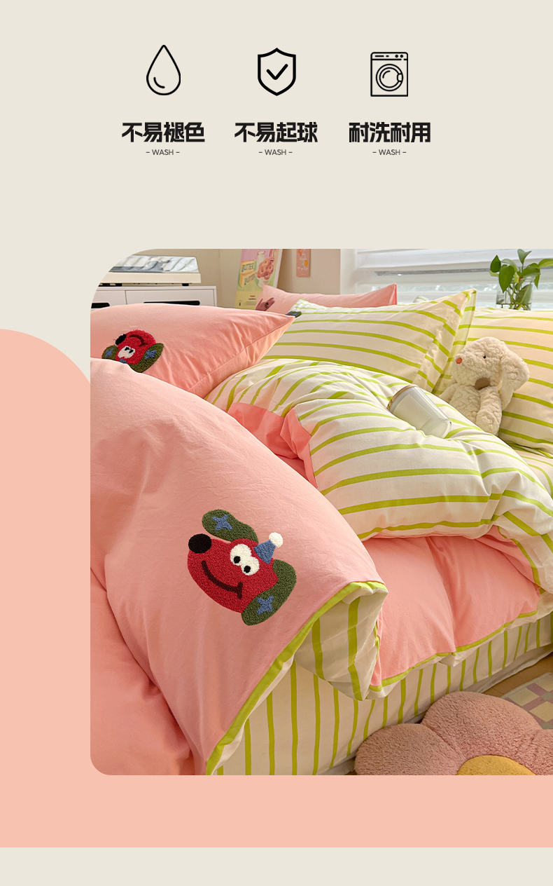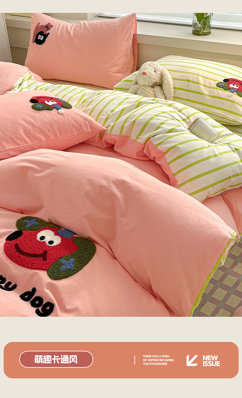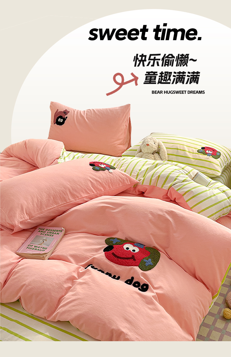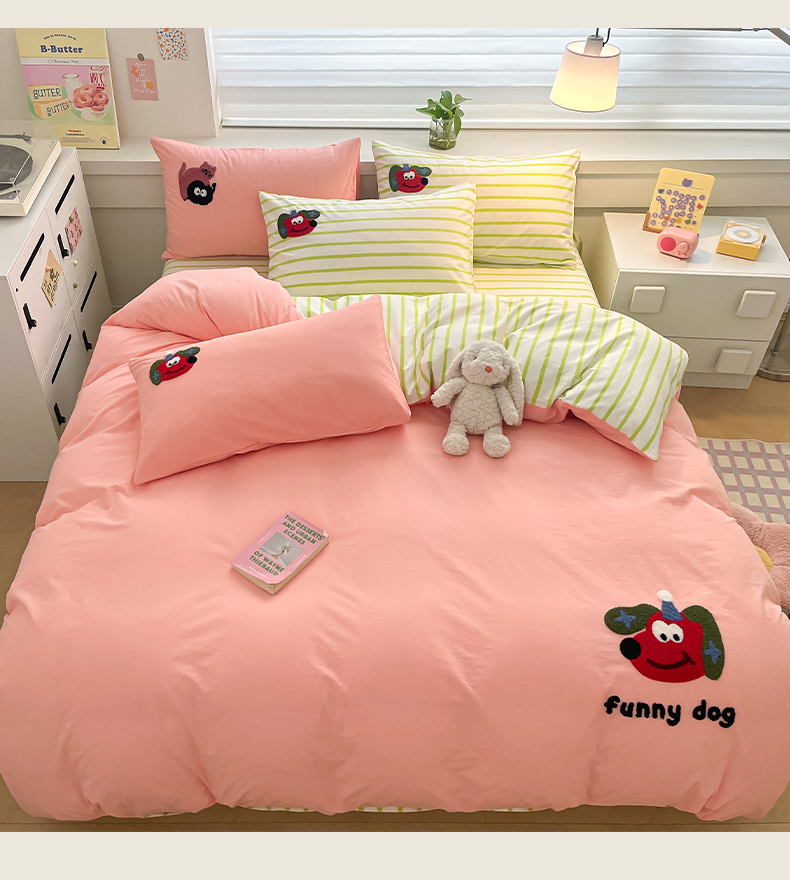 雅居纺家纺 2025新款全棉水洗棉绣花四件套 趣味狗