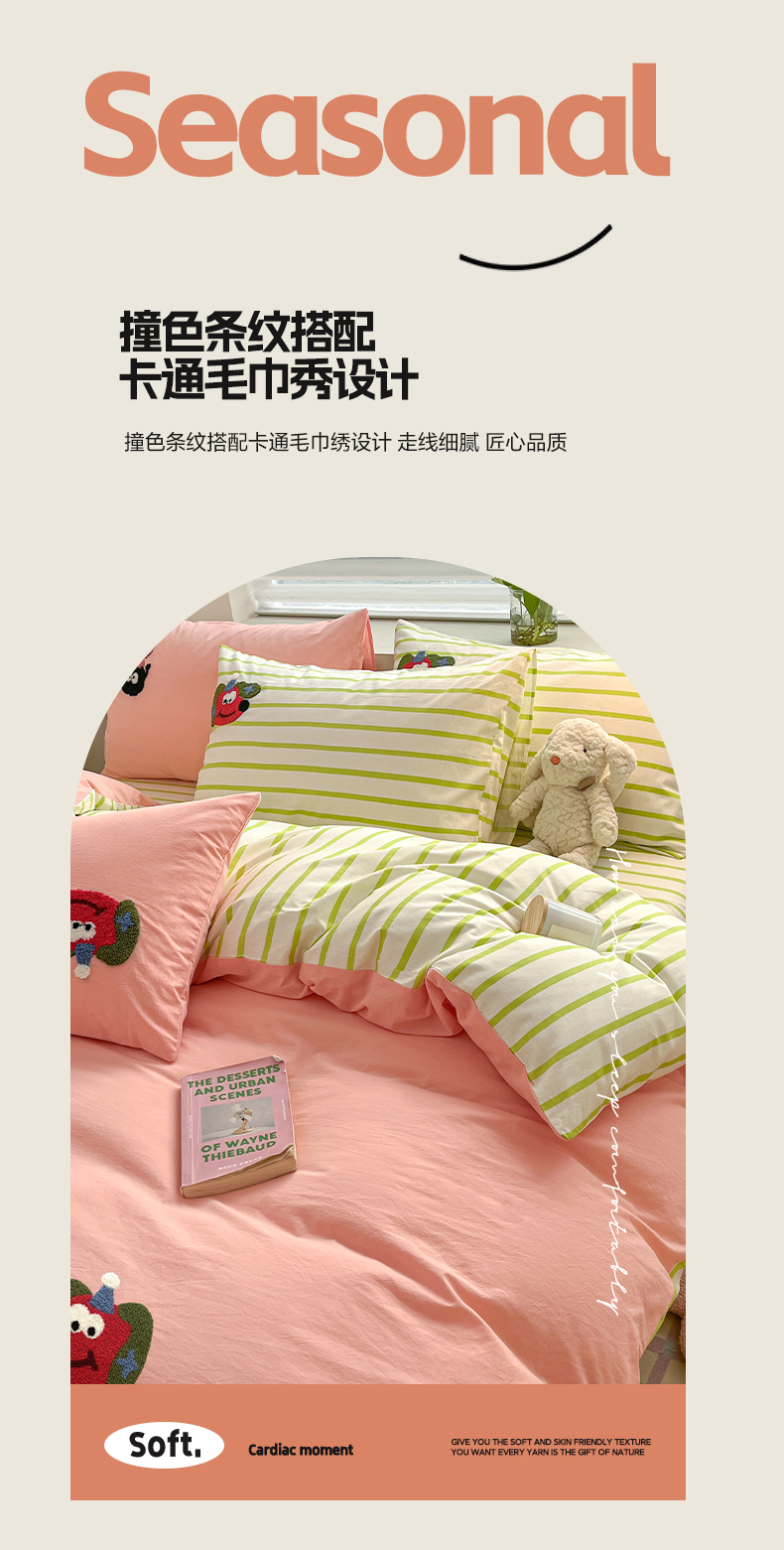 (总)雅居纺家纺 2026新款全棉双层纱毛巾绣四件套,蛋糕猫咪,红苹果小狗,萌宠甜品,早安兔兔