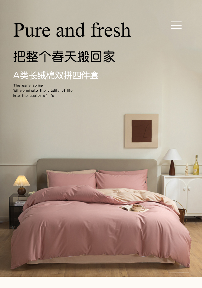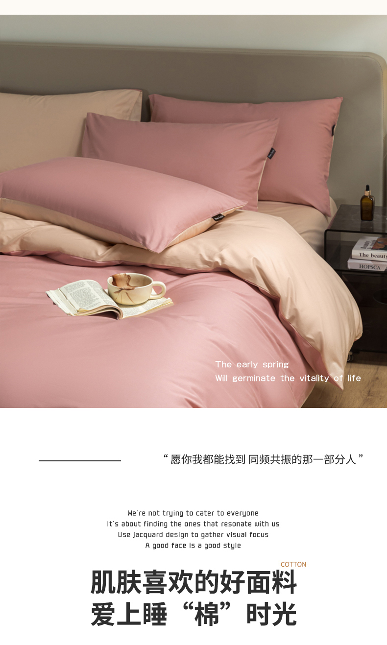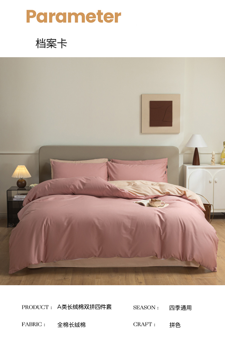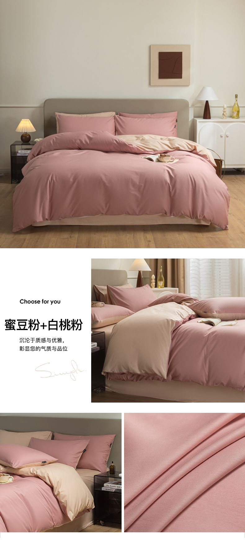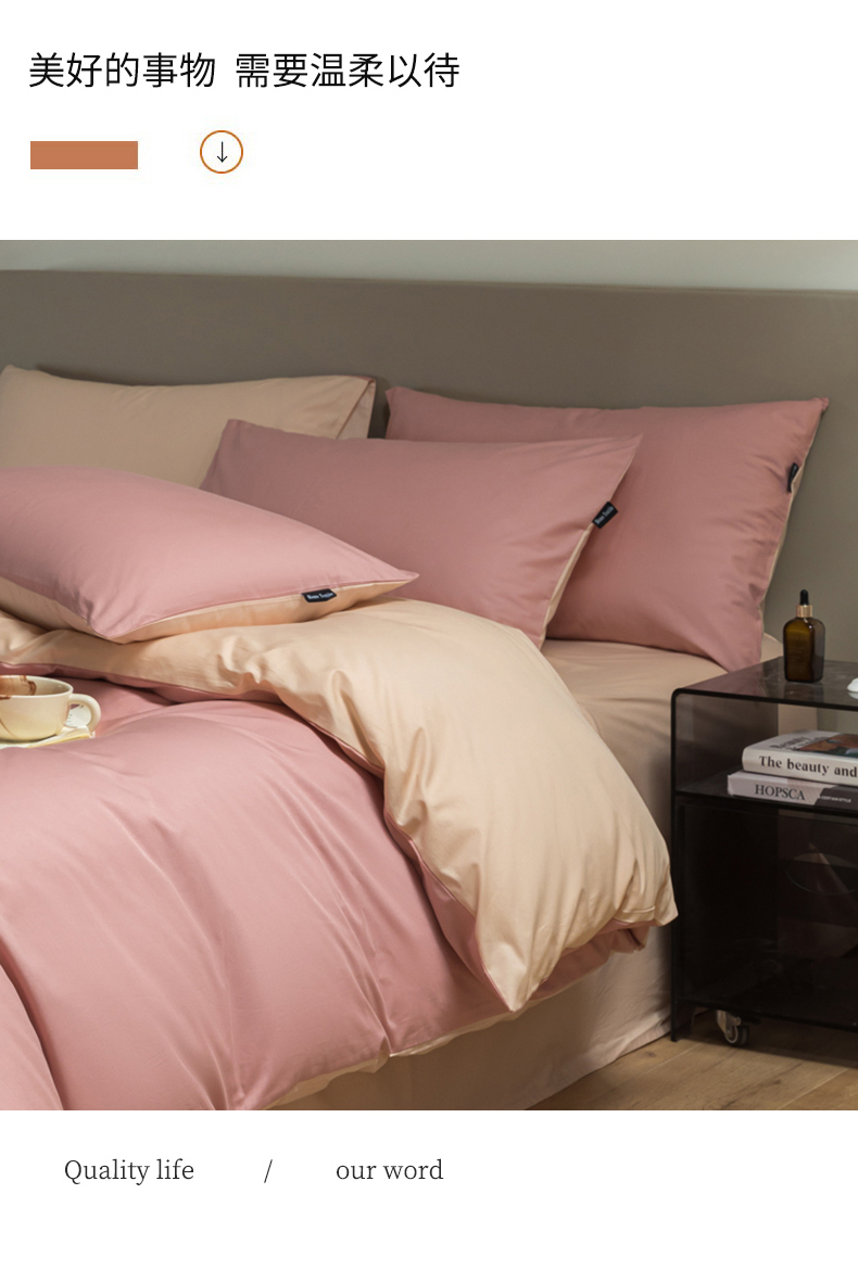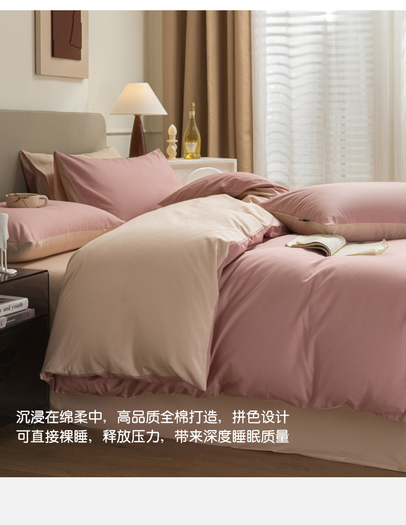 卧趣家纺 2025新品全棉A类长绒棉纯色双拼四件套 蜜豆粉+白桃粉