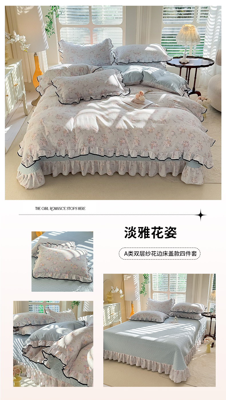 韩约家纺 2025新款1针织双层纱花边款床盖四件套 淡雅花姿(花边款)