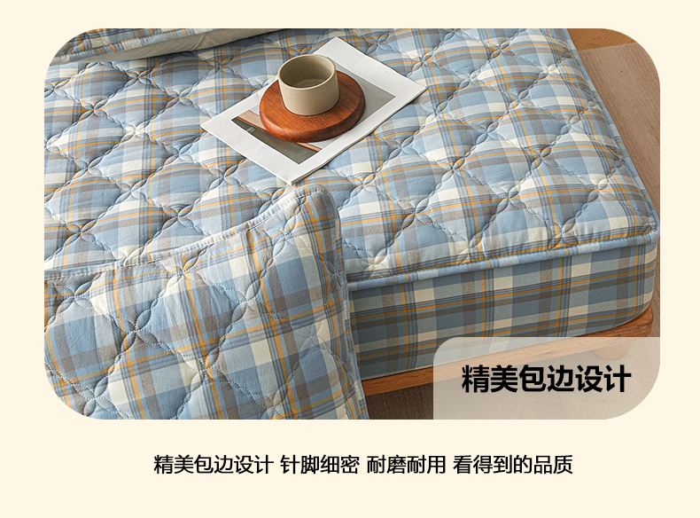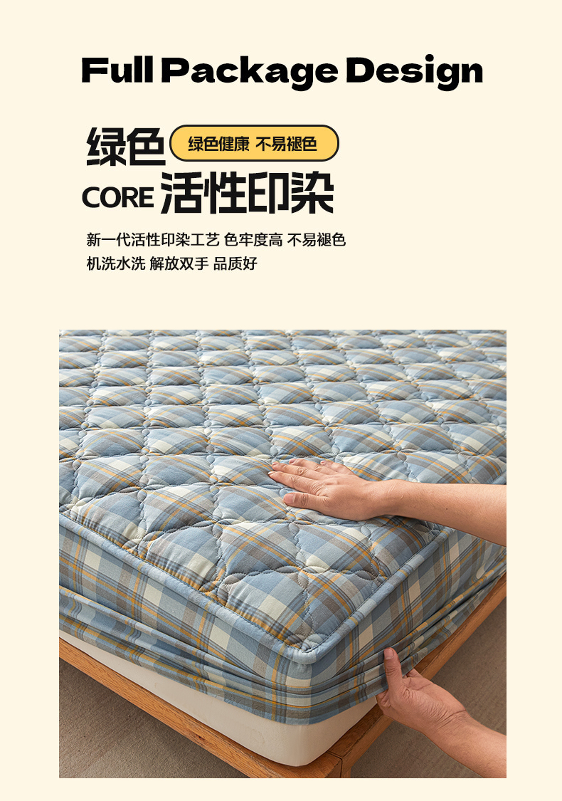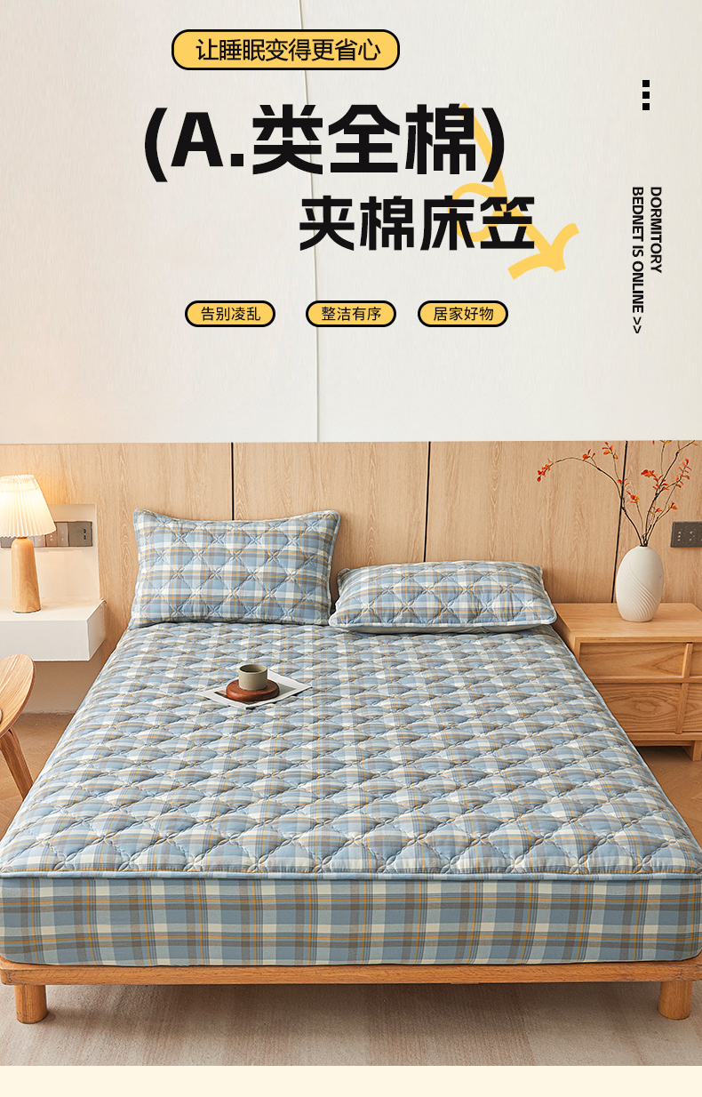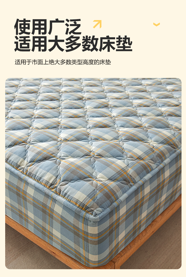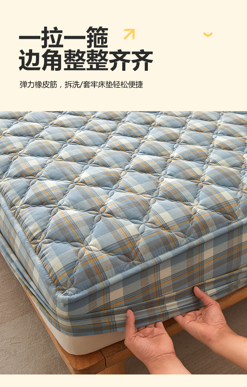 (总)糯米猪家纺 2023新款亲肤棉六面全包夹棉床笠--时尚格,水蓝,深蓝,灰色,白色,米色,粉玉
