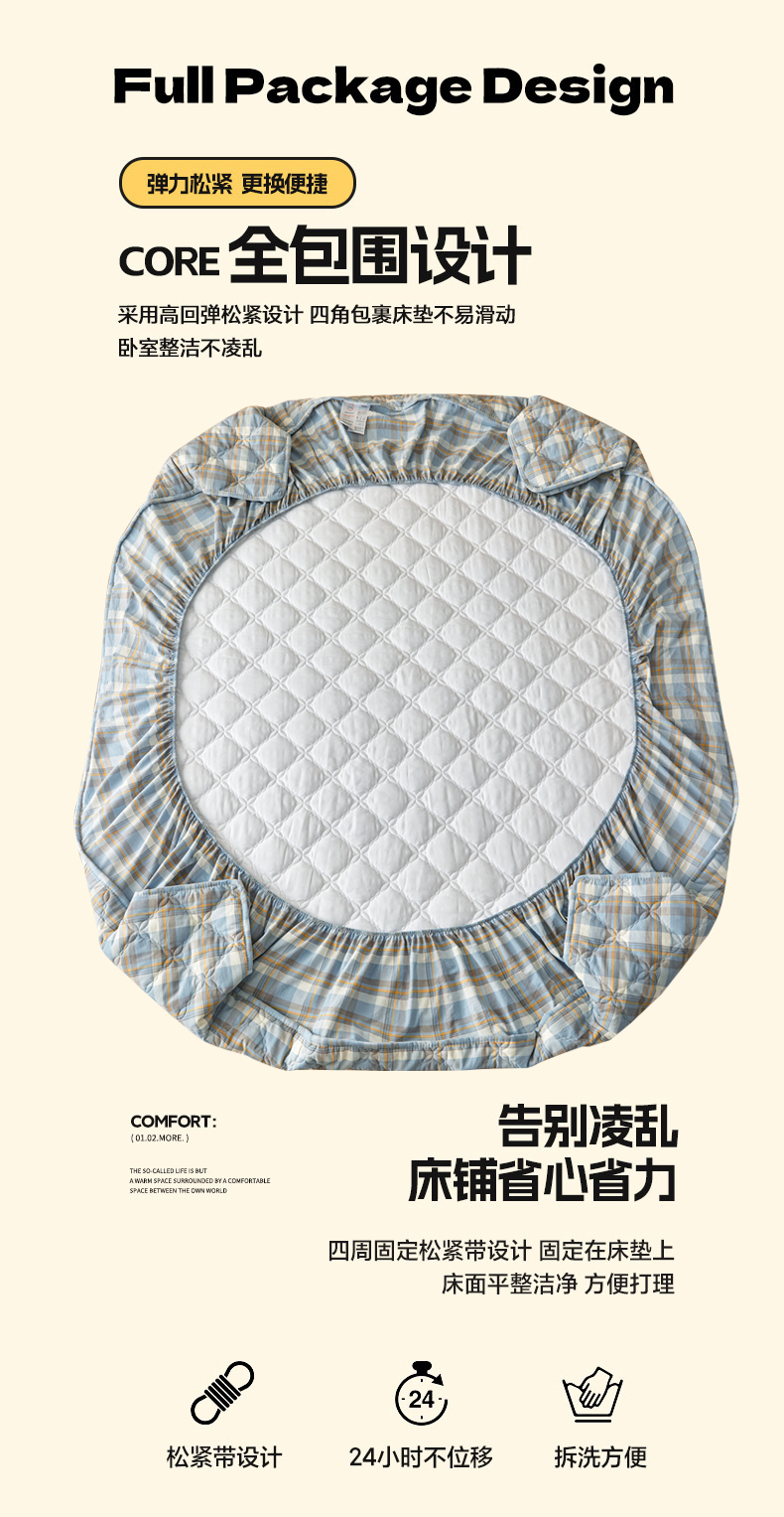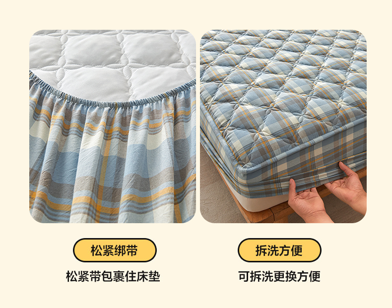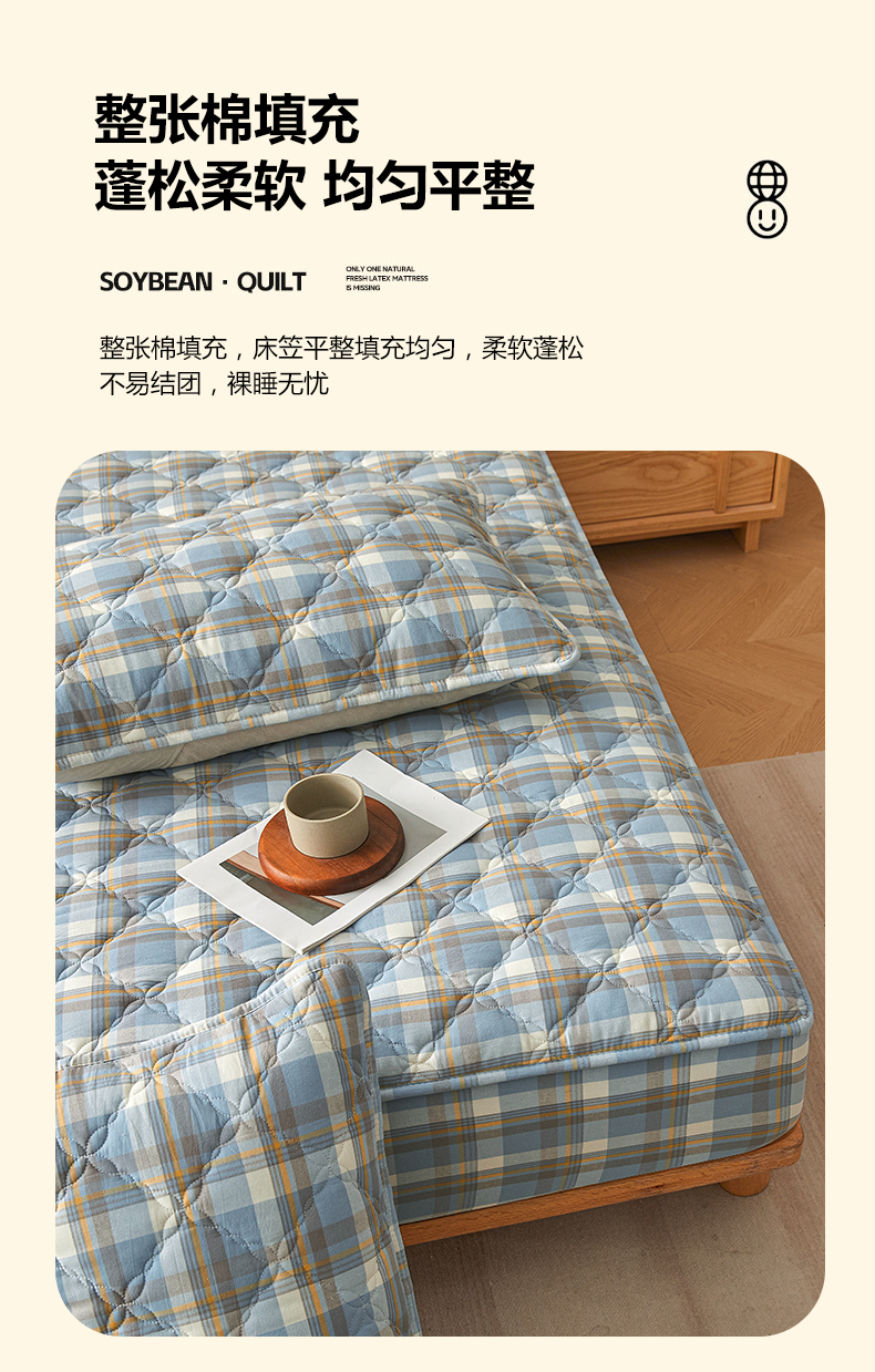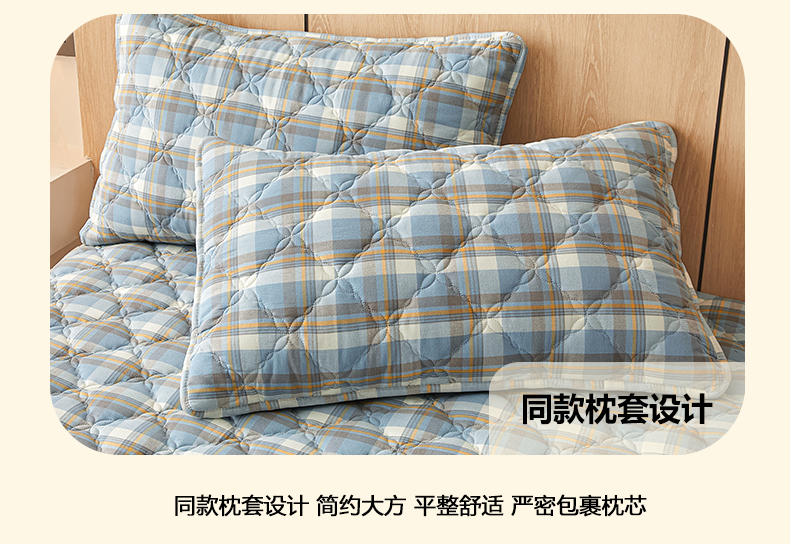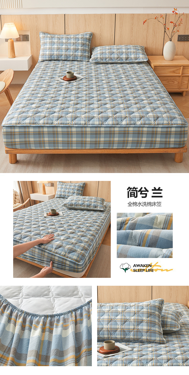 (总)糯米猪家纺 2023新款亲肤棉六面全包夹棉床笠--时尚格,水蓝,深蓝,灰色,白色,米色,粉玉