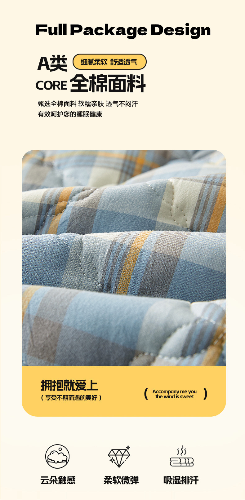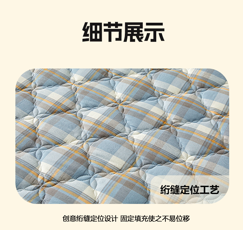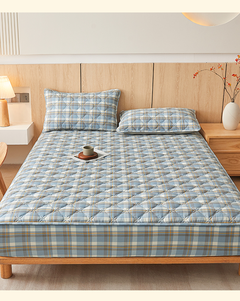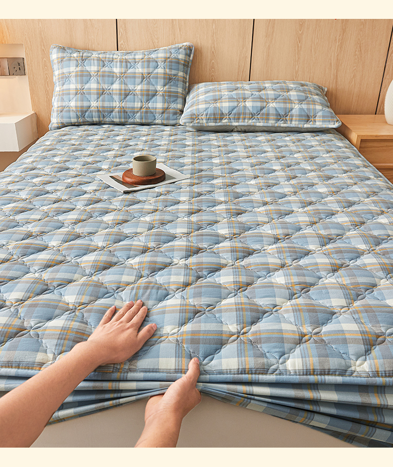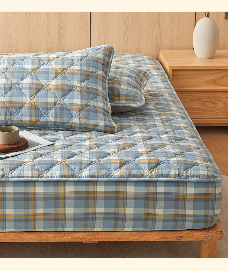 (总)糯米猪家纺 2023新款亲肤棉六面全包夹棉床笠--时尚格,水蓝,深蓝,灰色,白色,米色,粉玉