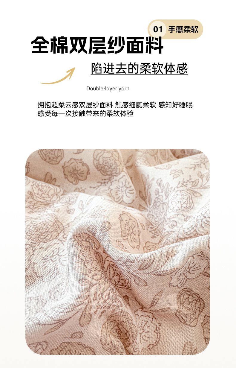 商品名称:喜四方 2025新款全棉A类母婴级抗菌全棉双层纱四件套 阿勒泰牧场-咖
