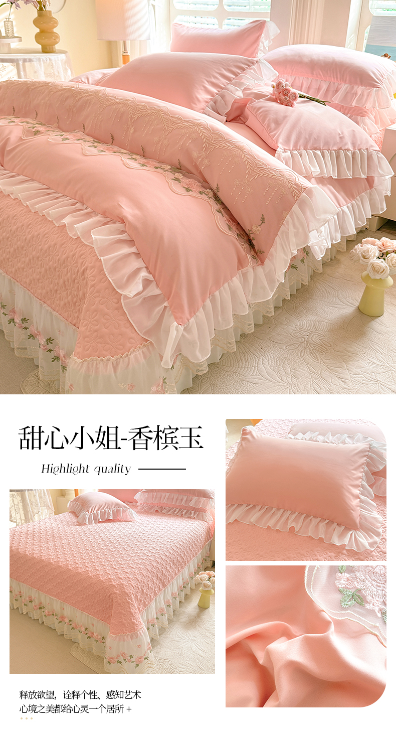 (总)大麦家纺2025新款年新款亲肤花边款床盖四件套 ,甜心小姐-梵星蓝,甜心小姐-落日橘,甜心小姐-奶昔白,甜心小姐-青提绿,甜心小姐-香槟玉,甜心小姐-香芋紫,甜心小姐-樱花粉