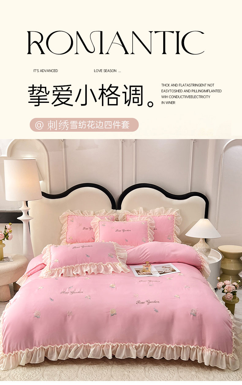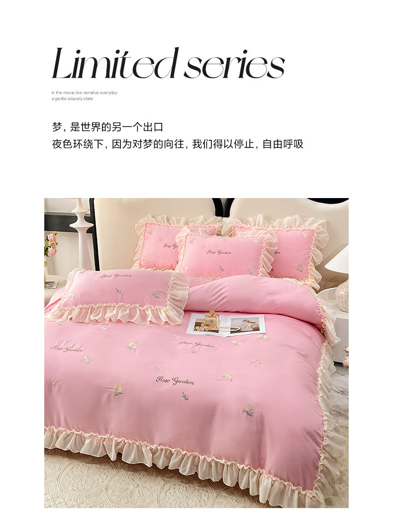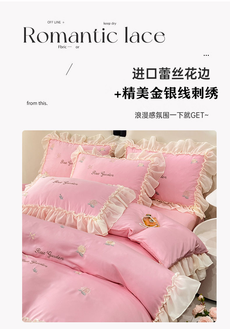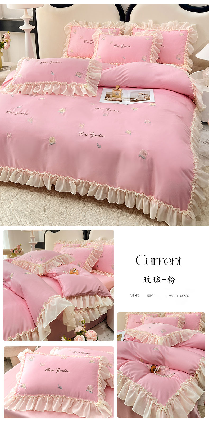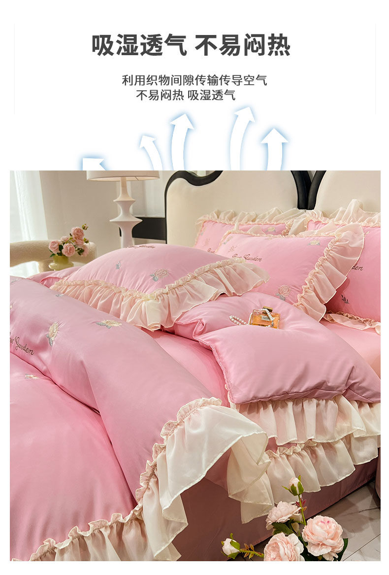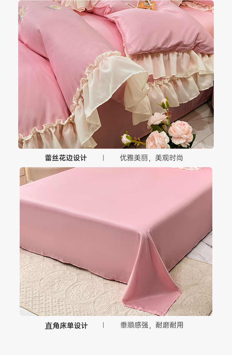 商品名称:花香四季家纺 2025新款法式蕾丝裙边刺绣仙女公主风四件套 玫瑰粉