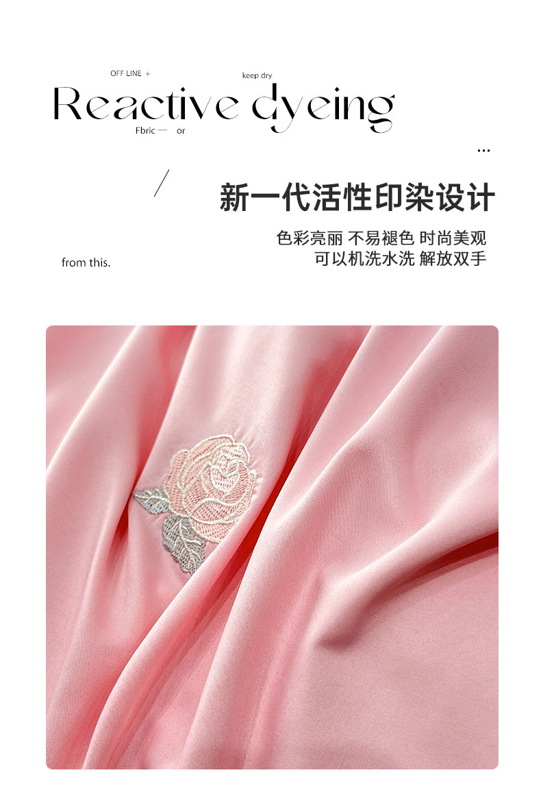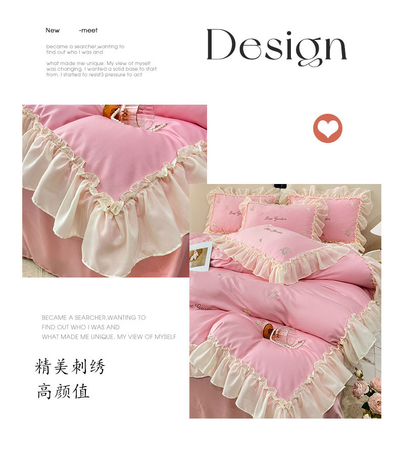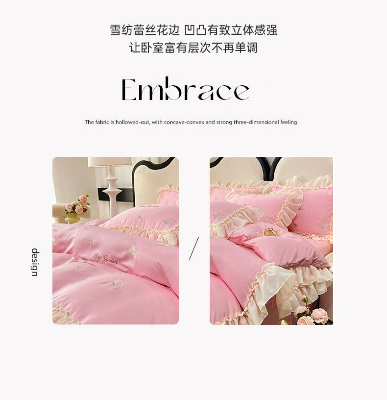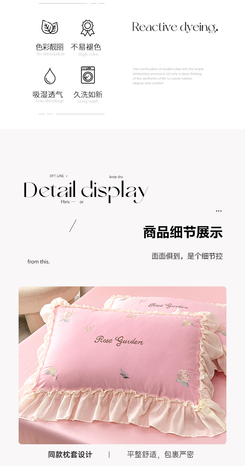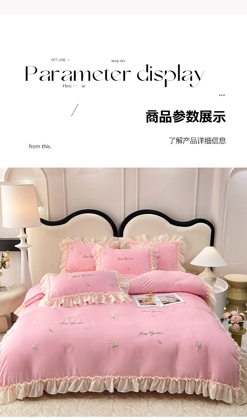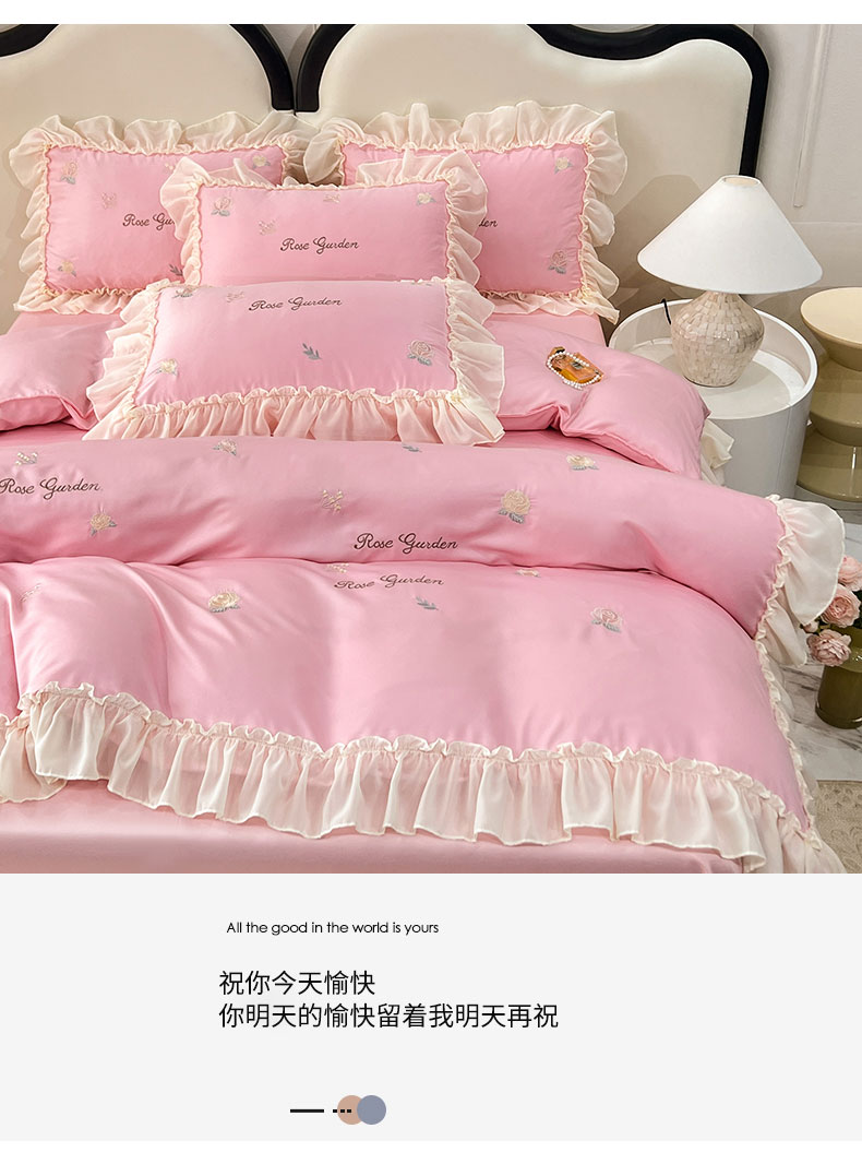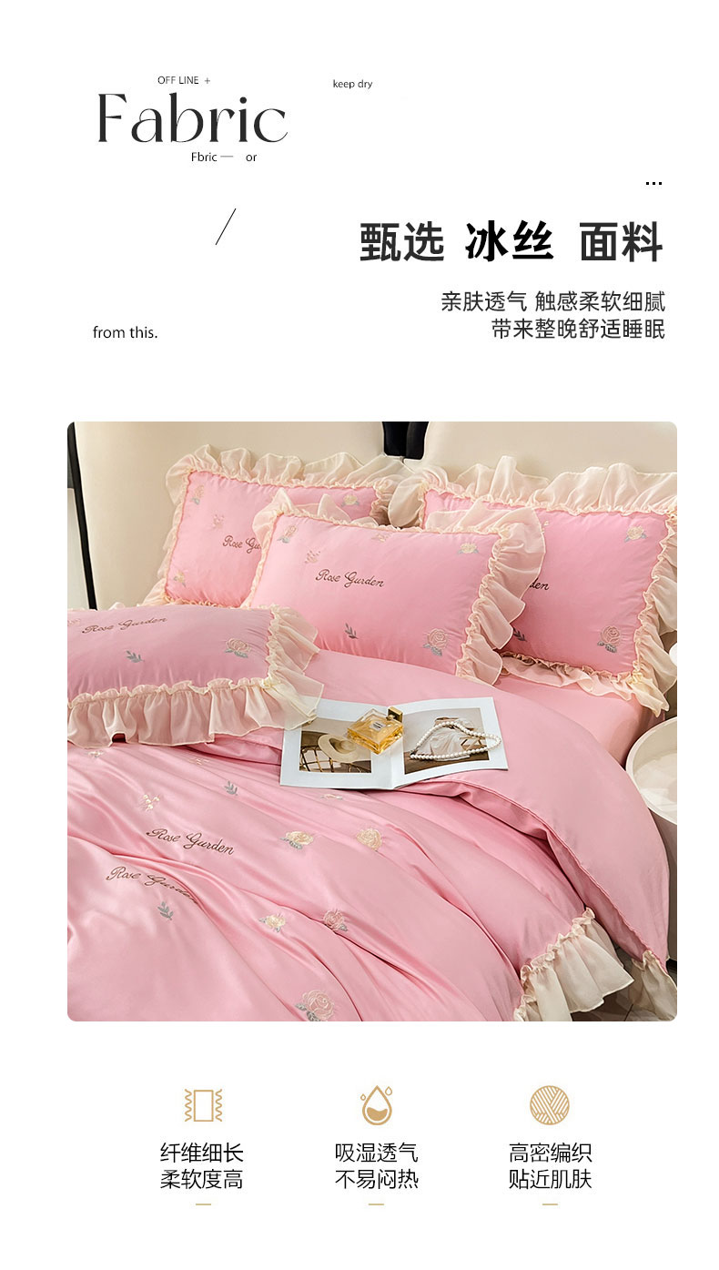商品名称:花香四季家纺 2025新款法式蕾丝裙边刺绣仙女公主风四件套 玫瑰粉