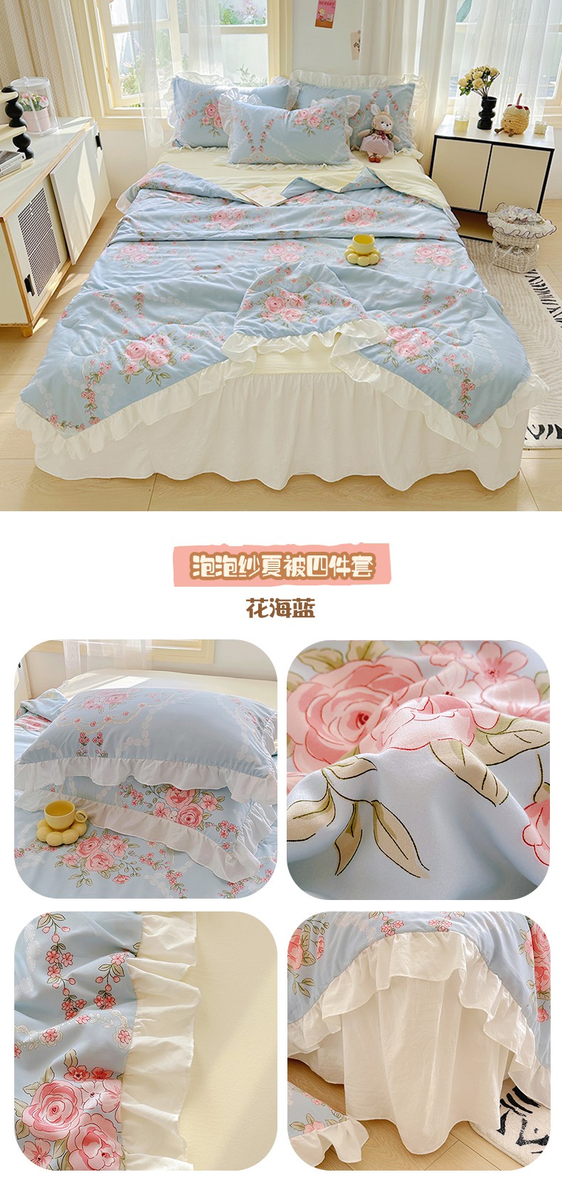 家贝爱 2025新款泡泡纱水洗棉花边床单/床裙款夏被四件套夏凉被 安婉蓝