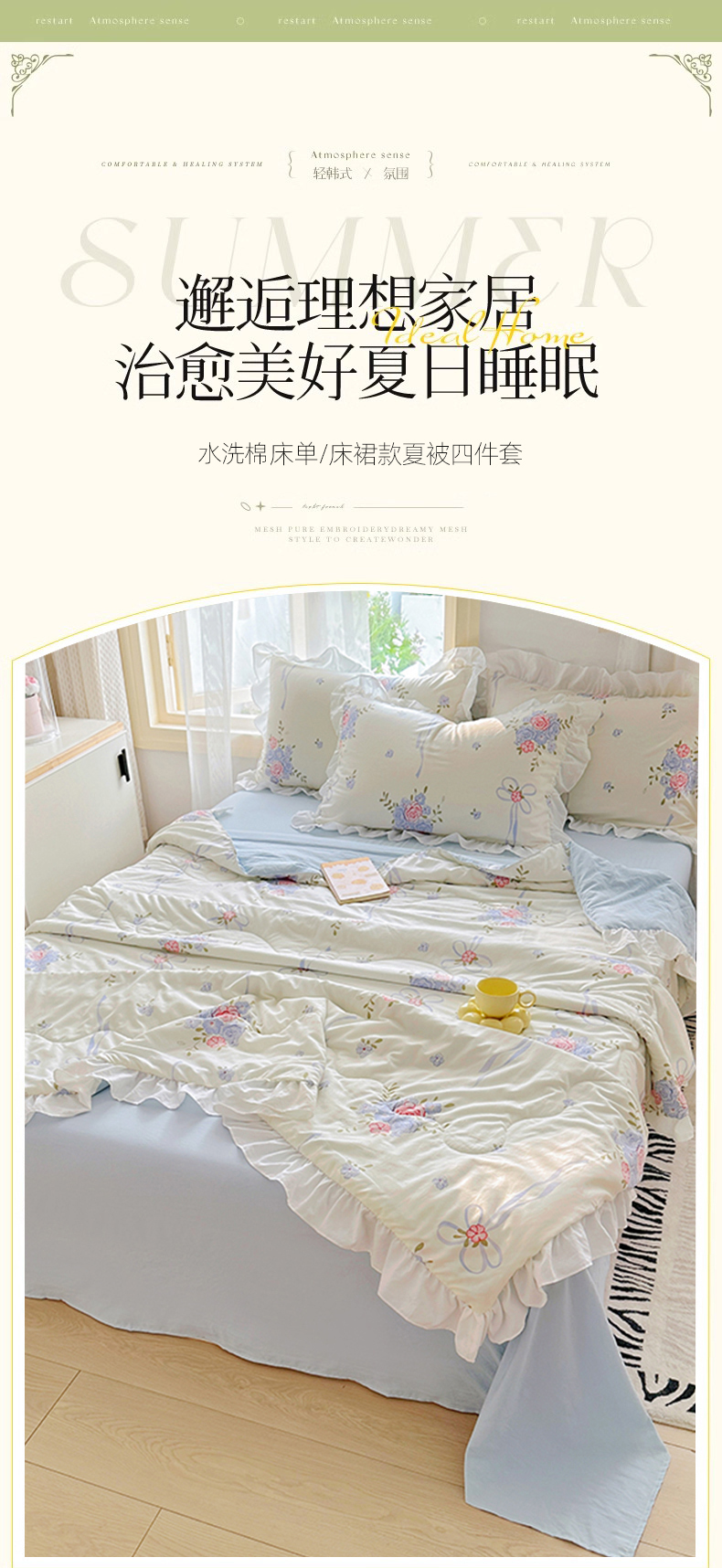 当前位置: 91家纺网 > 商品网购 > 被子 > 夏被 > 家贝爱 2025新款泡泡纱水洗棉花边床单/床裙款夏被四件套夏凉被 安婉蓝