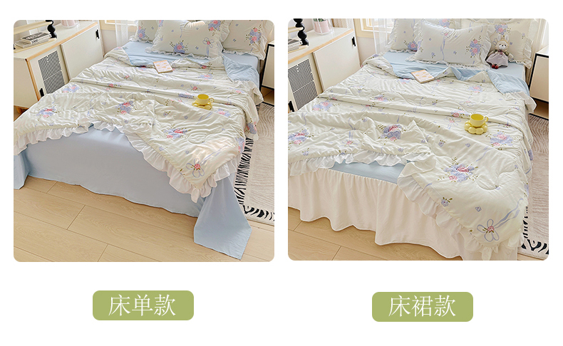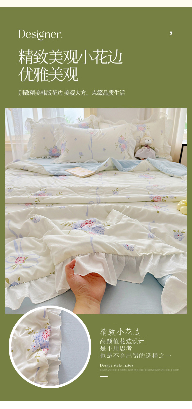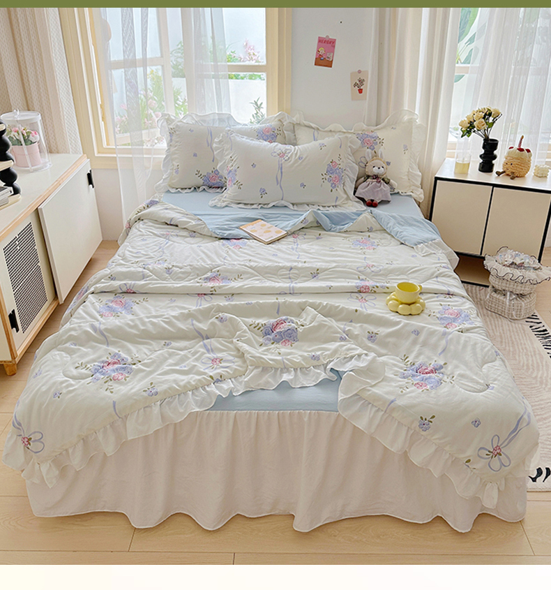 • 91家纺网 家纺一手货源 找家纺 家贝爱 2025新款泡泡纱水洗棉花边床单/床裙款夏被四件套夏凉被 安婉蓝