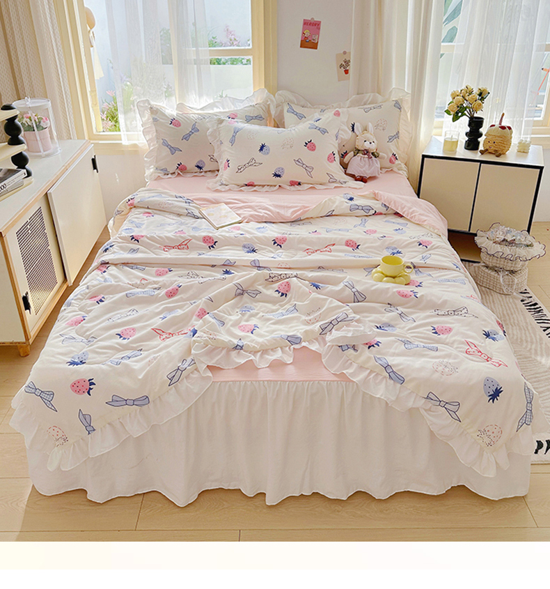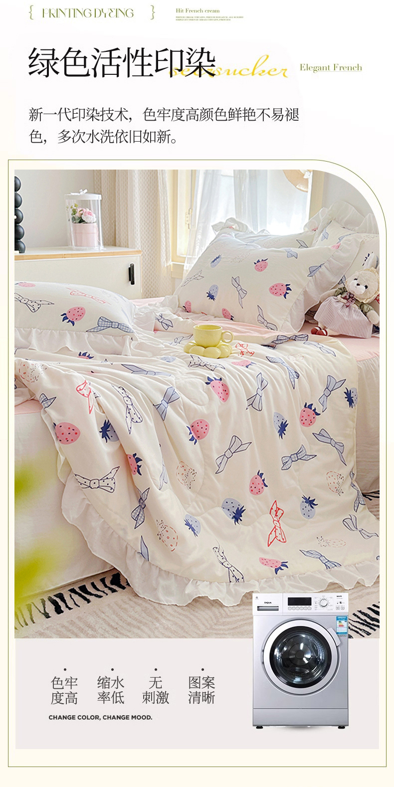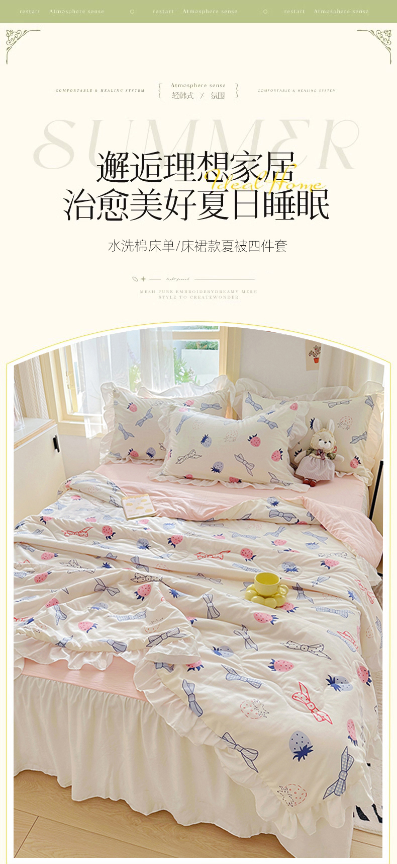 • 91家纺网 家纺一手货源 找家纺 家贝爱 2025新款泡泡纱水洗棉花边床单/床裙款夏被四件套夏凉被 俏颜