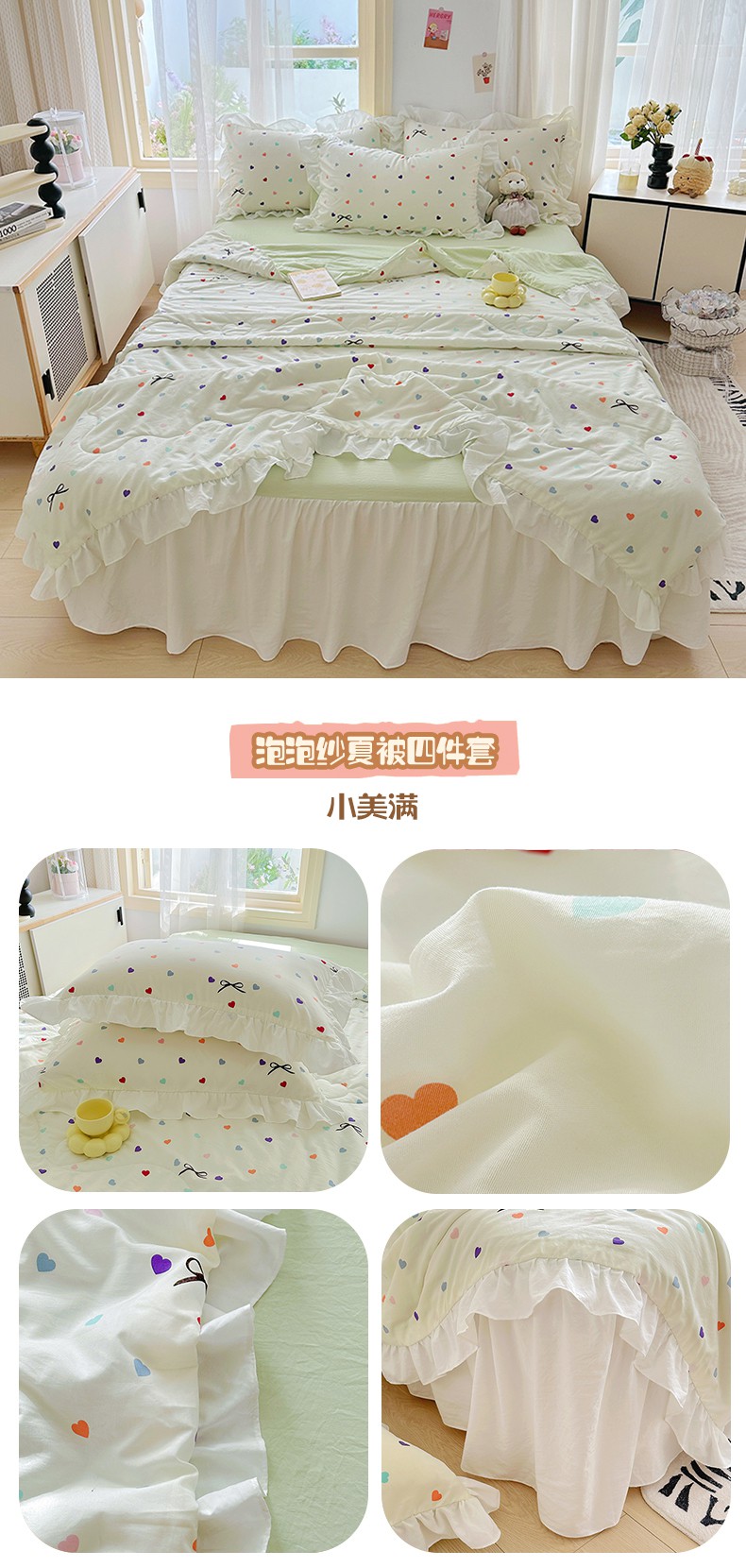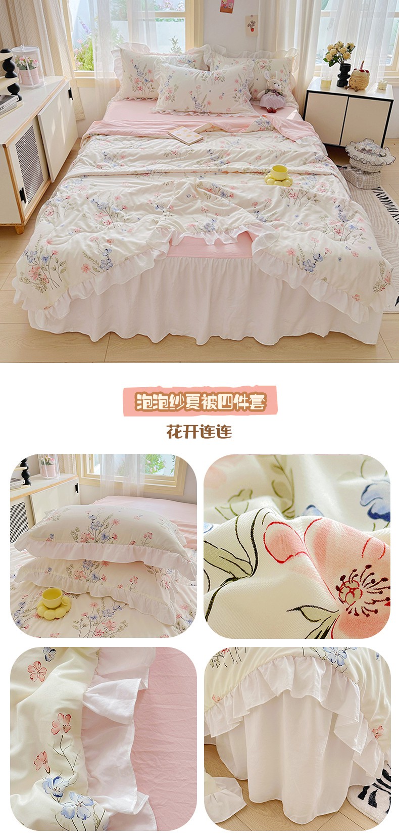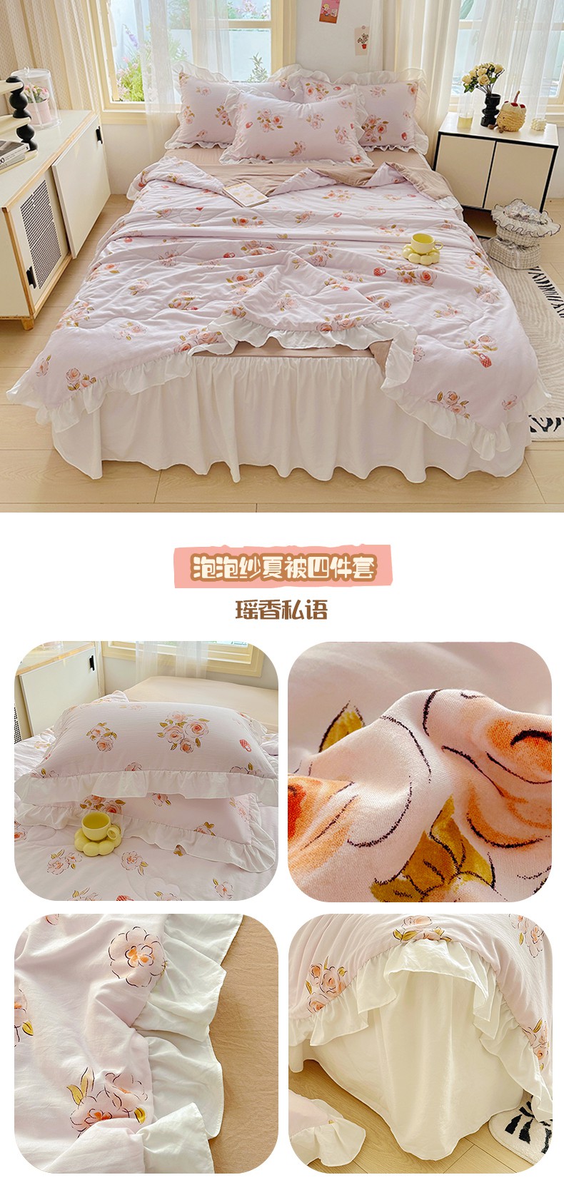 家贝爱 2025新款泡泡纱水洗棉花边床单/床裙款夏被四件套夏凉被 俏颜