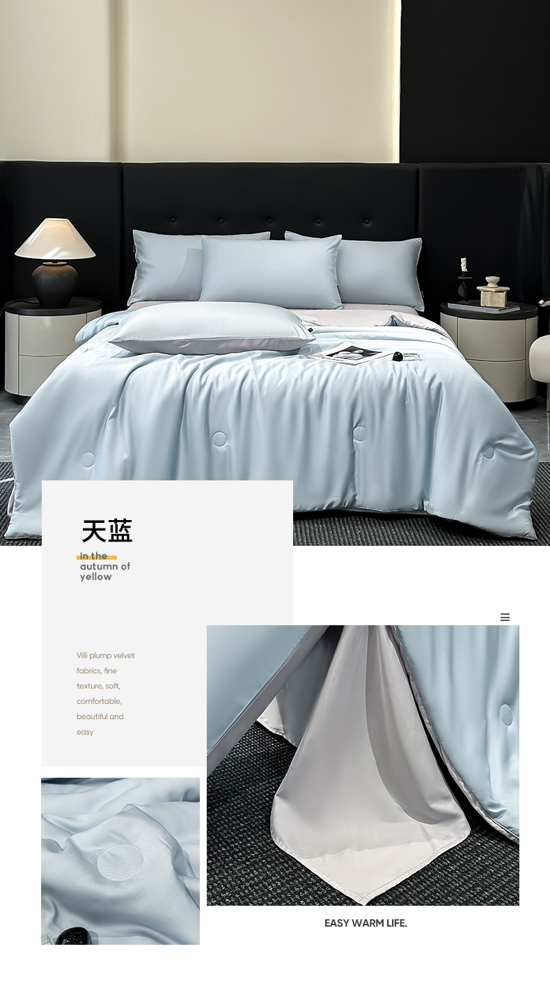 当前位置: 91家纺网 > 商品网购 > 床品套件 > 四件套 > 夏被四件套 > 金鹰 2025新款A类莱赛尔50天丝拼色空调被大豆夏被四件套 天蓝