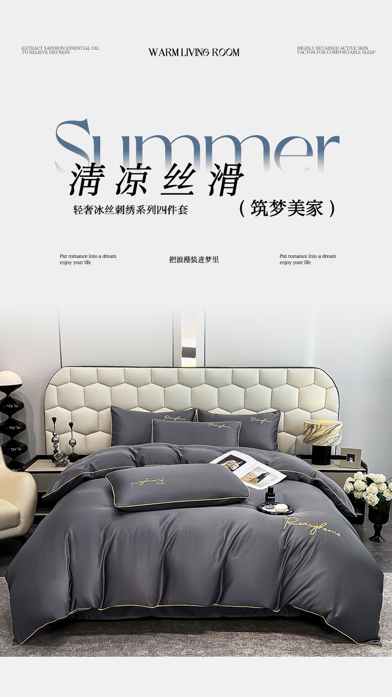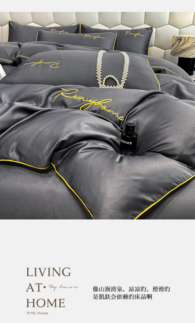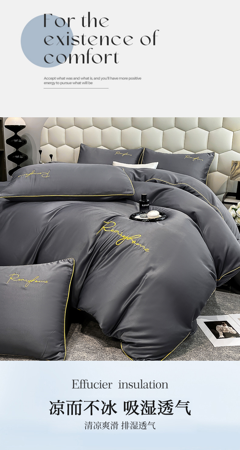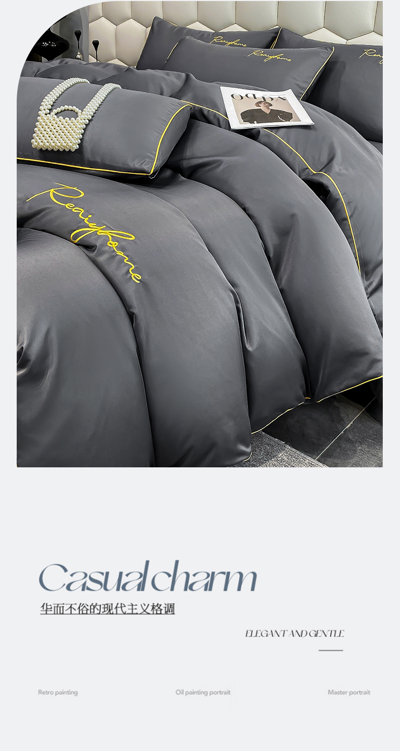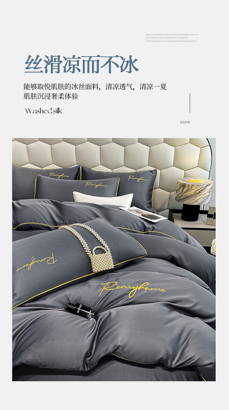 商品名称:富宁2025新款水洗真丝时光字母冰丝刺绣四件套 高级灰