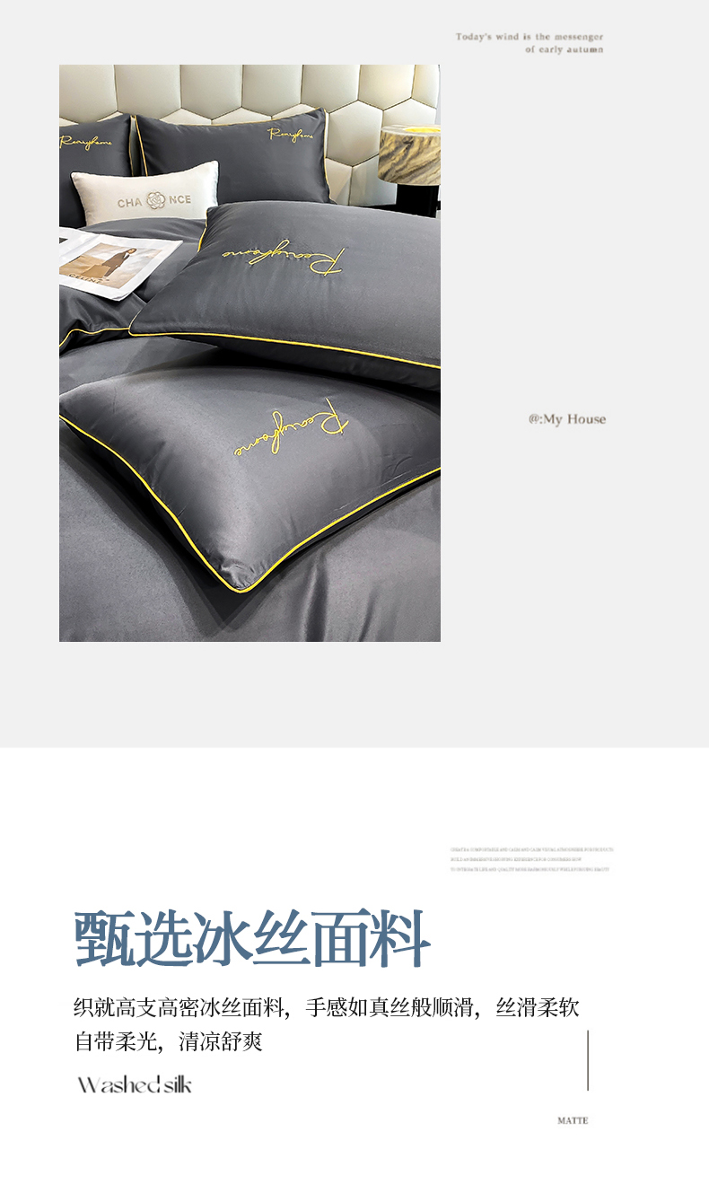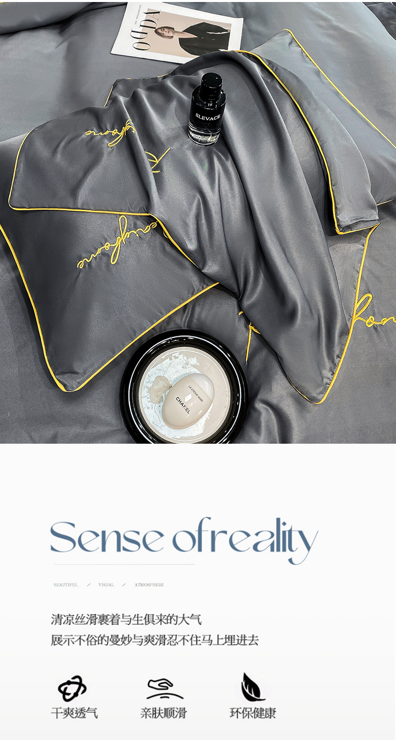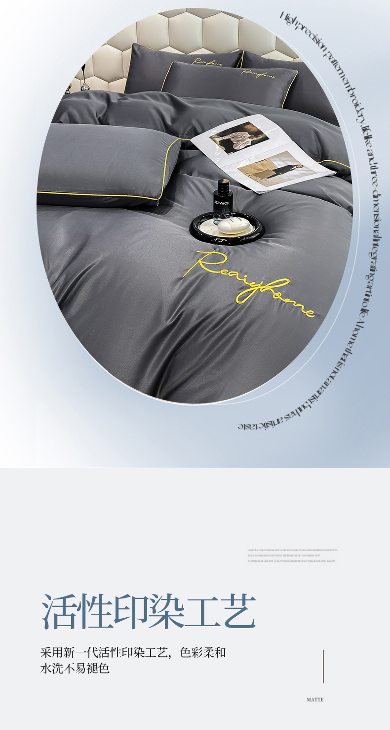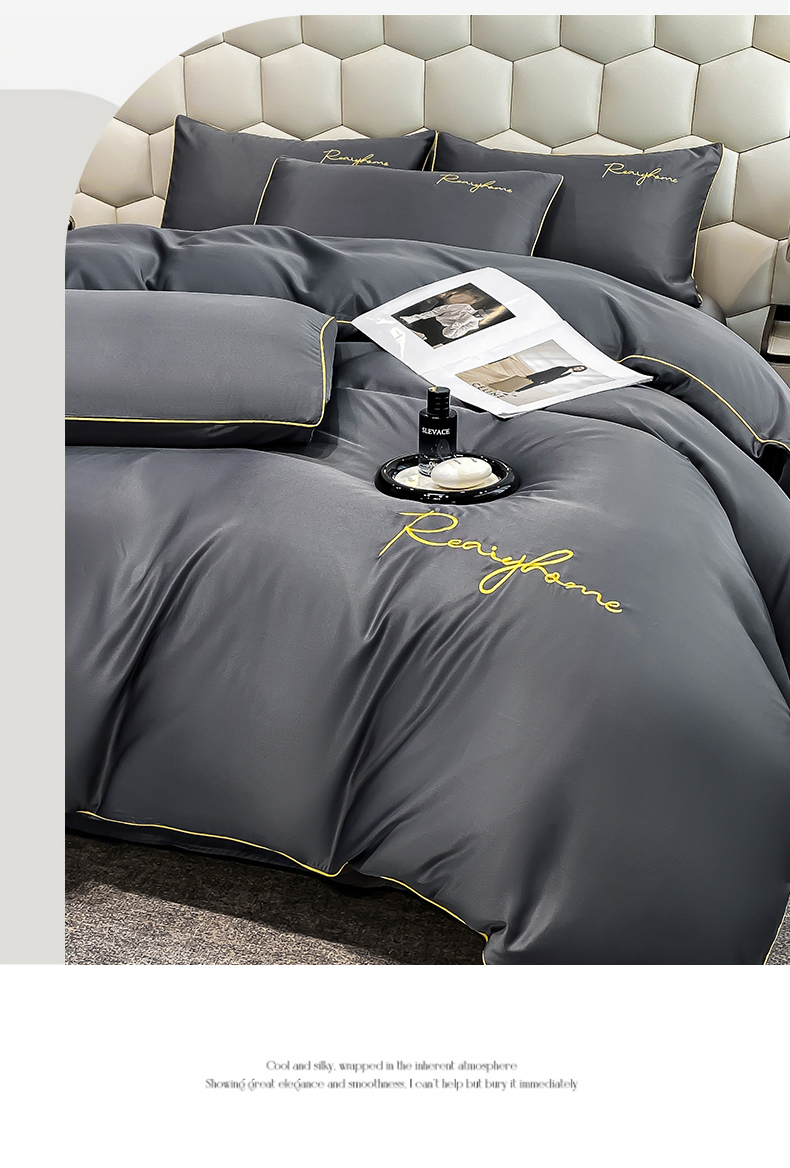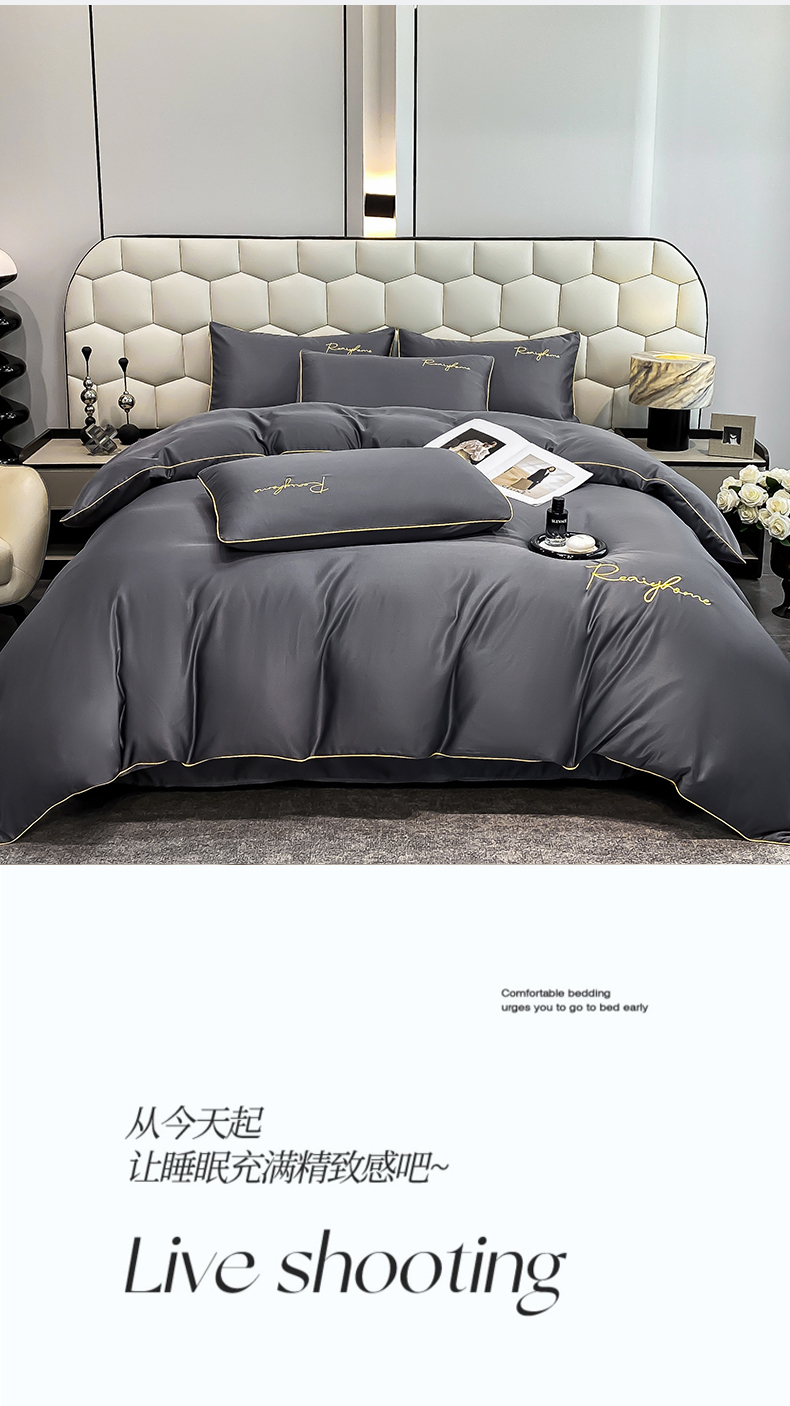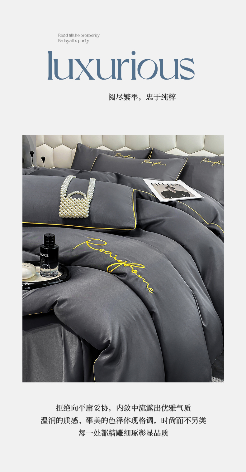 商品名称:富宁2025新款水洗真丝时光字母冰丝刺绣四件套 高级灰