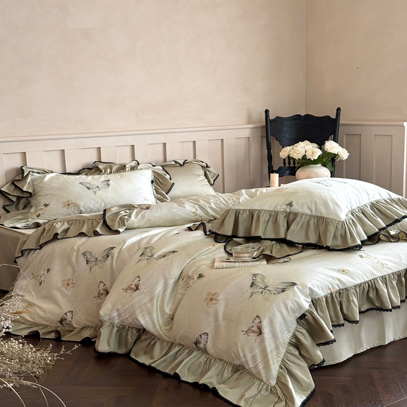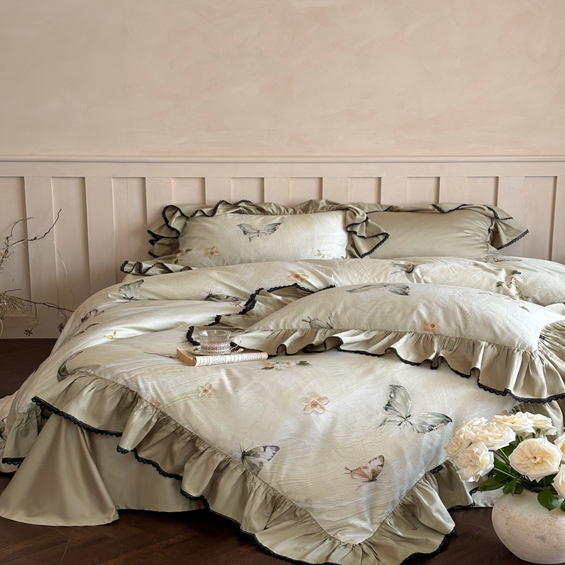 (总)佳汐蓝 2025春夏新品双层皱皱纱刺绣+织带+荷叶边四件套--白茶花,奶白,曲奇
