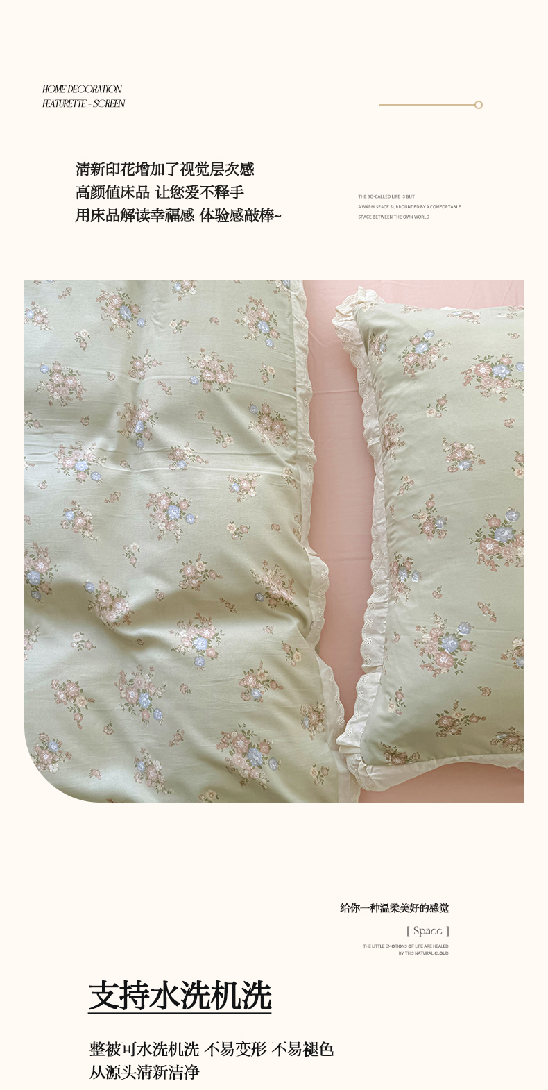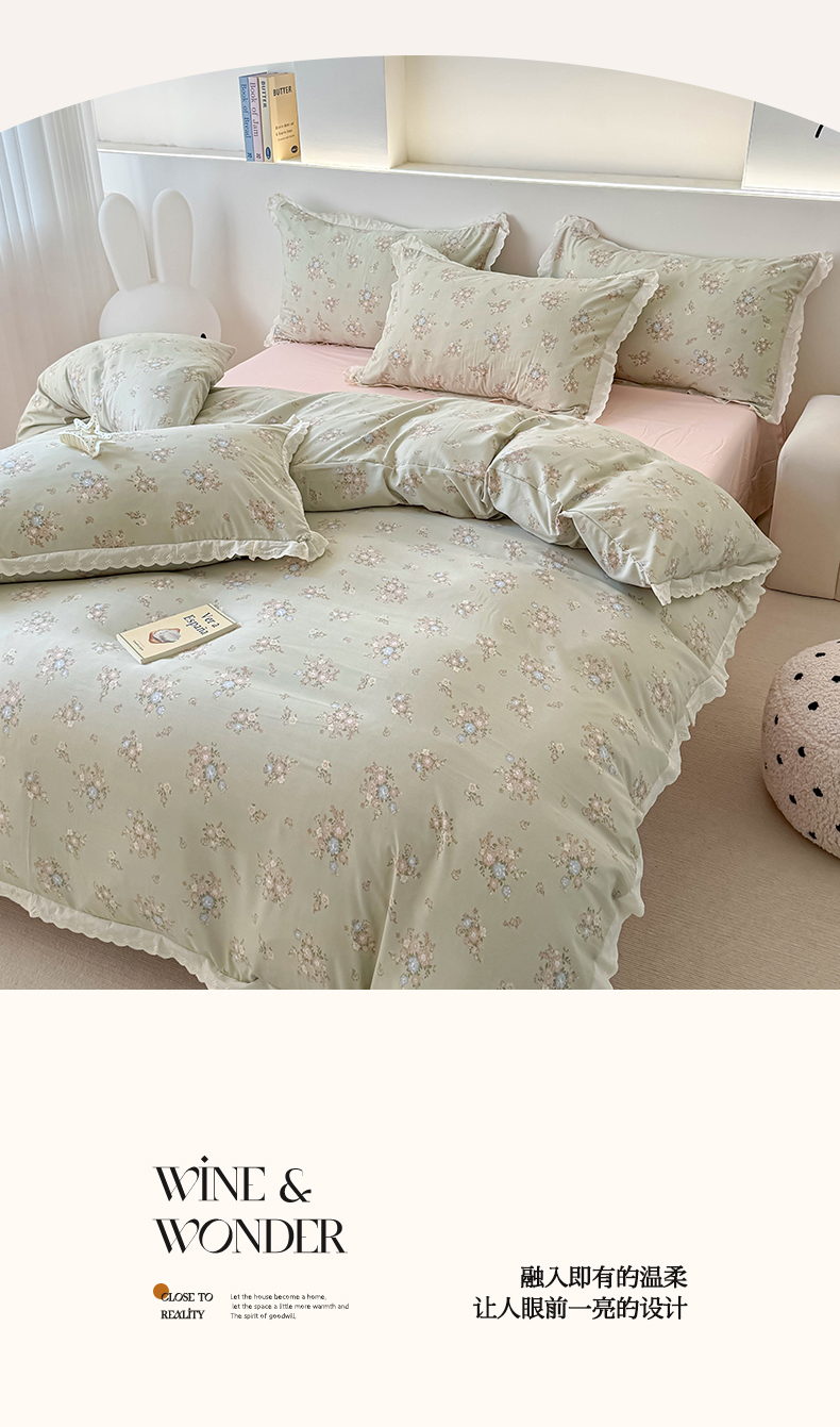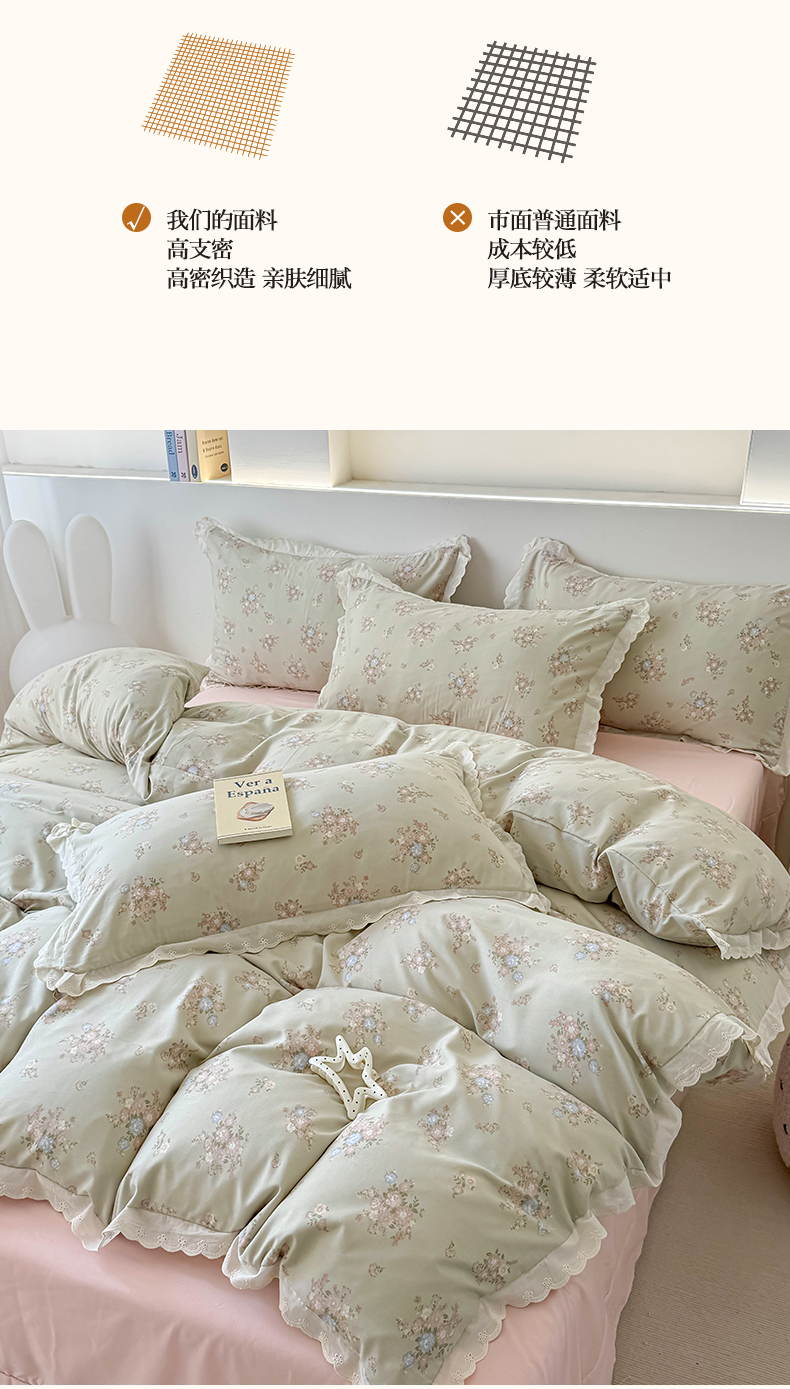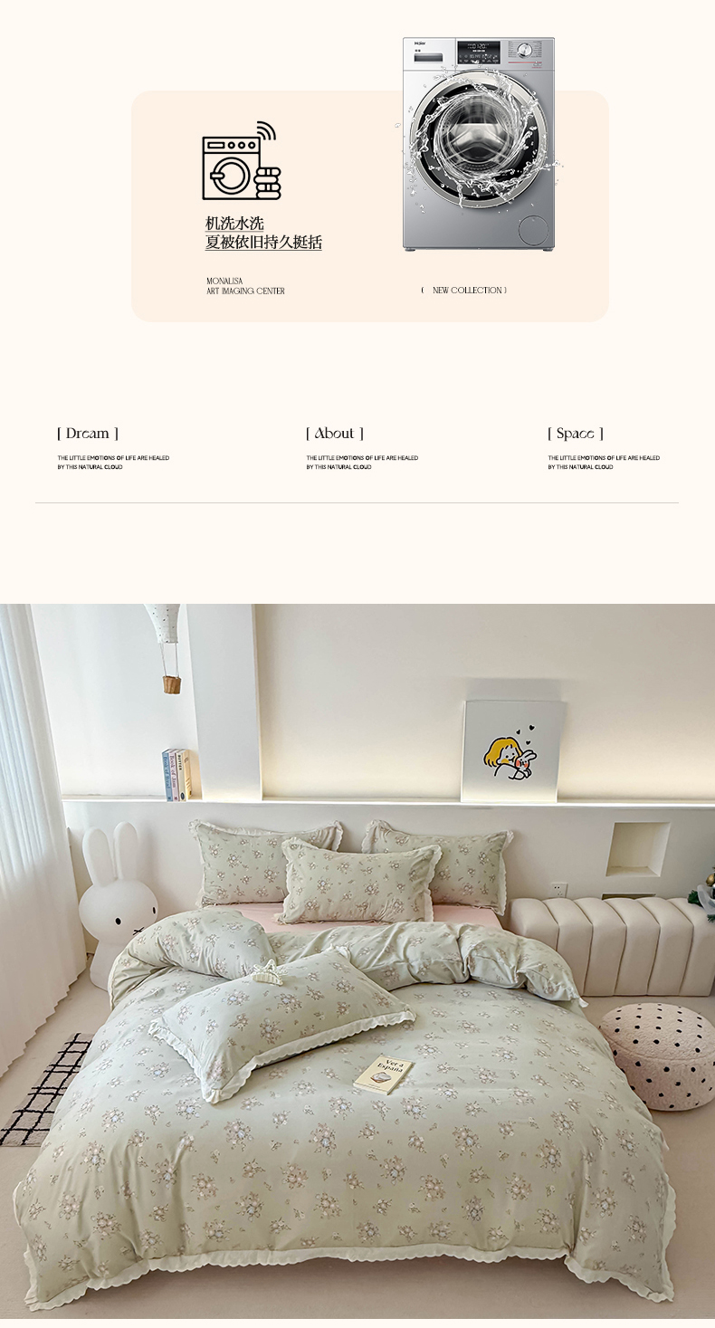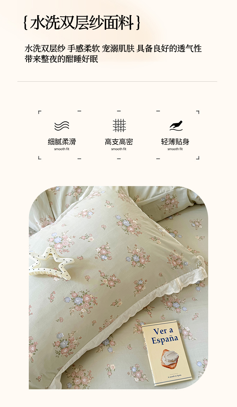 商品名称:吾欢心 2025新款韩版花边水洗双层纱四件套夏被四件套(棚拍图) 莫奈花园