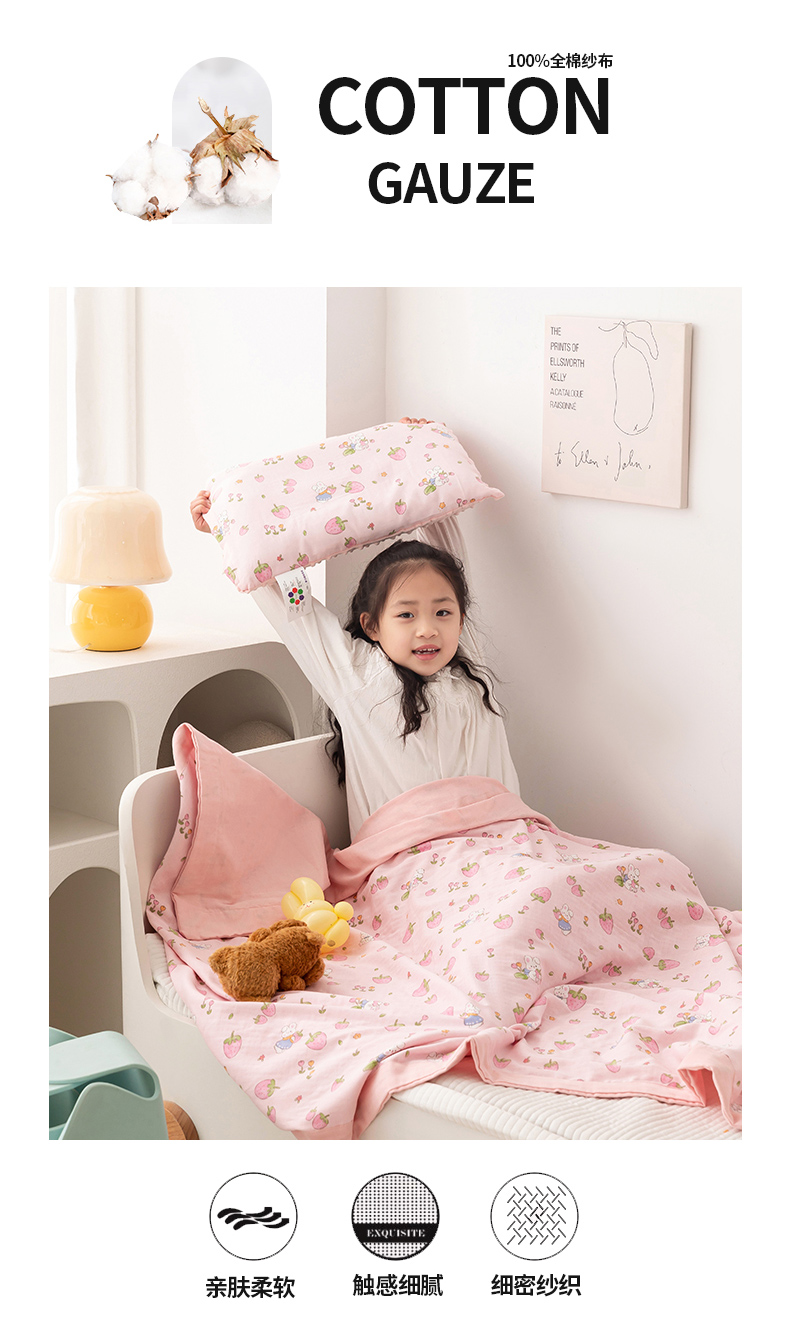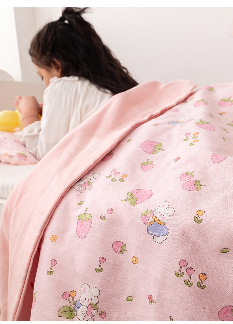 商品名称:嗨生活 2025年 7A抗菌全棉双层纱夏被 纱布夏被盖毯 儿童夏被 幼儿园夏被 草莓兔兔