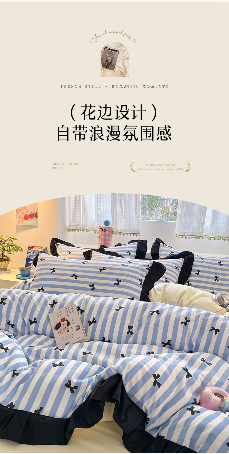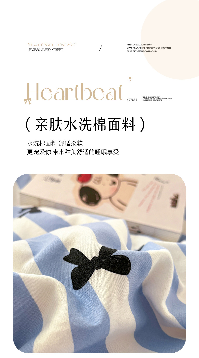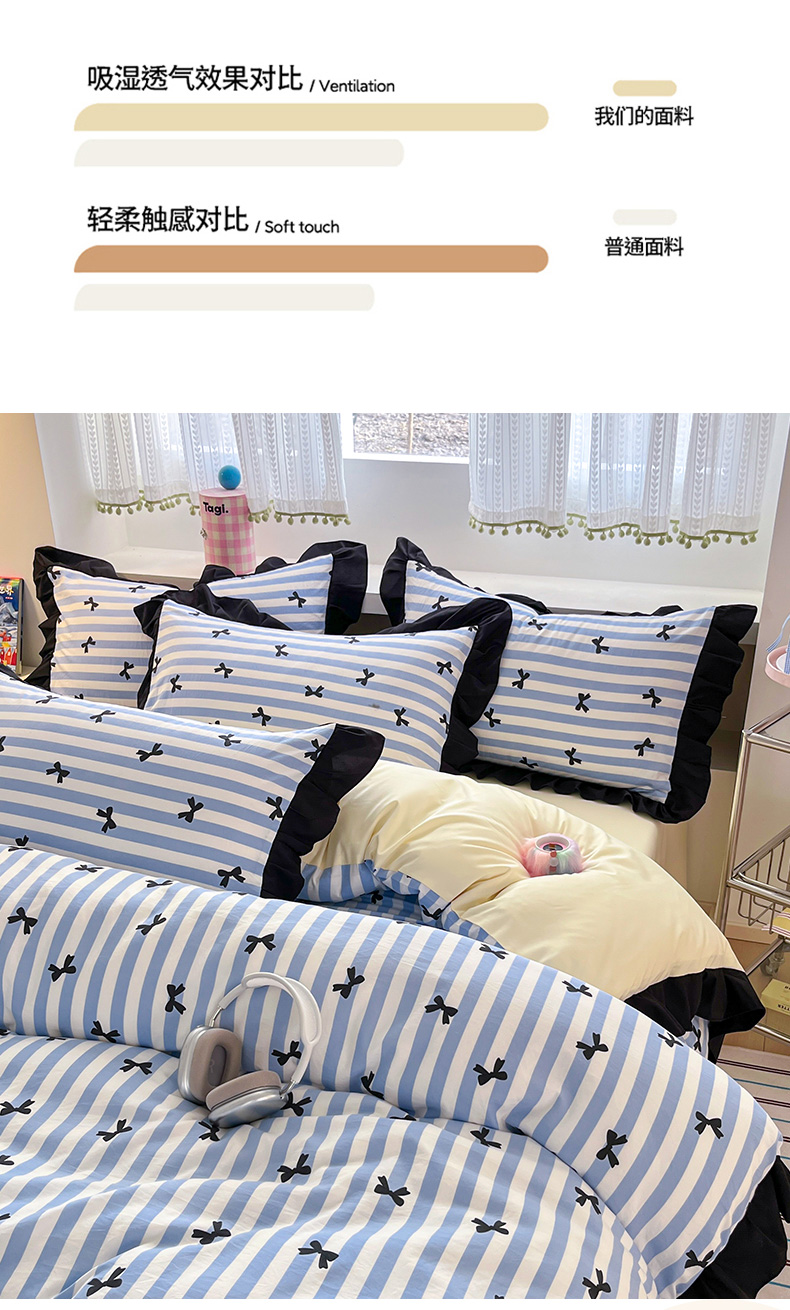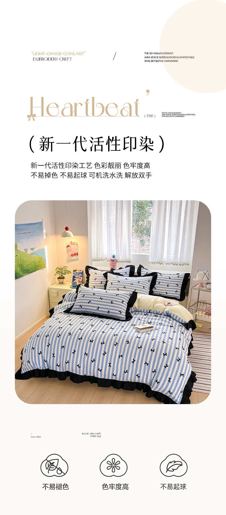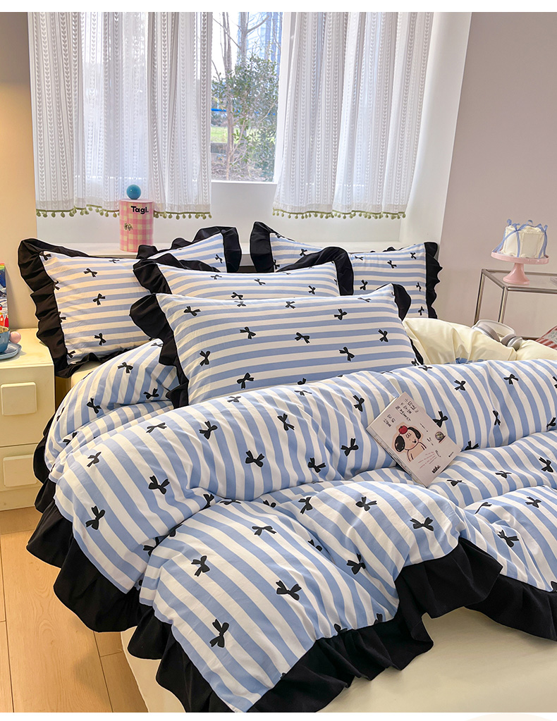 商品名称:2025水洗棉花边四件套_9067 蝴蝶结-条纹蓝