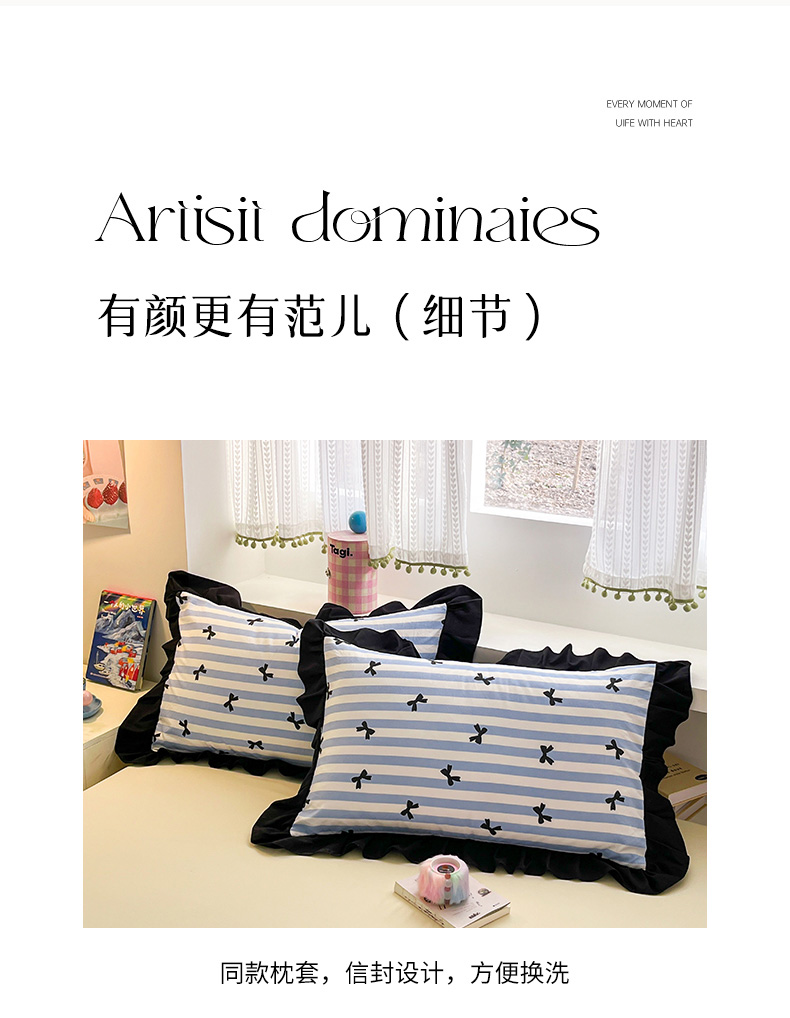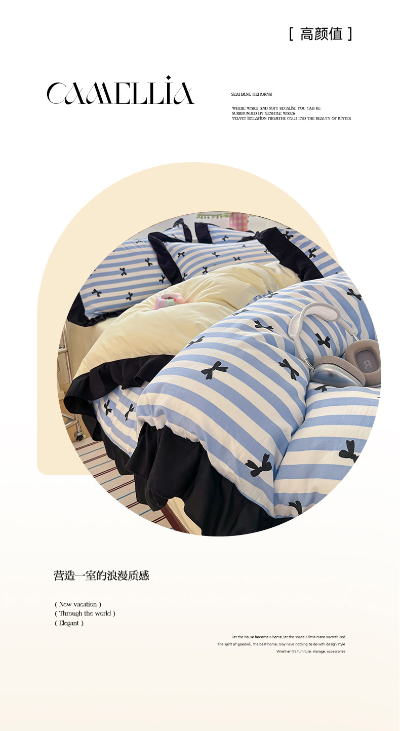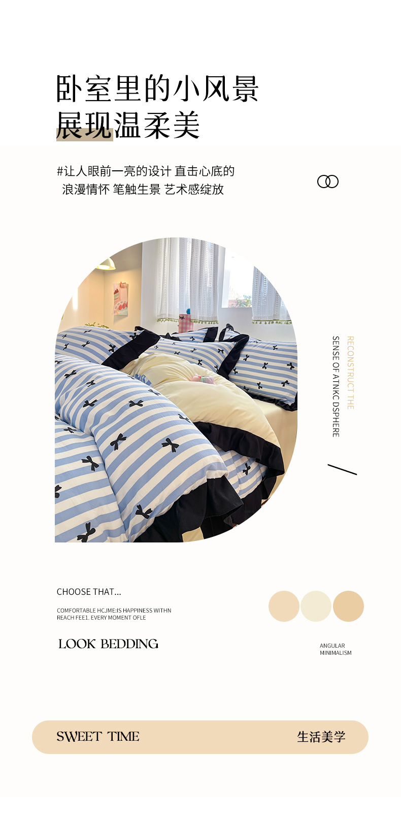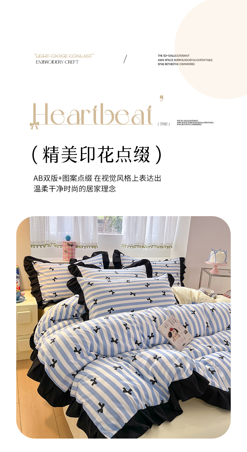 商品名称:2025水洗棉花边四件套_9067 蝴蝶结-条纹蓝