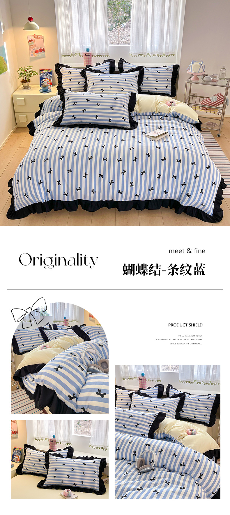 2025水洗棉花边四件套_9067 蝴蝶结-条纹蓝