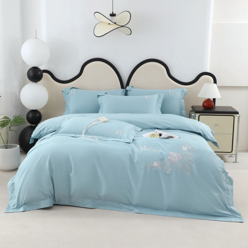 优姿家纺2025新品高端加密全棉100支绣花宽边四件套 淡雅生活-天蓝