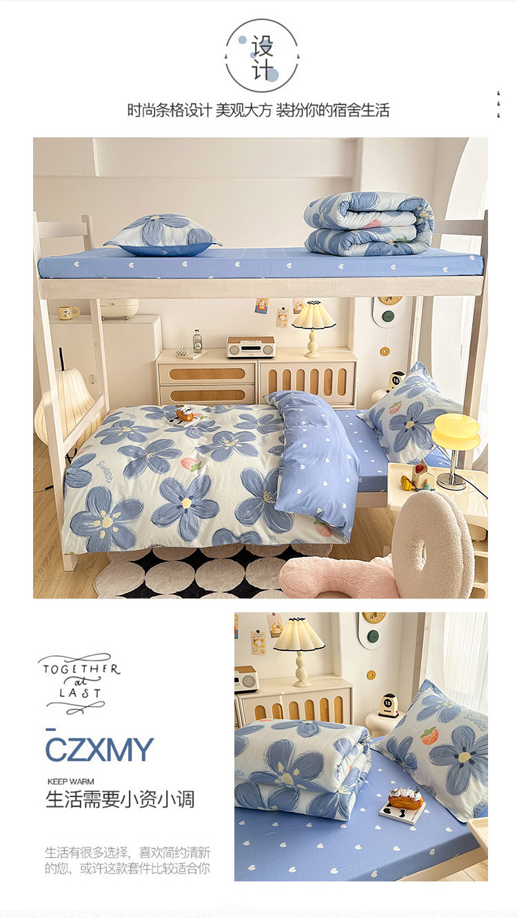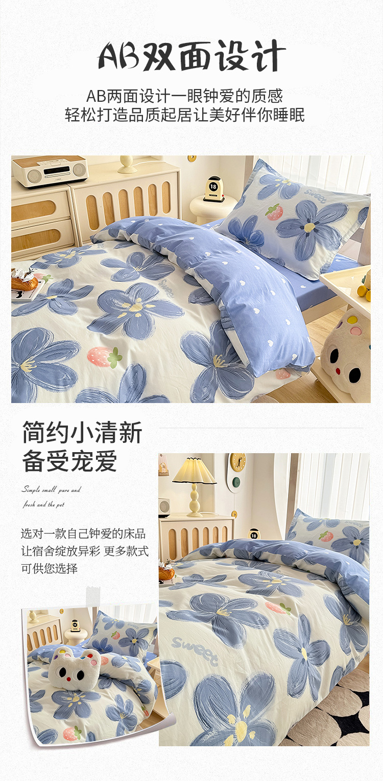 卡普二店 2024新款爆款加厚卡通小清新全棉纯棉学生宿舍三件套床笠隔天可拿 蓝风铃,蓝风铃