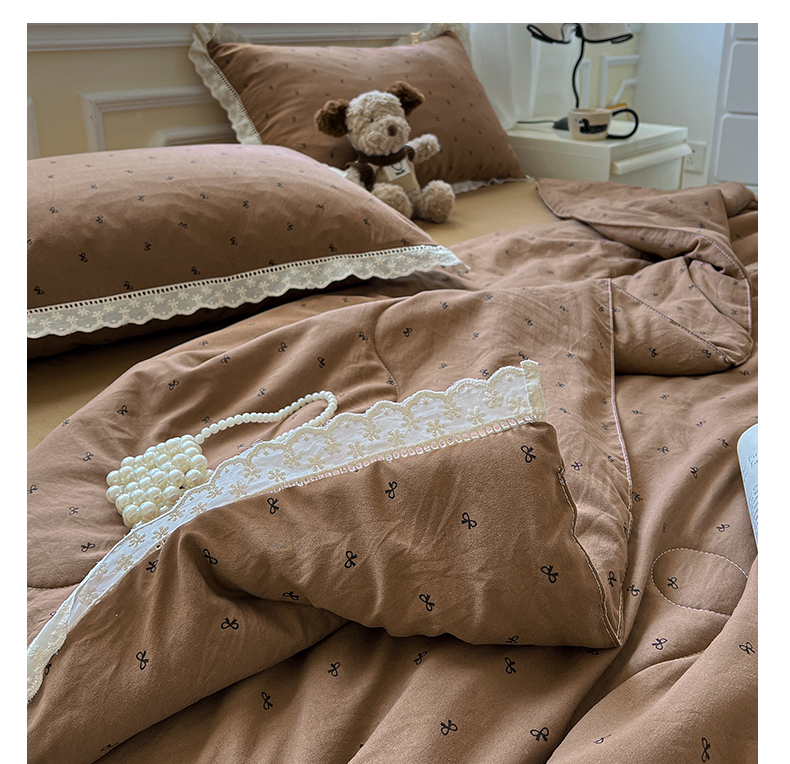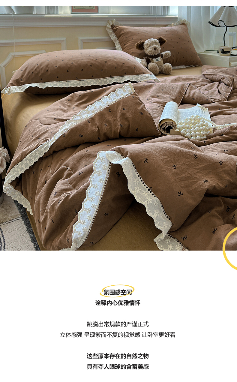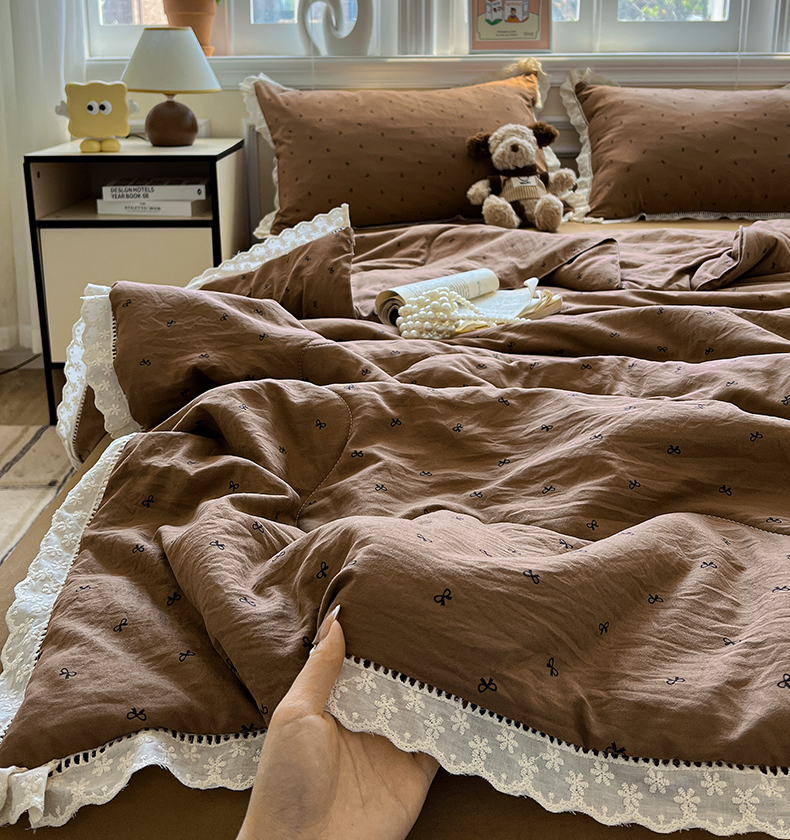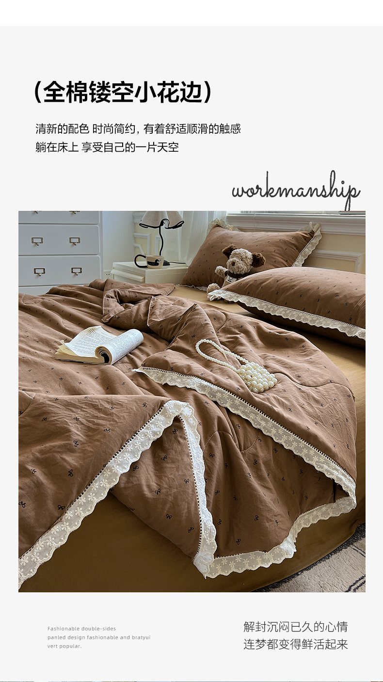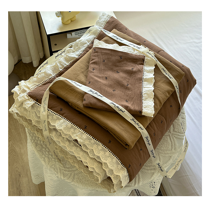 水墨江南 2025新款全棉镂空花边夏被四件套 小蝴蝶结咖