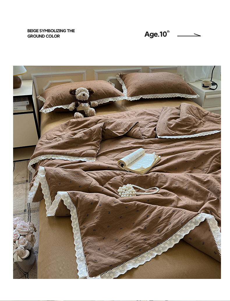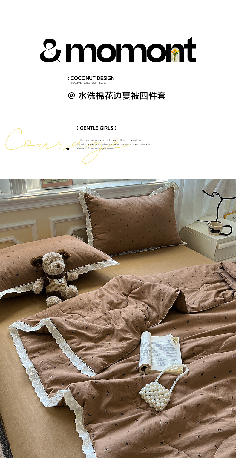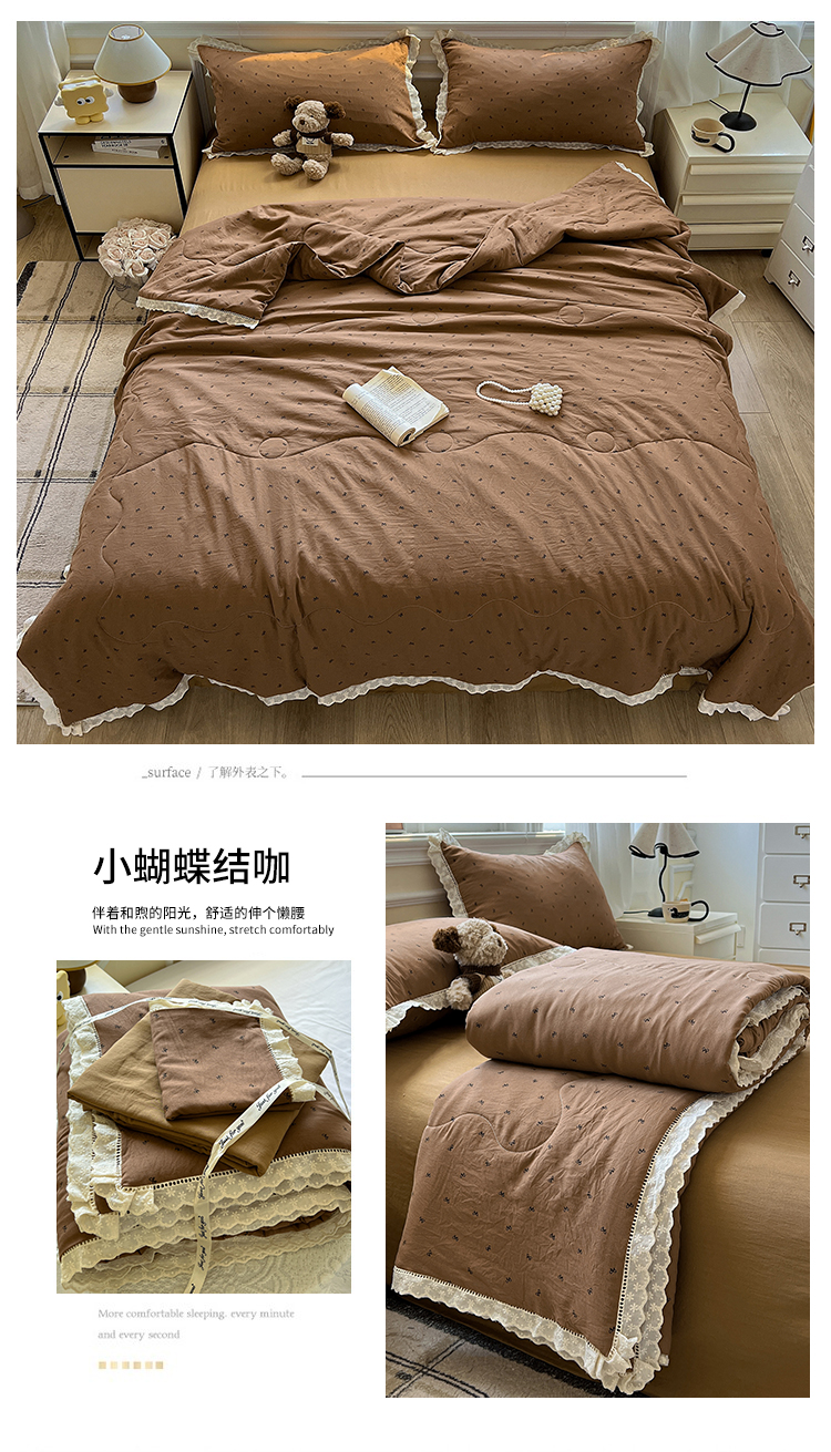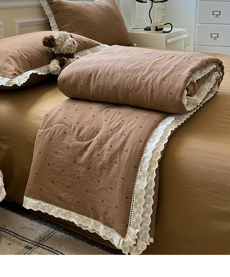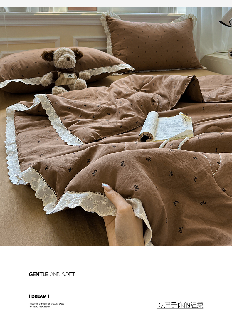 水墨江南 2025新款全棉镂空花边夏被四件套 小蝴蝶结咖