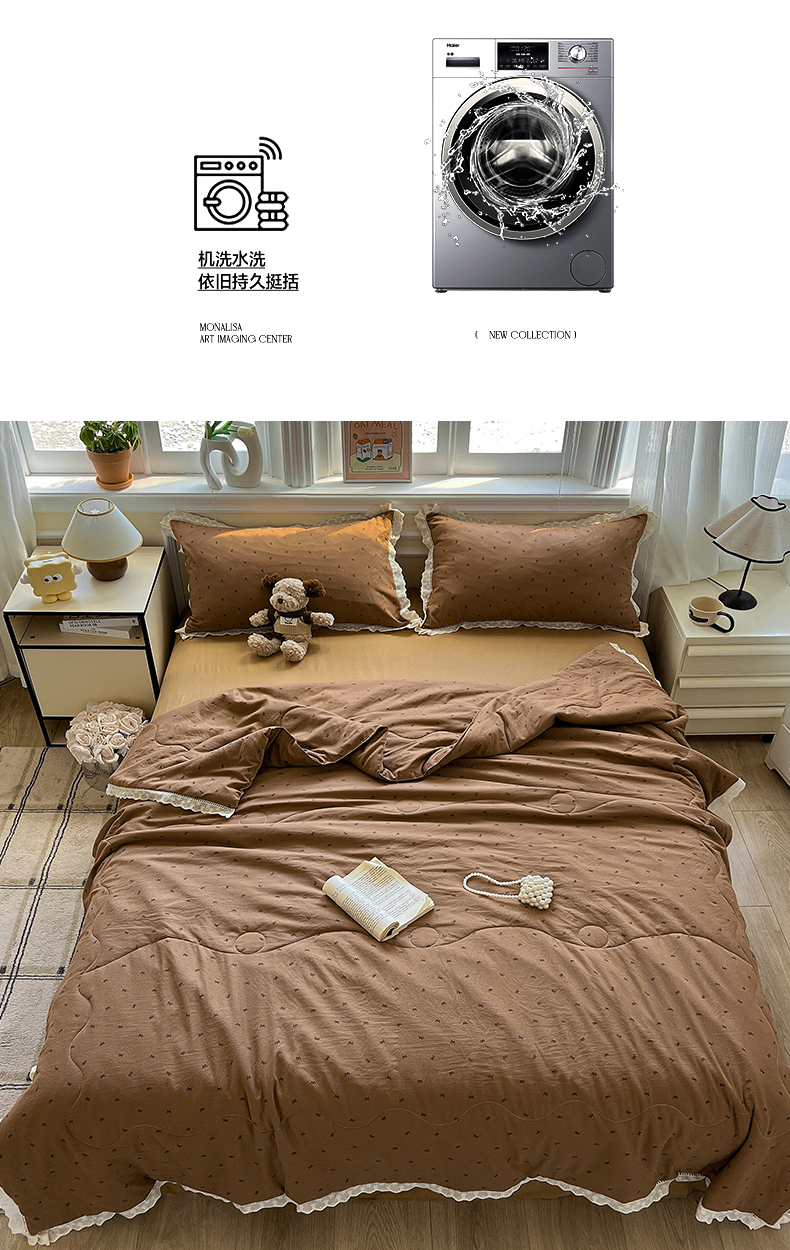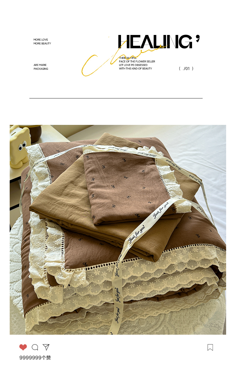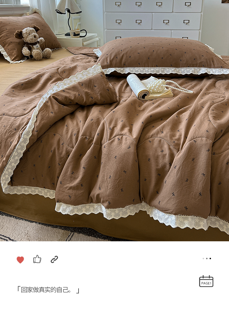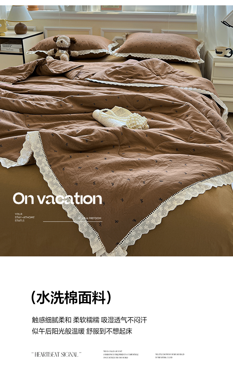 水墨江南 2025新款全棉镂空花边夏被四件套 小蝴蝶结咖