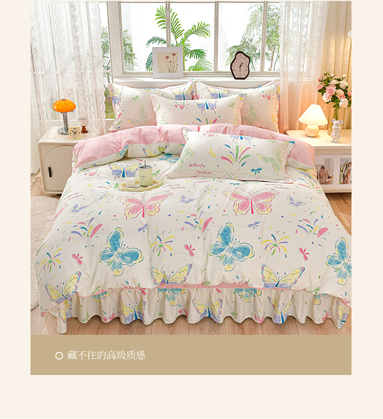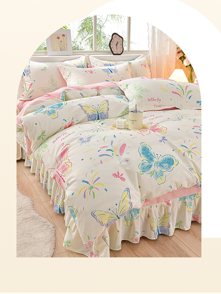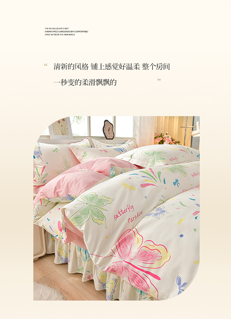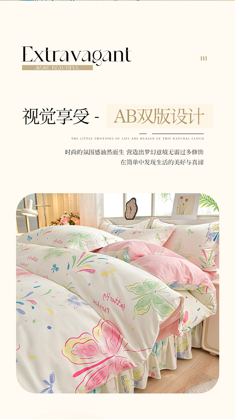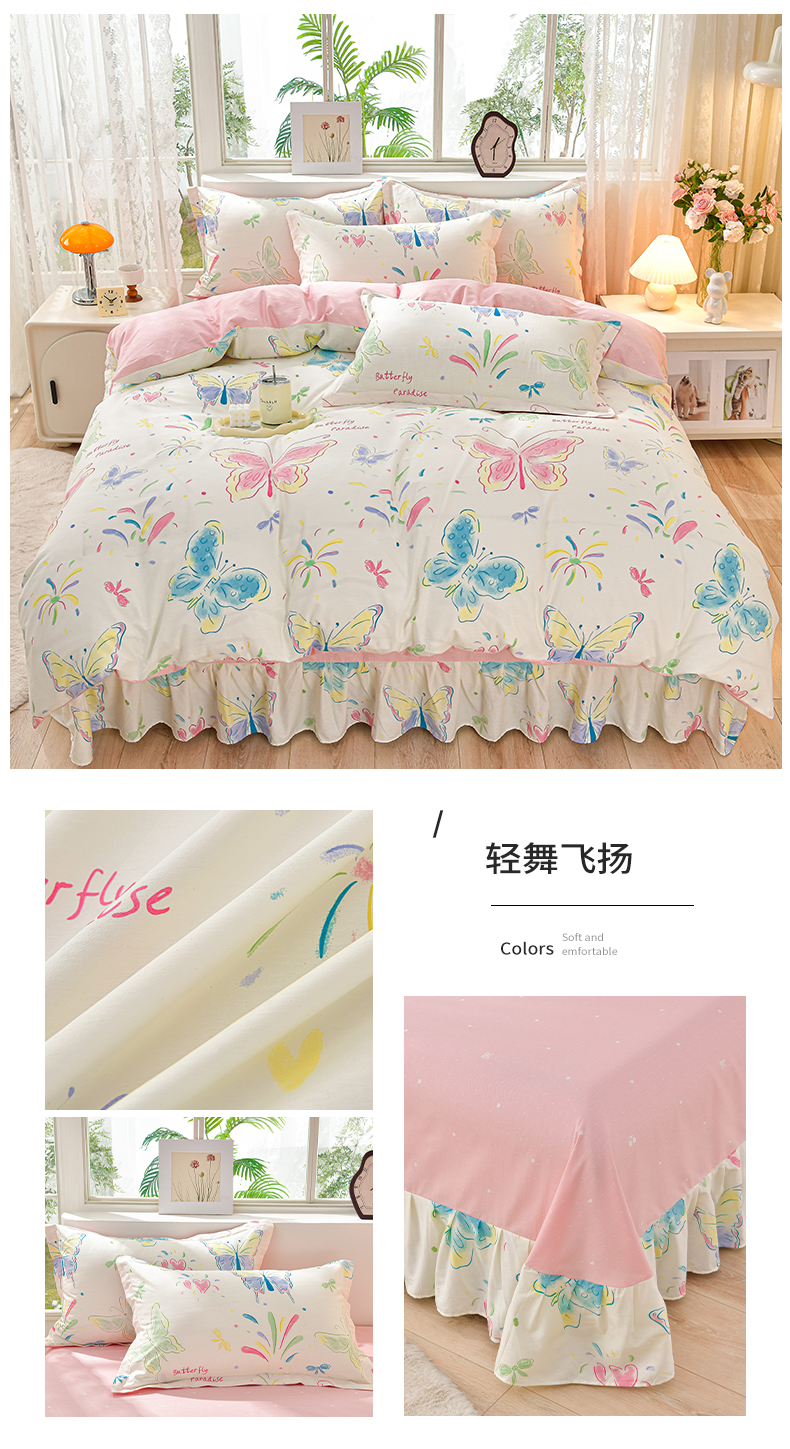 商品名称:绘萱家居 2025新款100%全棉床裙款斜纹印花四件套 轻舞飞扬