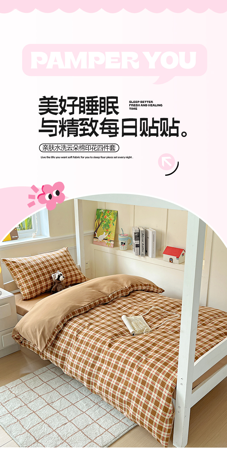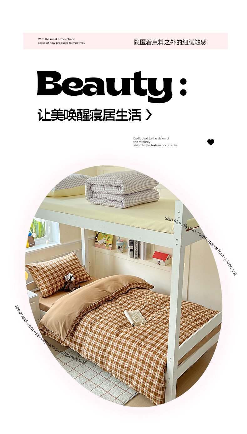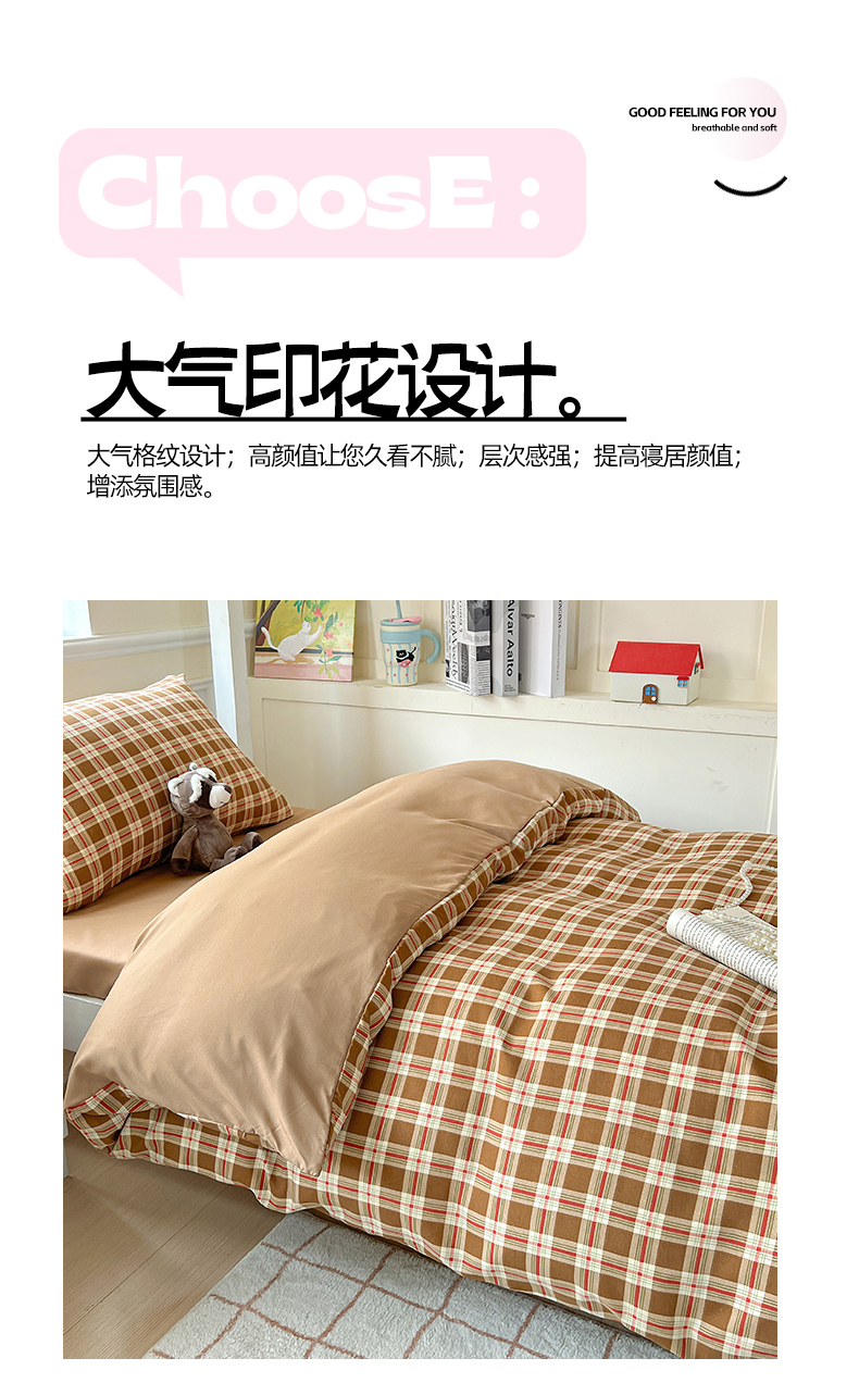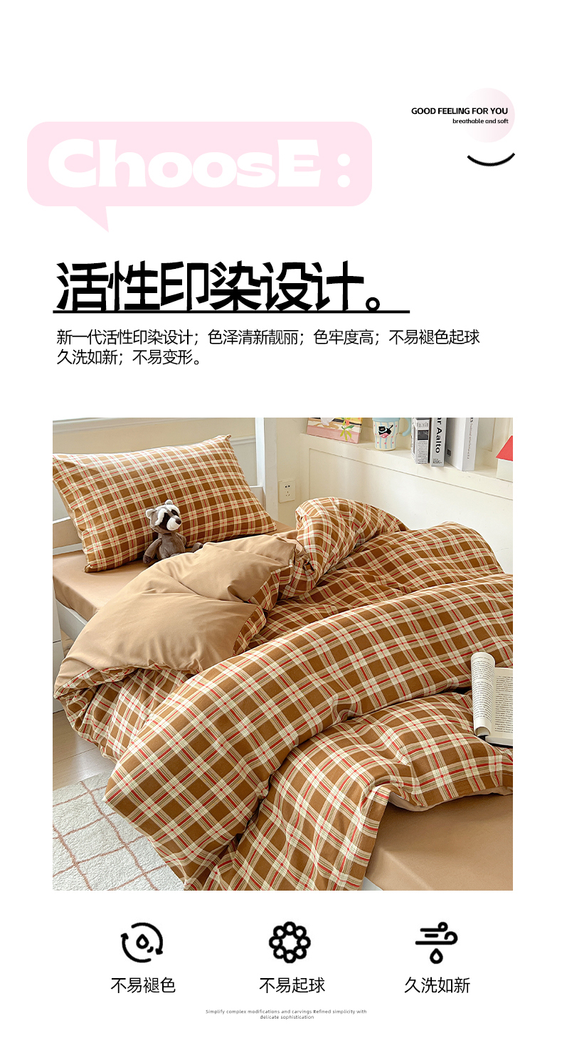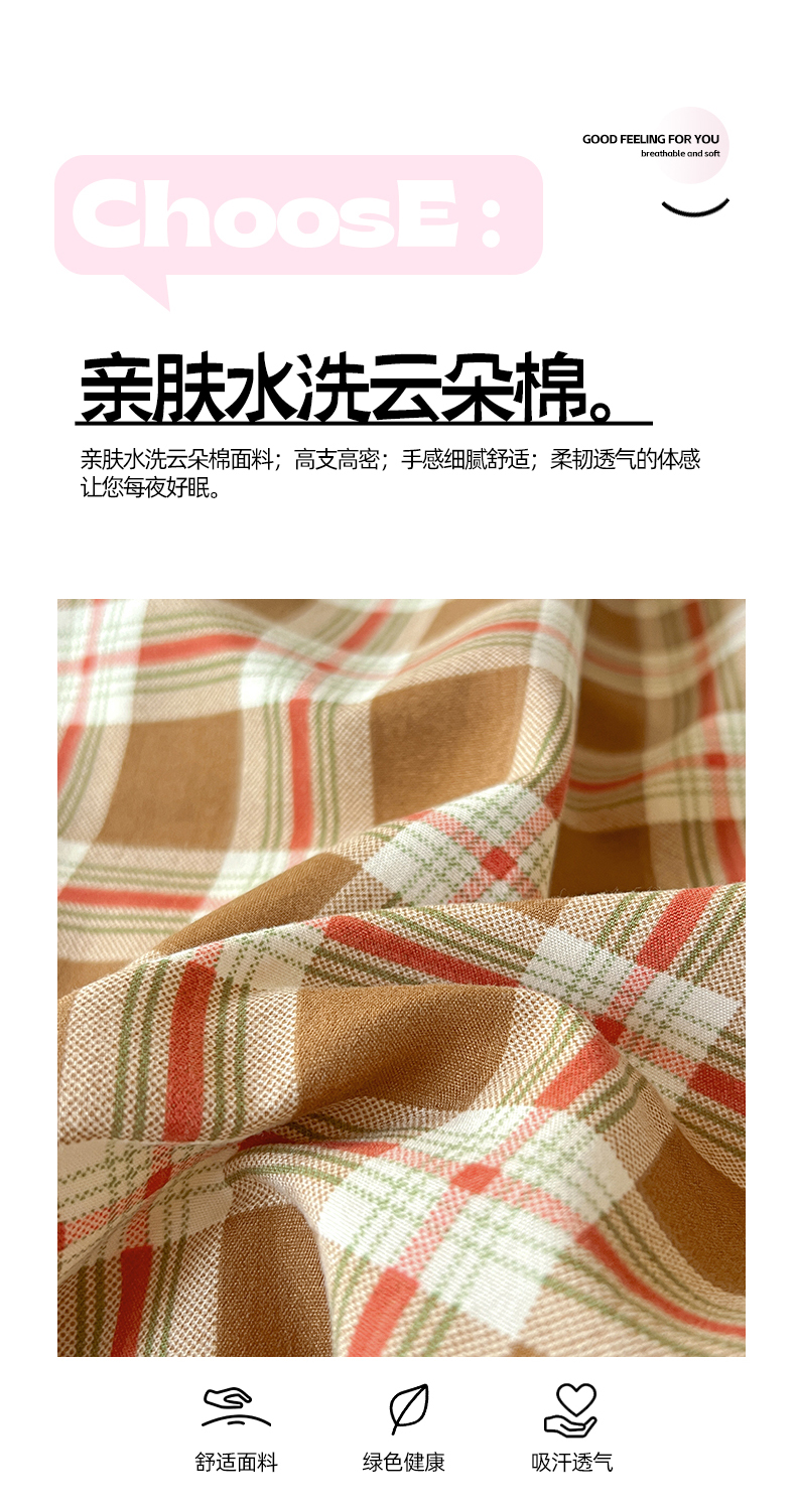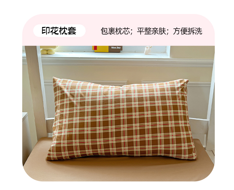 商品名称:妖妖家纺 2025新款软糯水洗棉格子学生三件套 可可麦芬