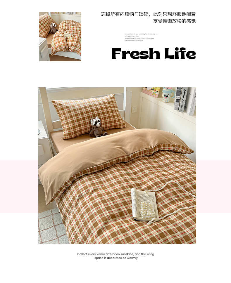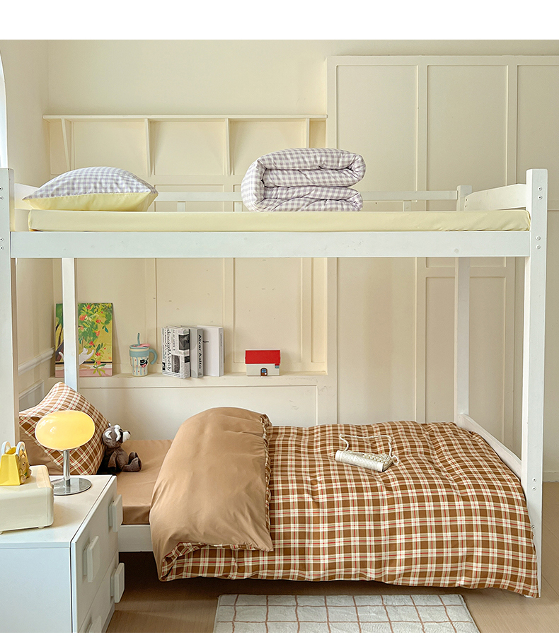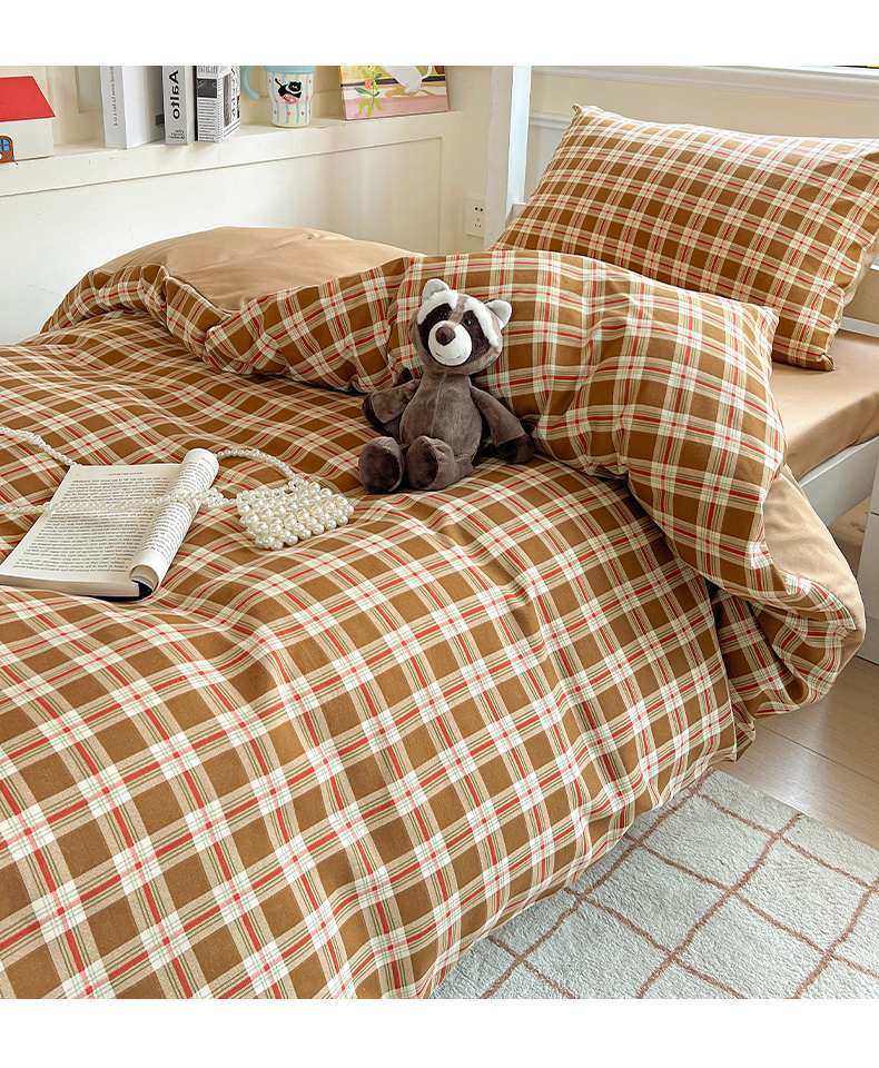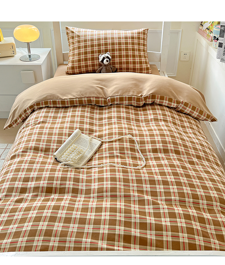 妖妖家纺 2025新款软糯水洗棉格子学生三件套 可可麦芬