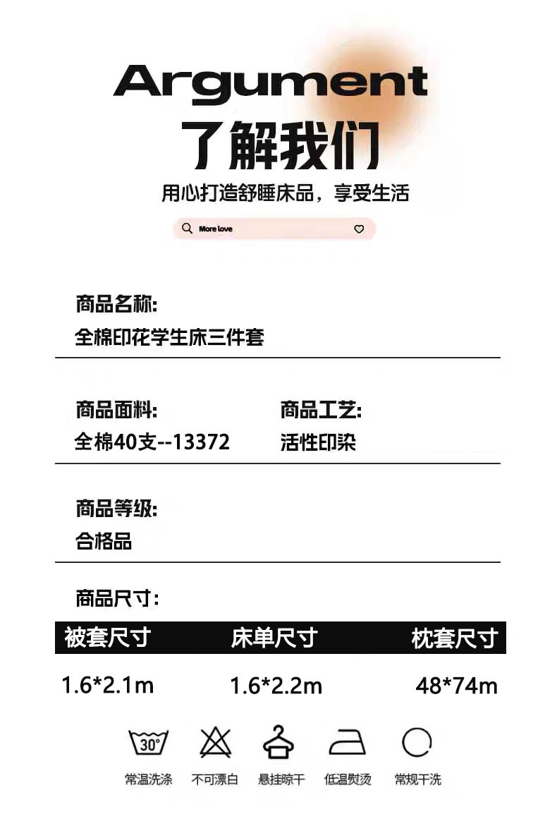 纯棉三件套(被套+床单+枕套) | ¥75.00 |