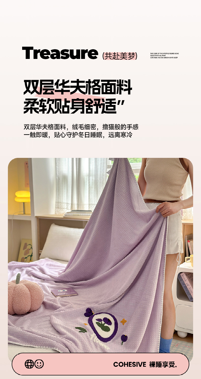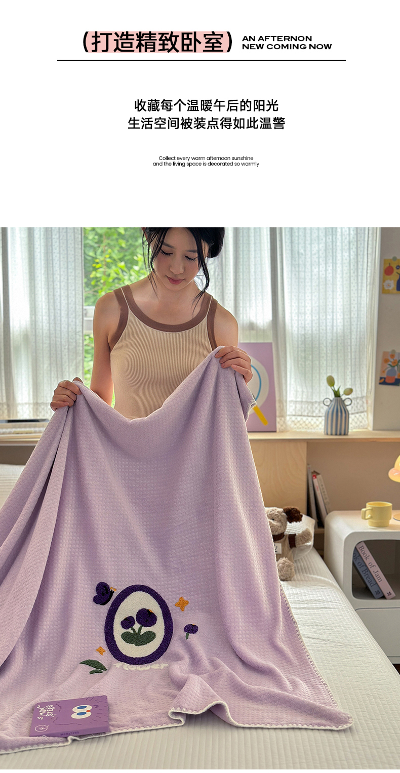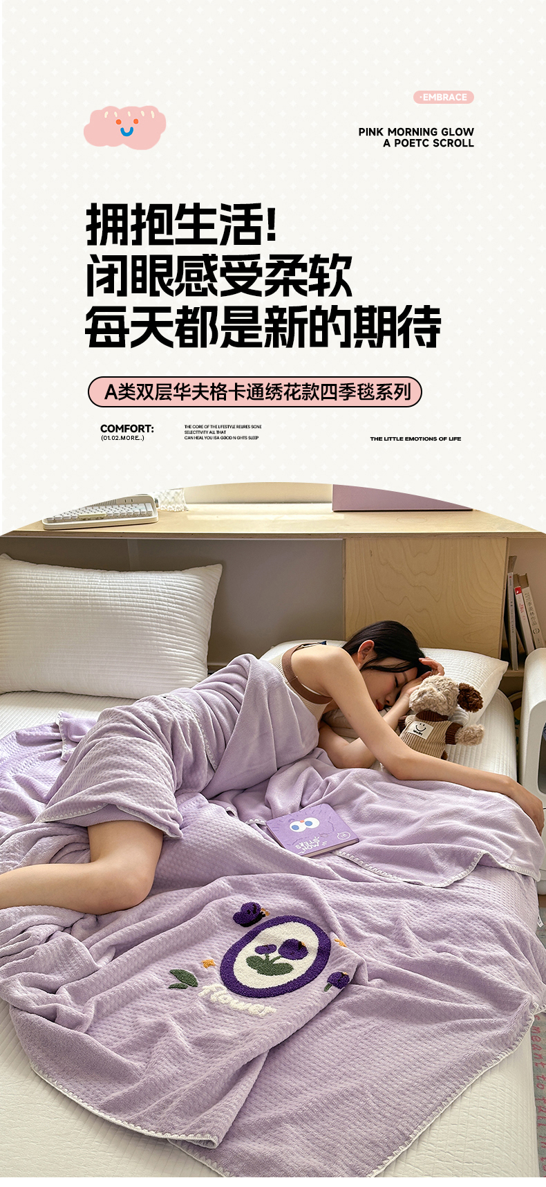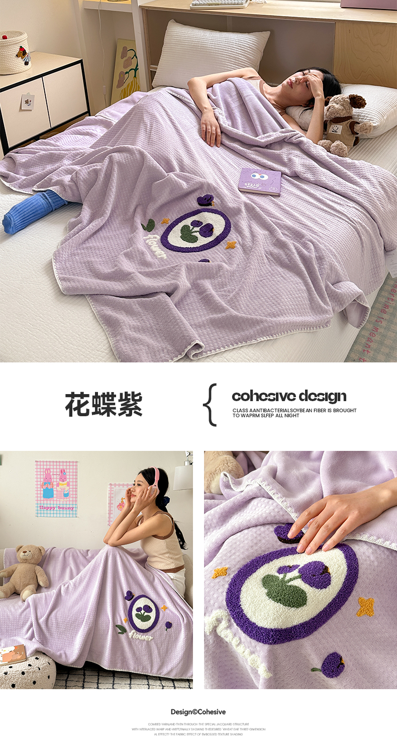 商品名称:艾佳2025新款卡通绣花款小华夫格毛毯毯子 华夫毯-花蝶紫