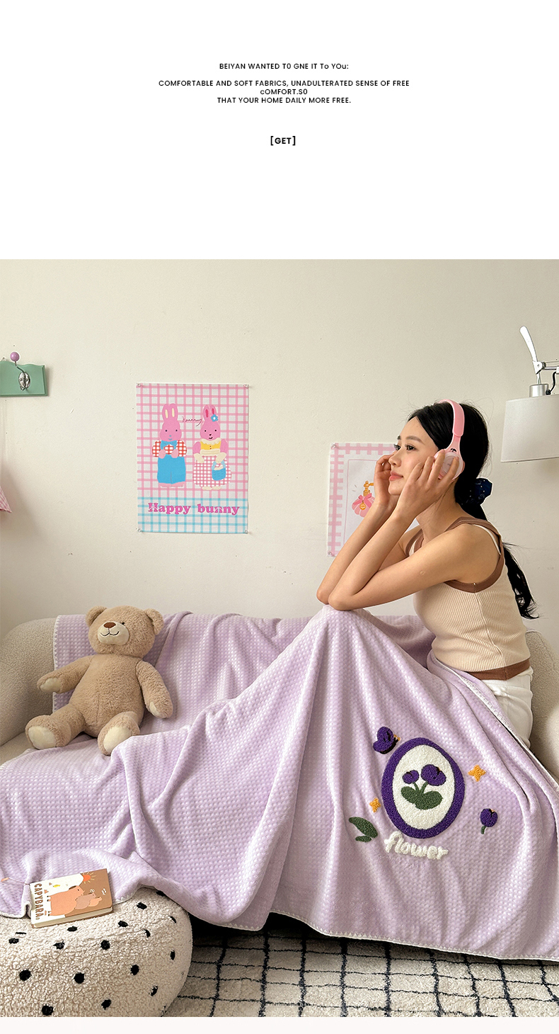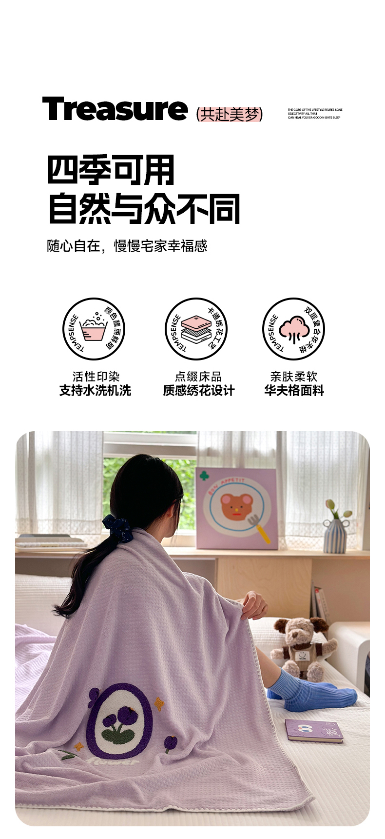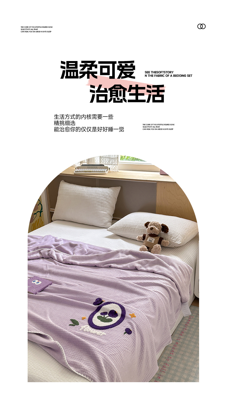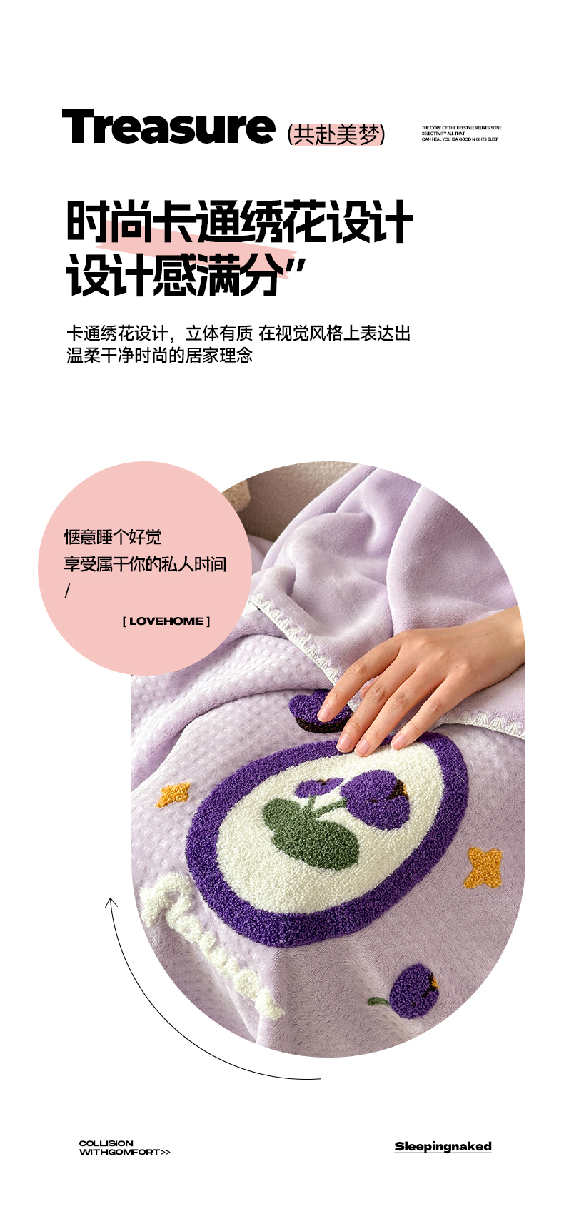 商品名称:艾佳2025新款卡通绣花款小华夫格毛毯毯子 华夫毯-花蝶紫