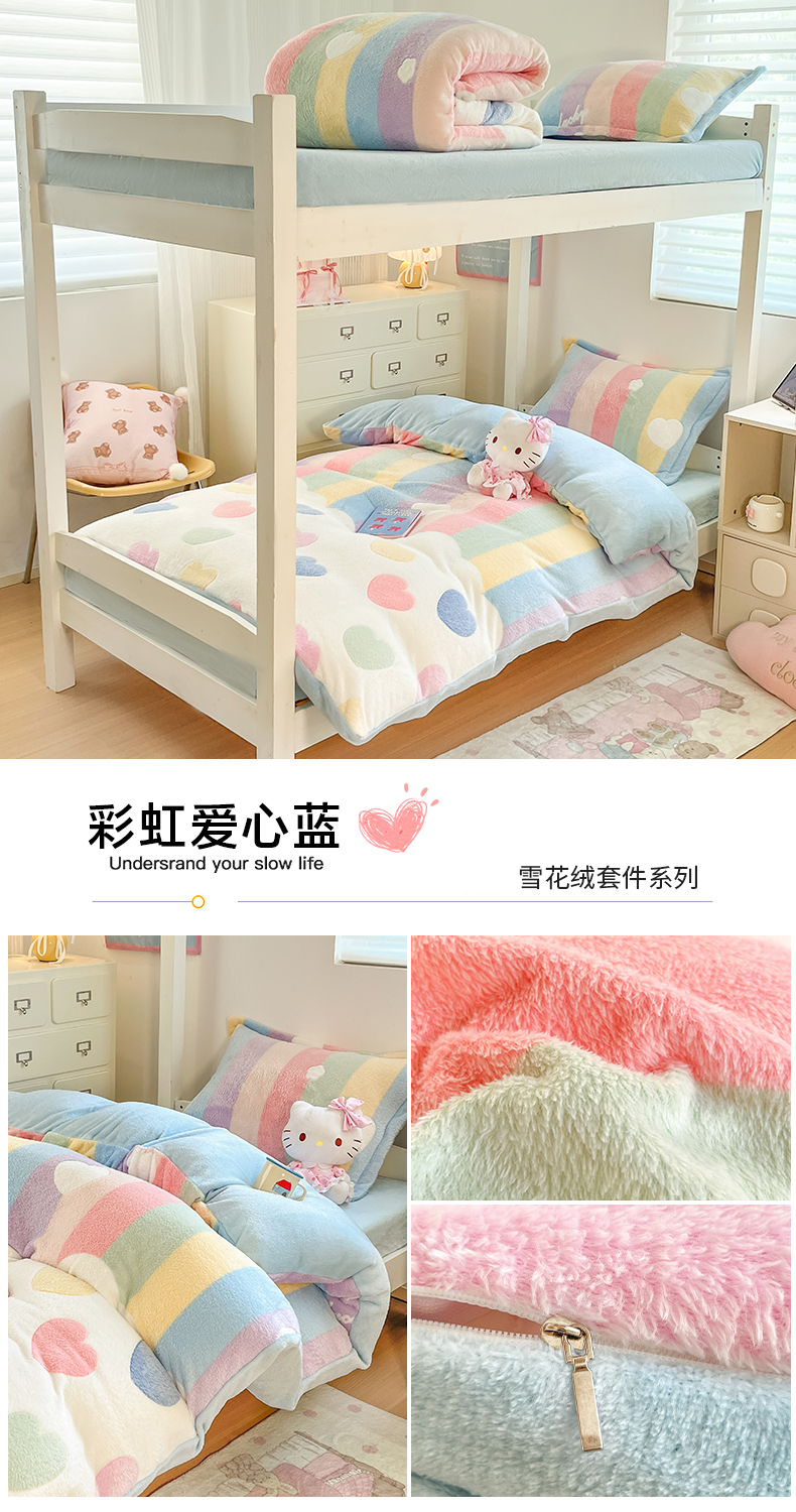 当前位置: 91家纺网 > 商品网购 > 床品套件 > 四件套 > 其它四件套 > 川悦生活 2025新款立体雪花绒印花四件套学生床系列一场景一 彩虹爱心蓝