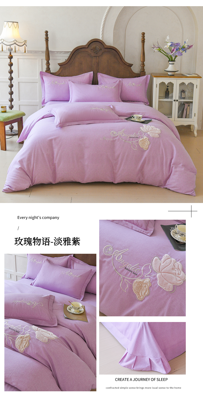 当前位置: 91家纺网 > 商品网购 > 床品套件 > 四件套 > 普通磨毛四件套 > U品汇 2025新品长绒棉加厚全棉纯棉磨毛立体刺绣花四件套生态磨毛加绒(玫瑰物语) 玫瑰物语-淡雅紫