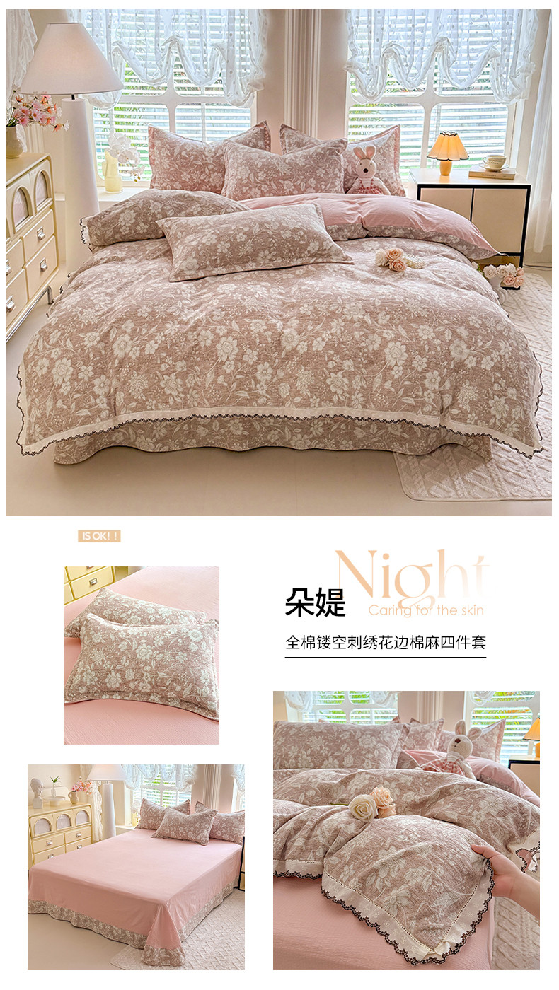 韩约家纺 2025新款1全棉镂空双色刺绣花边床单款加厚棉麻四件套 美伊