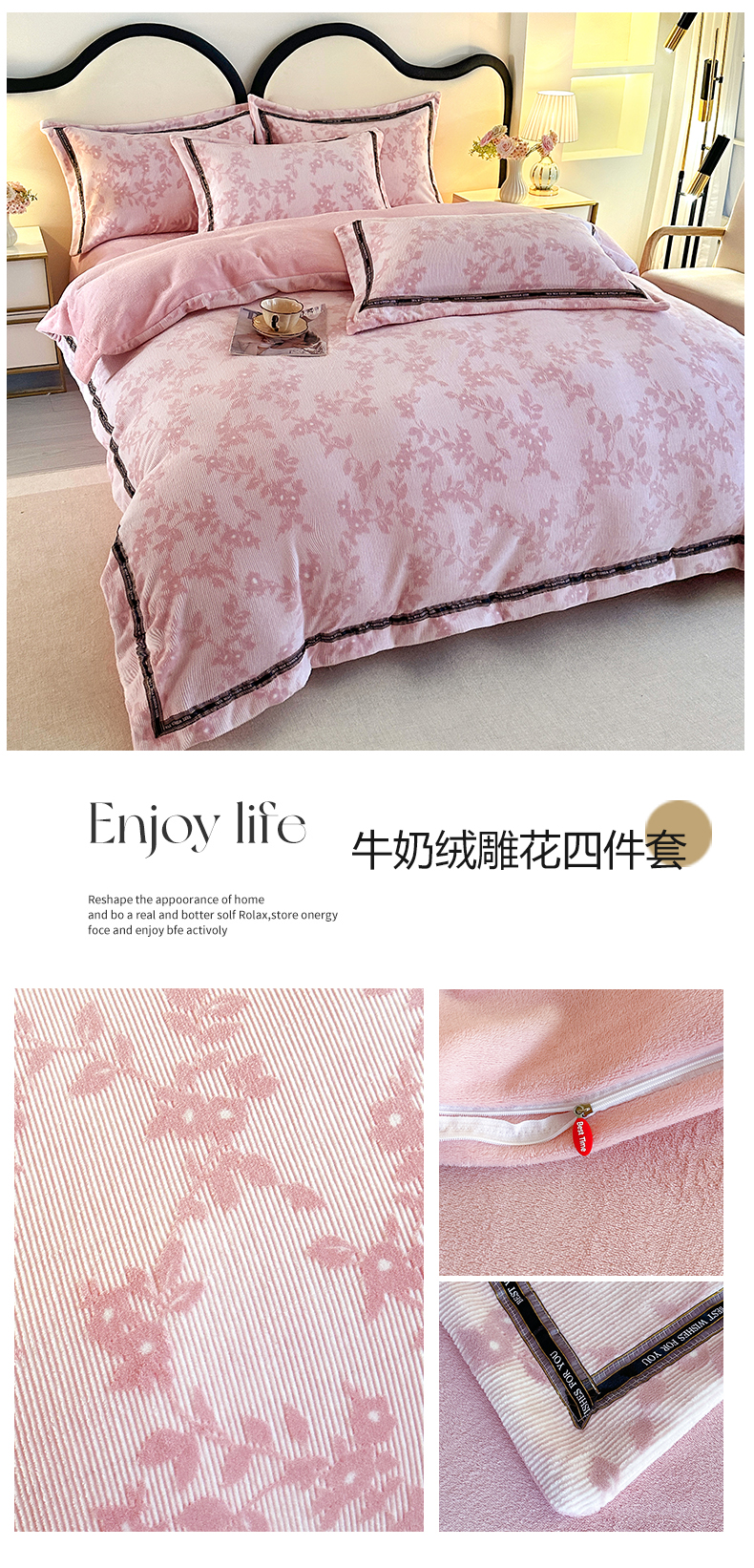 商品名称:爱洛 2025新款牛奶绒四件套牛奶绒雕花四件套纯色牛奶绒四件套 枫叶-粉