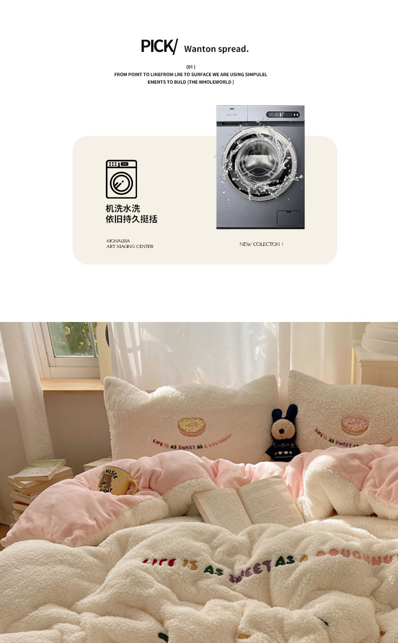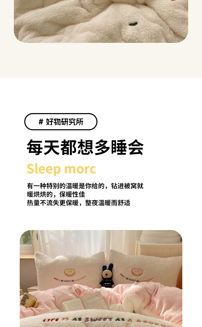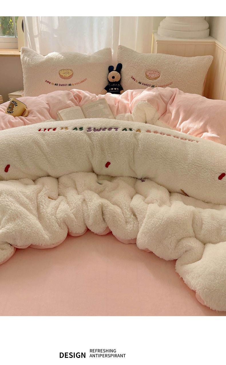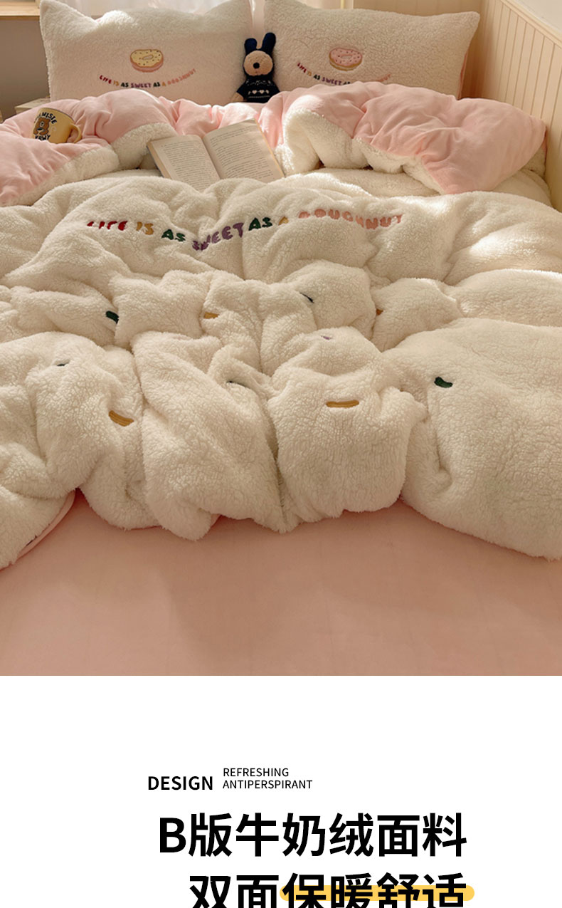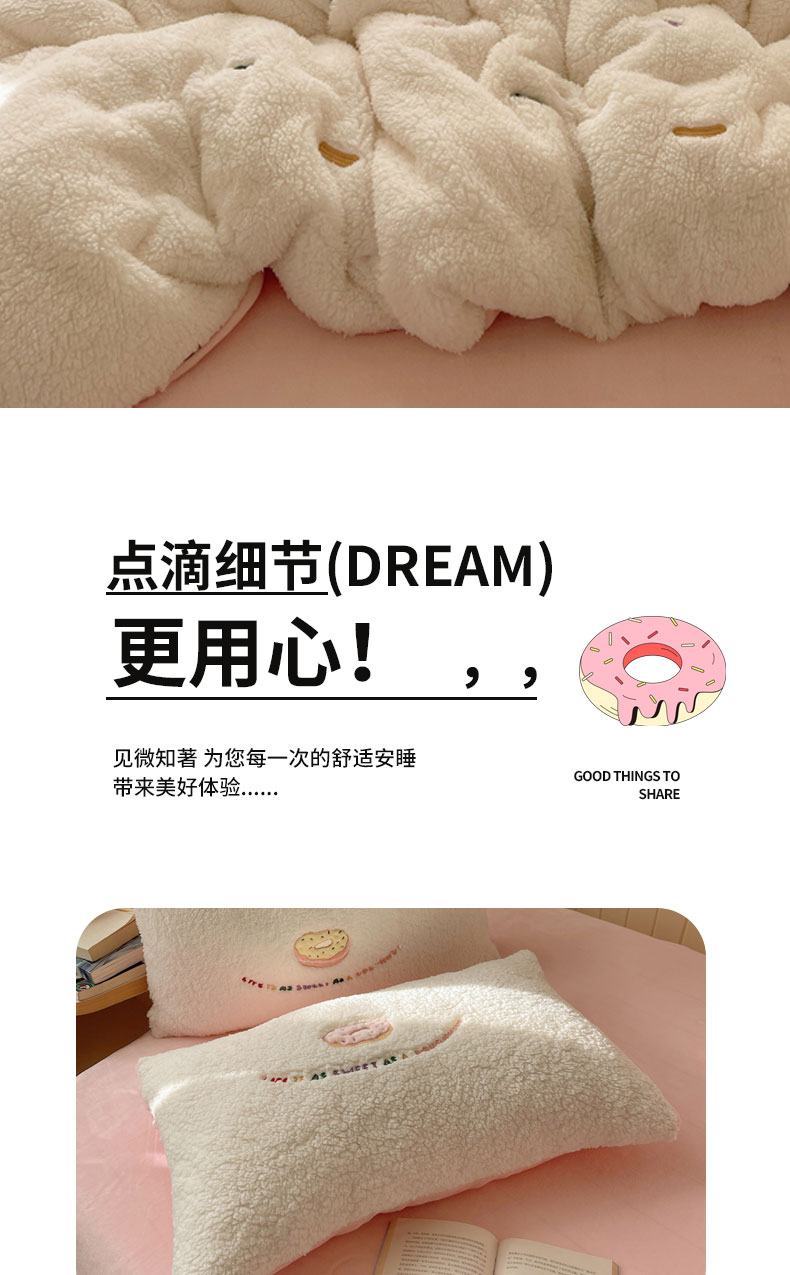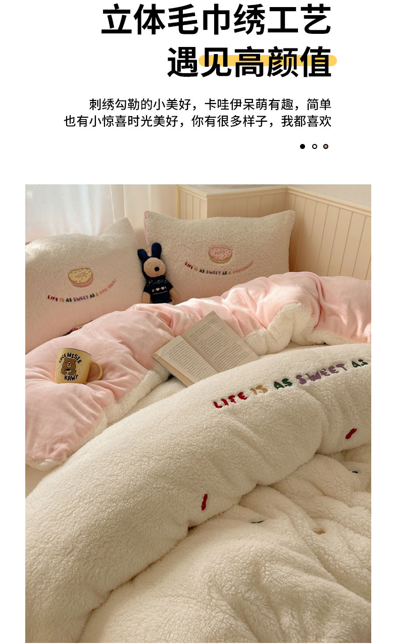 盼季家纺 2025新款小清新羊羔绒四件套加厚牛奶绒保暖床单被套宿舍三件套 羊羔绒甜甜圈-奶粉