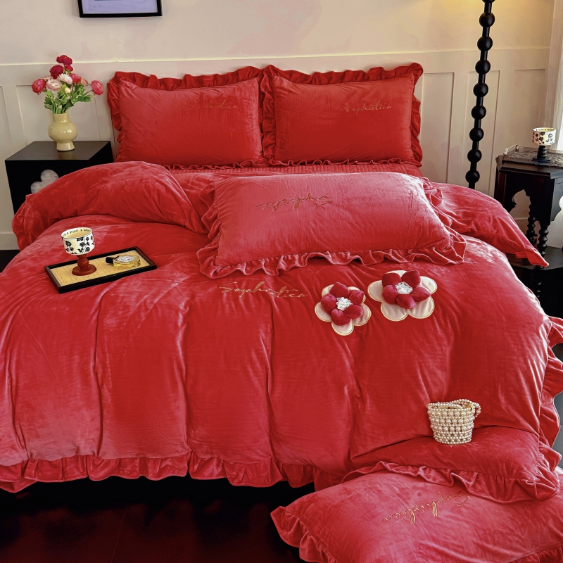 (总)恋尚羽家纺 2025新款韩版花边婴儿绒大床盖四件套宝宝绒婴肤绒公主风韩式盘花四件套,大红色,豆沙,湖蓝色,灰色,桔色,墨绿,紫色