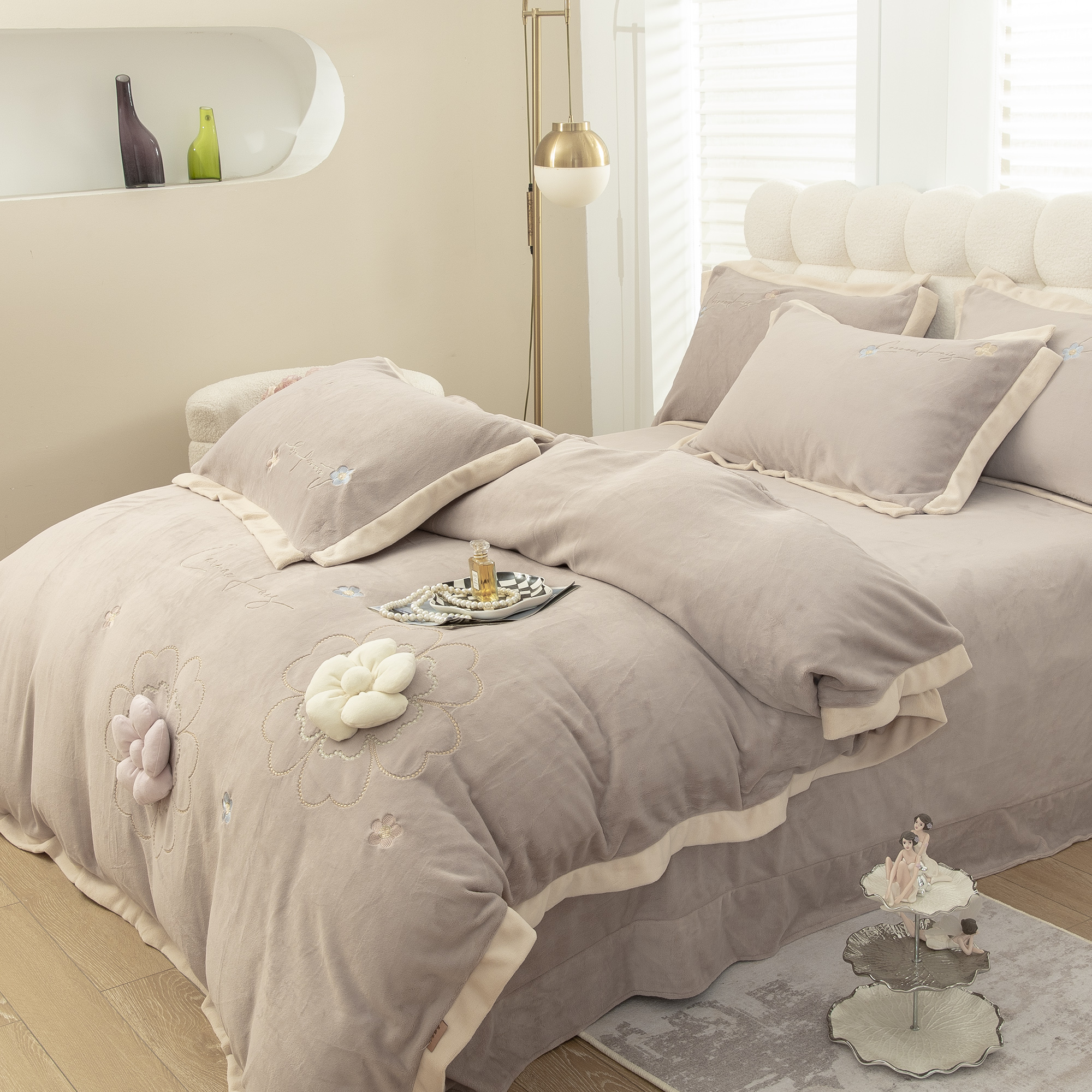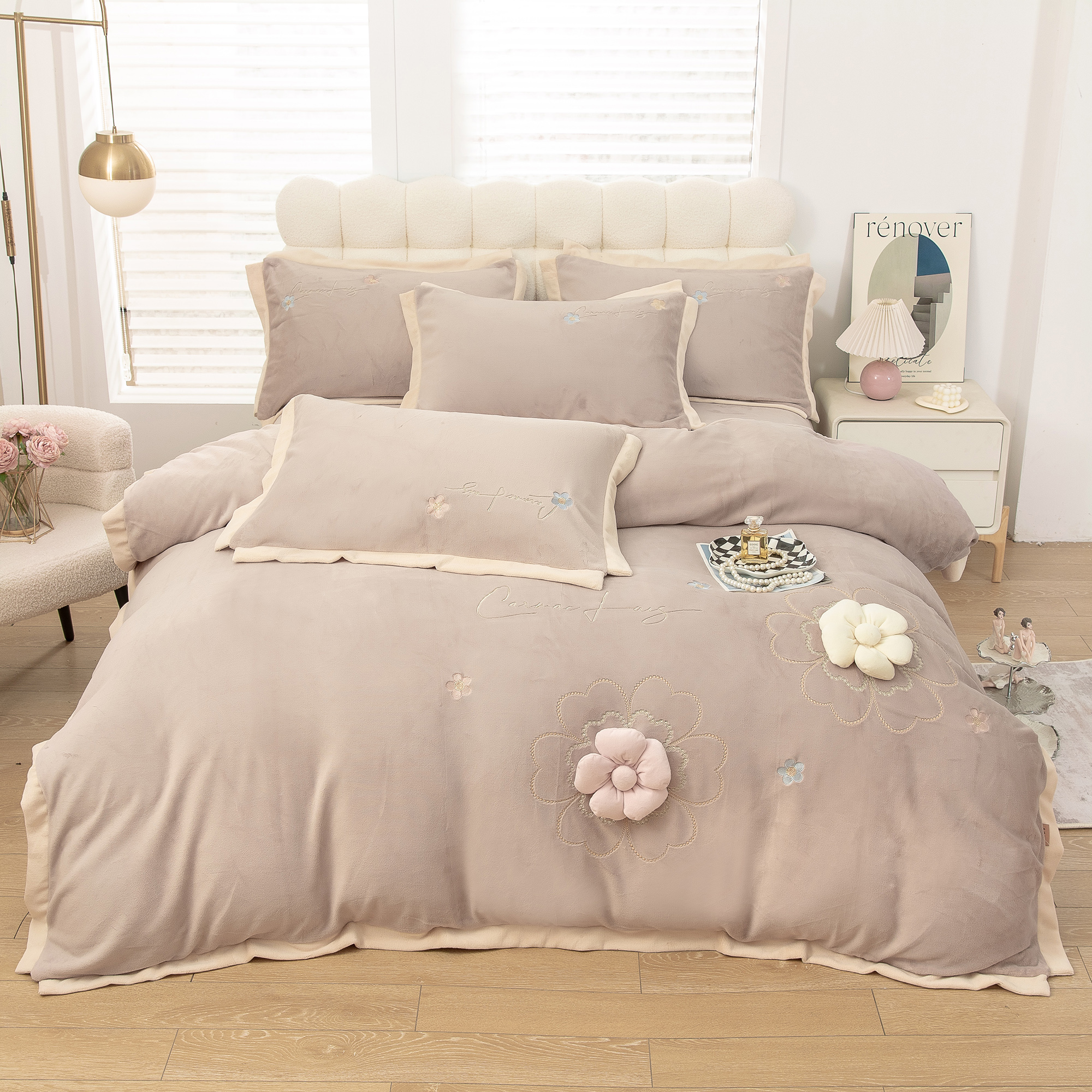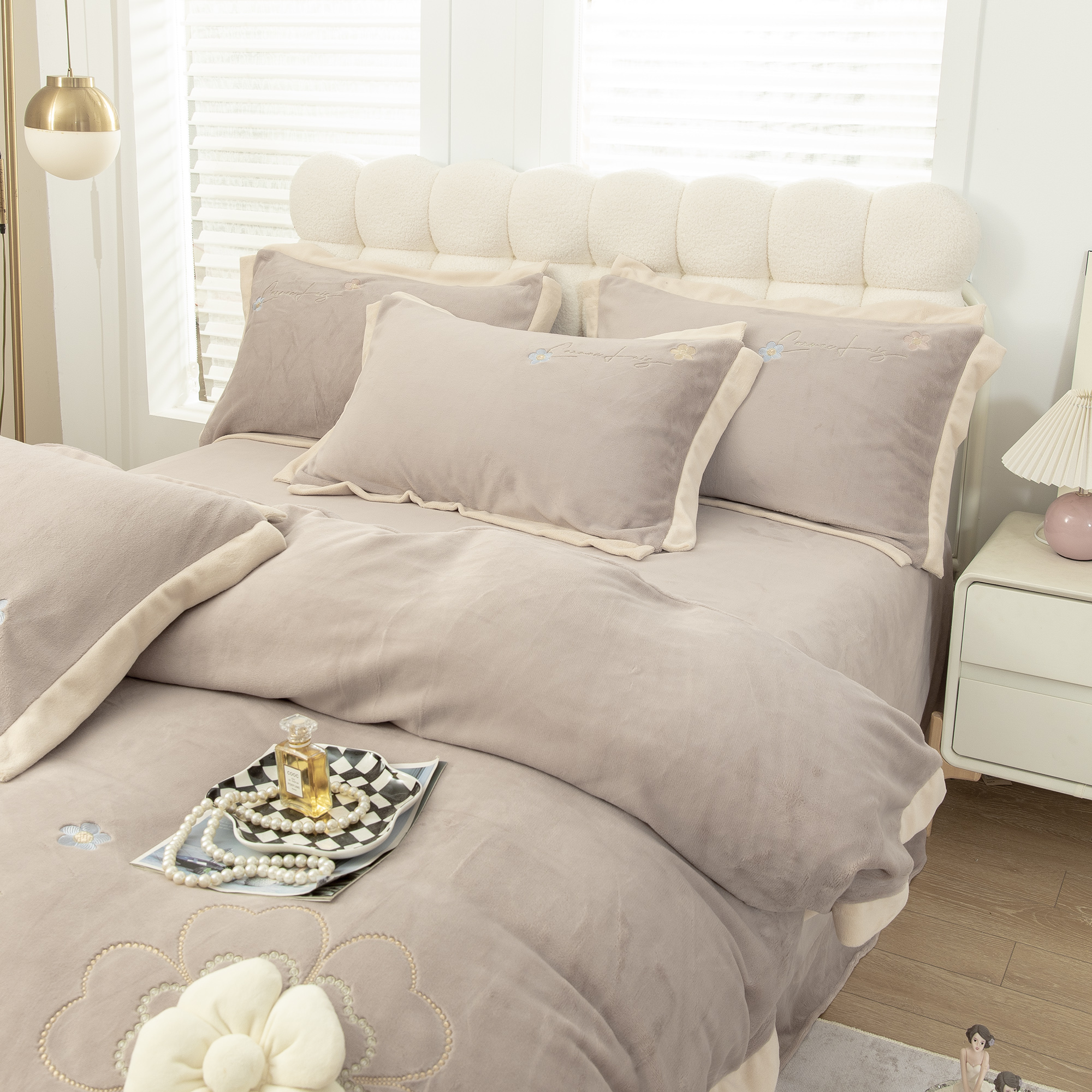 贝尔 2025新款纯色高克重牛奶绒刺绣四件套-羽魅 羽魅-豆沙,羽魅-豆沙